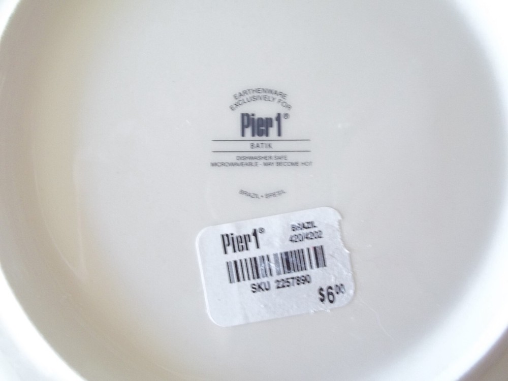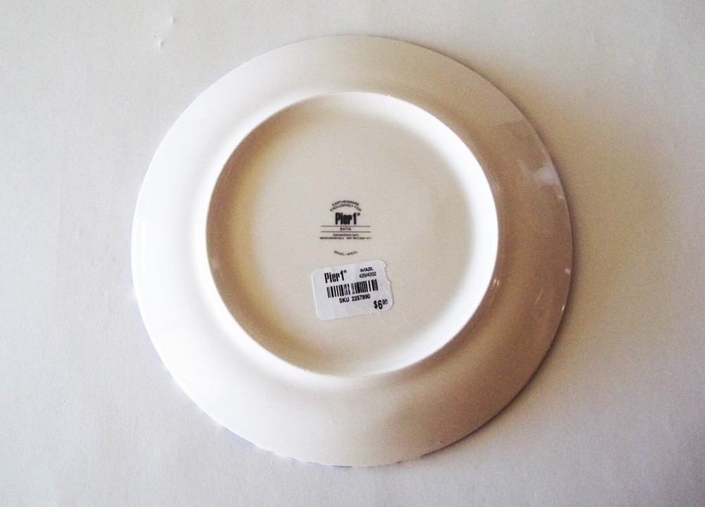 This is a decorative Pier 1 salad / luncheon plate in the blue and white Batik pattern. This design is from 2008 and has been discontinued. It measures approximately 8-1/4" in diameter. This plate is in fine condition, no chips, scratches, cracks, or crazing and still has the original paper label on the back. If you love Pier 1 Batik dinnerware, this plate displays very well and will make a fine addition to your dining table.