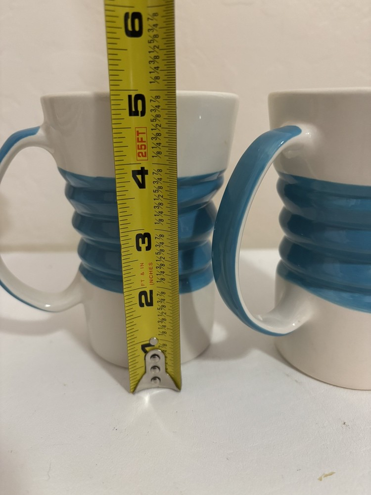 Pier 1 Blue & White Accordion Ribbed Design Stoneware Mug Coffee Tea Set 2