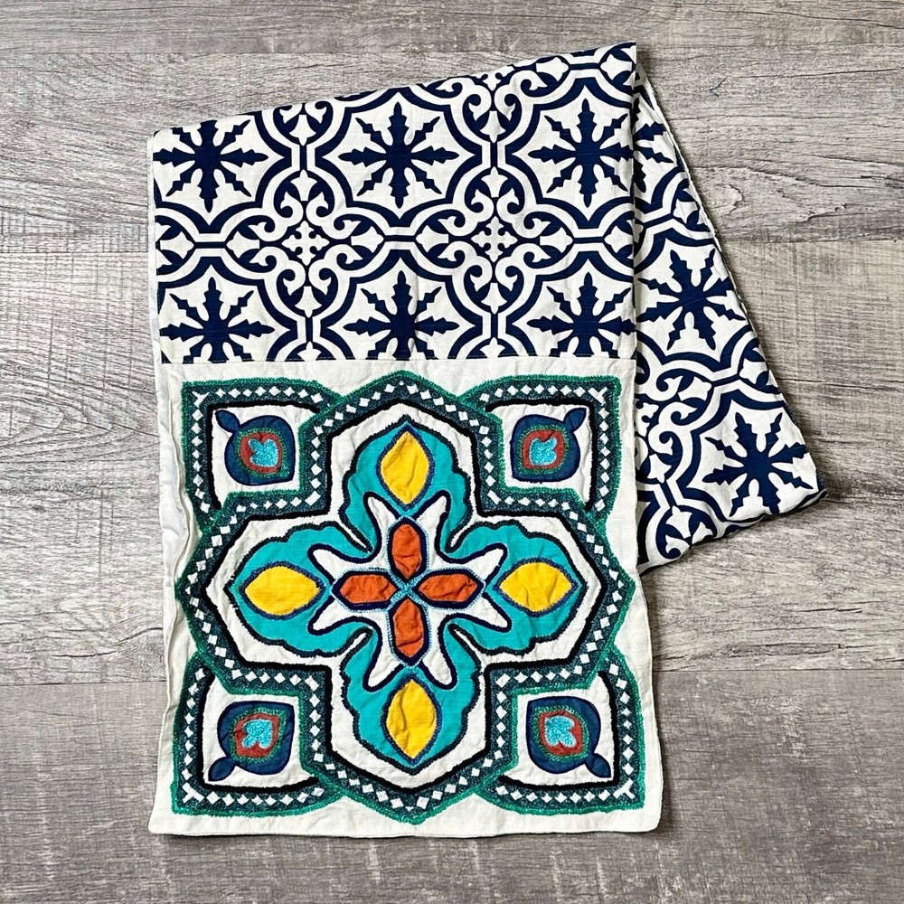 <![CDATA[<div>Pier 1 Imports Holiday Snowflake Geometric Table Runner Front 100% Cotton Back 100% Polyester Mixture of Print & Embroidery Snowflake Print Main Part of Runner End Accents Geometric Southwest Design Made in India No Tag Attached, but last photo shows a tag from the exact same runner for reference. Approximate Measurements Lying Flat: Width 13” Length 70” Condition: Good, pre-owned. No holes. Some staining in back of runner. None visible in front. Refer to photos. 1898-9-1