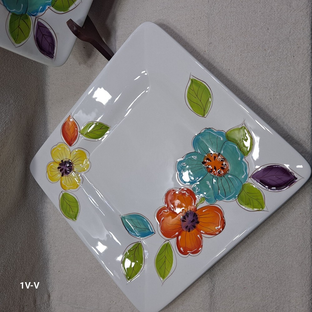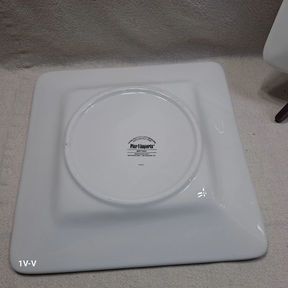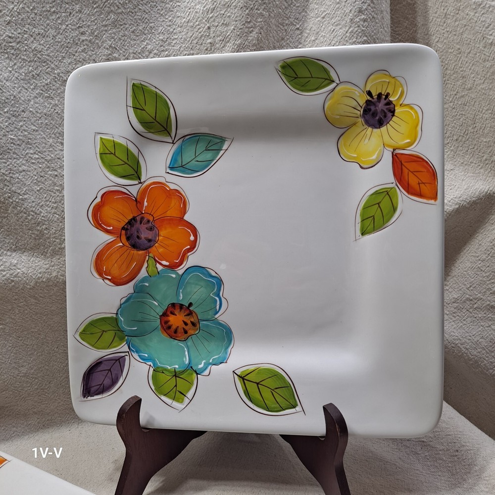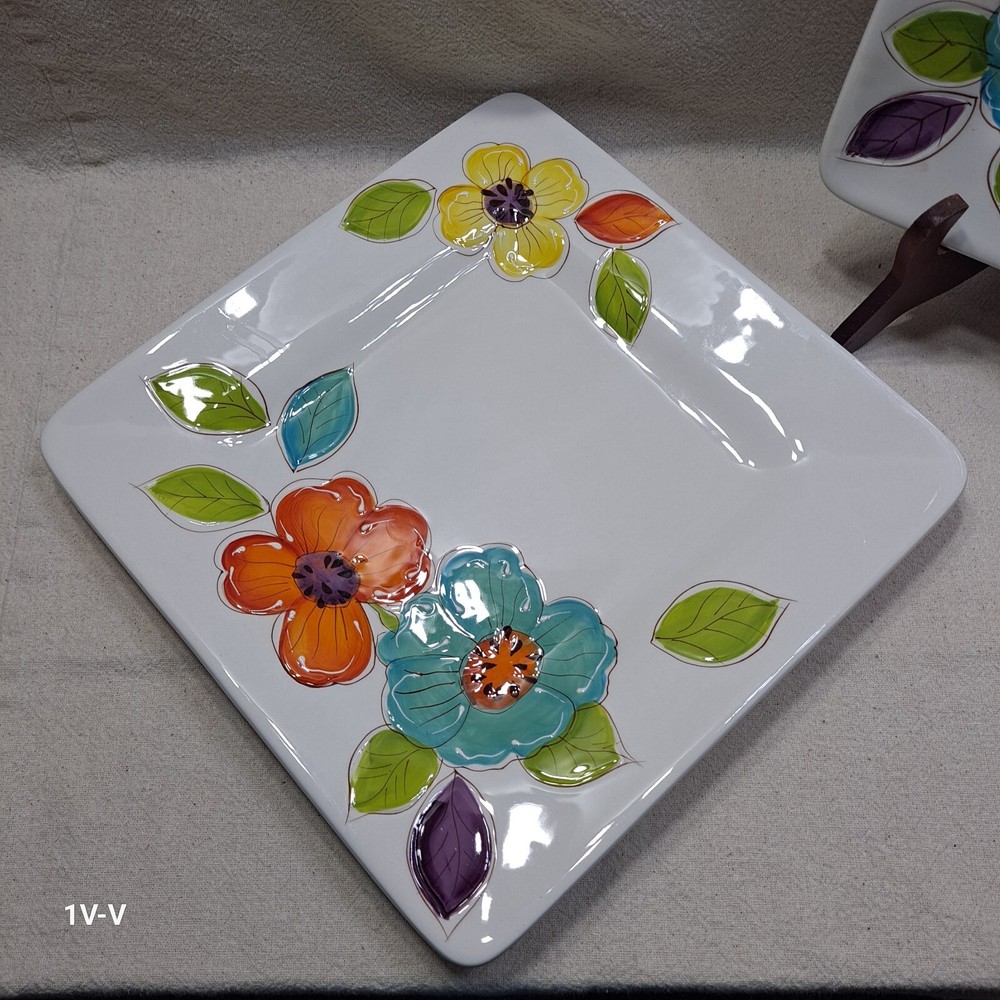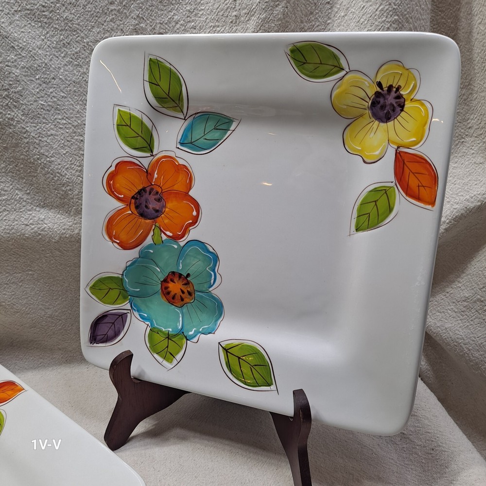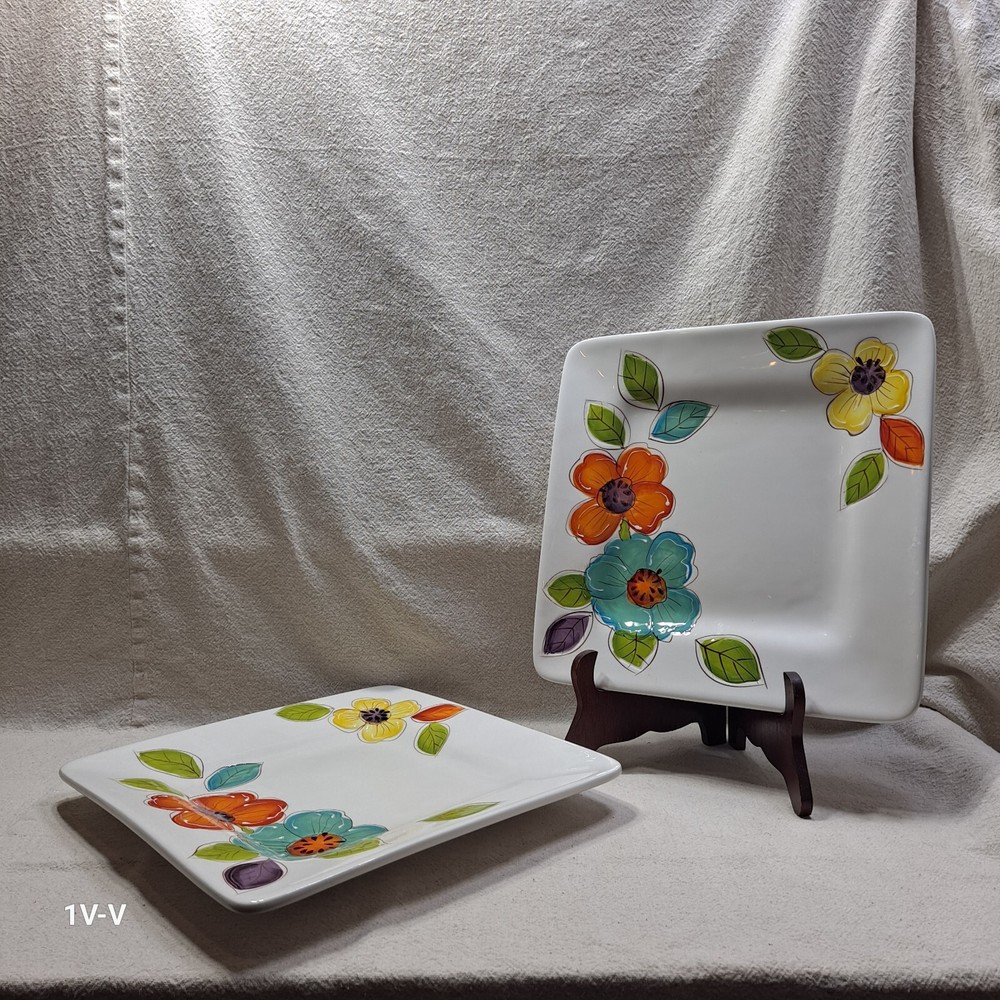 This is a set of two Pier 1 Brittany square earthenware dinner plates featuring a colorful flower pattern. The plates are made in China and have a printed backstamp. They are part of the 2010-2019 production style and are suitable for all occasions. They were discontinued in 2012. The brand of the plates is Pier 1. No chips, breaks, or repairs Please review all photos closely before purchasing to ensure desired quality and condition. Feel free to contact me with any questions or requests for more photos. Your interest and feedback are greatly appreciated. Similar items are available. Purchasing from this store will benefit a disabled veteran and his family.