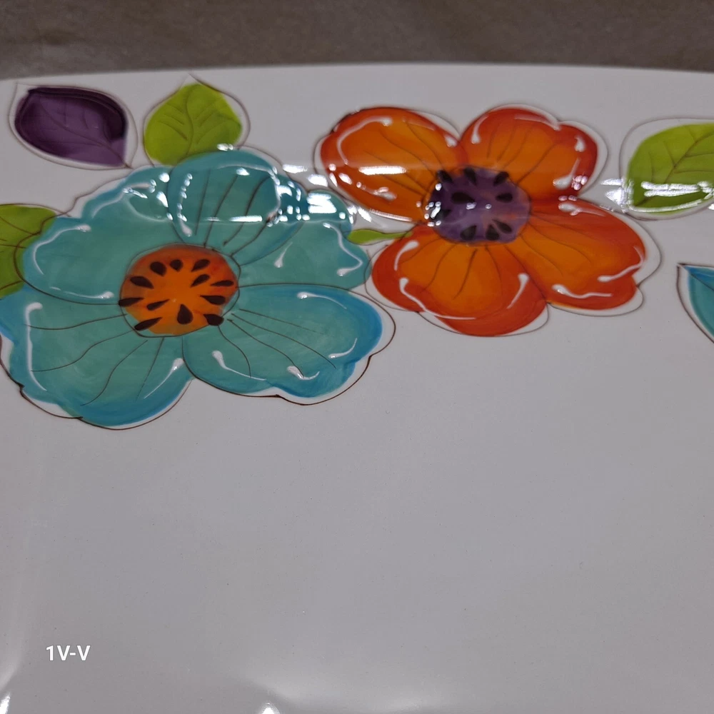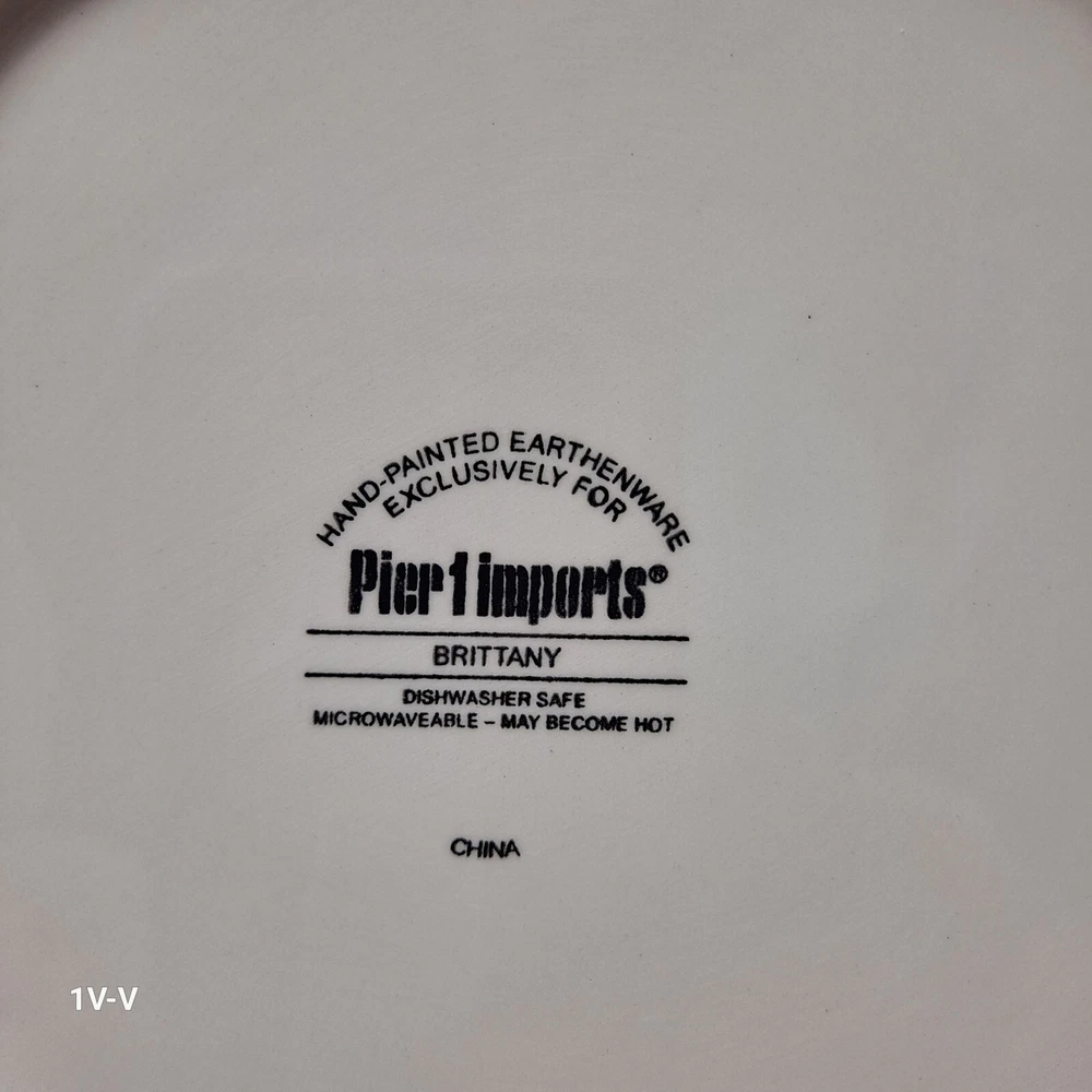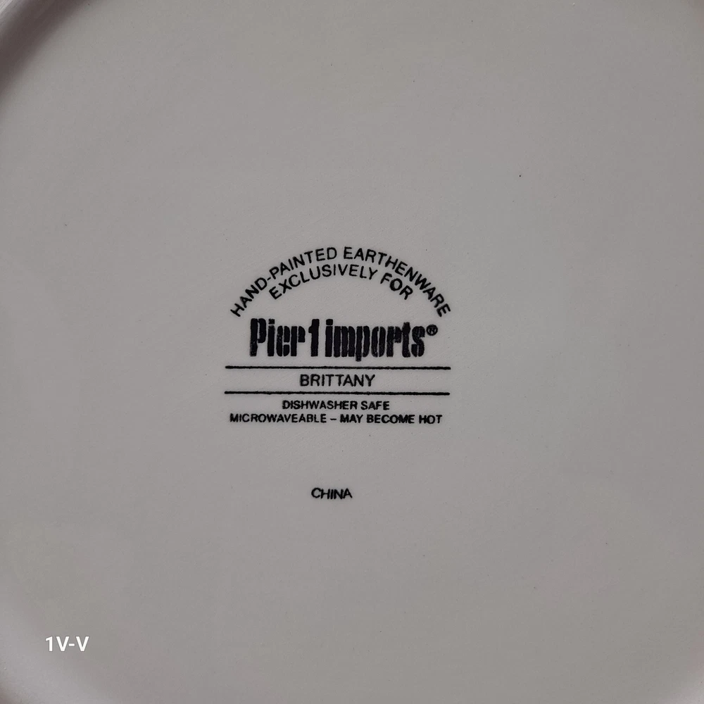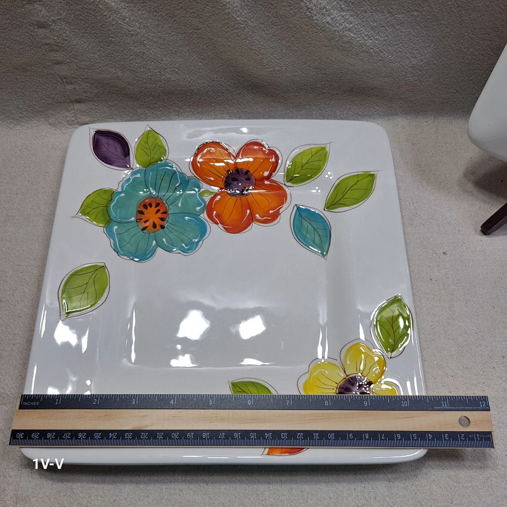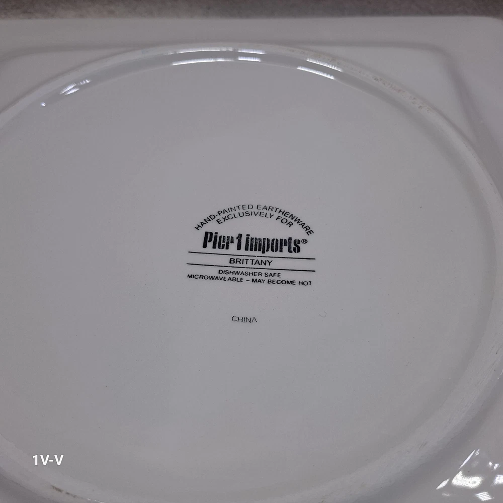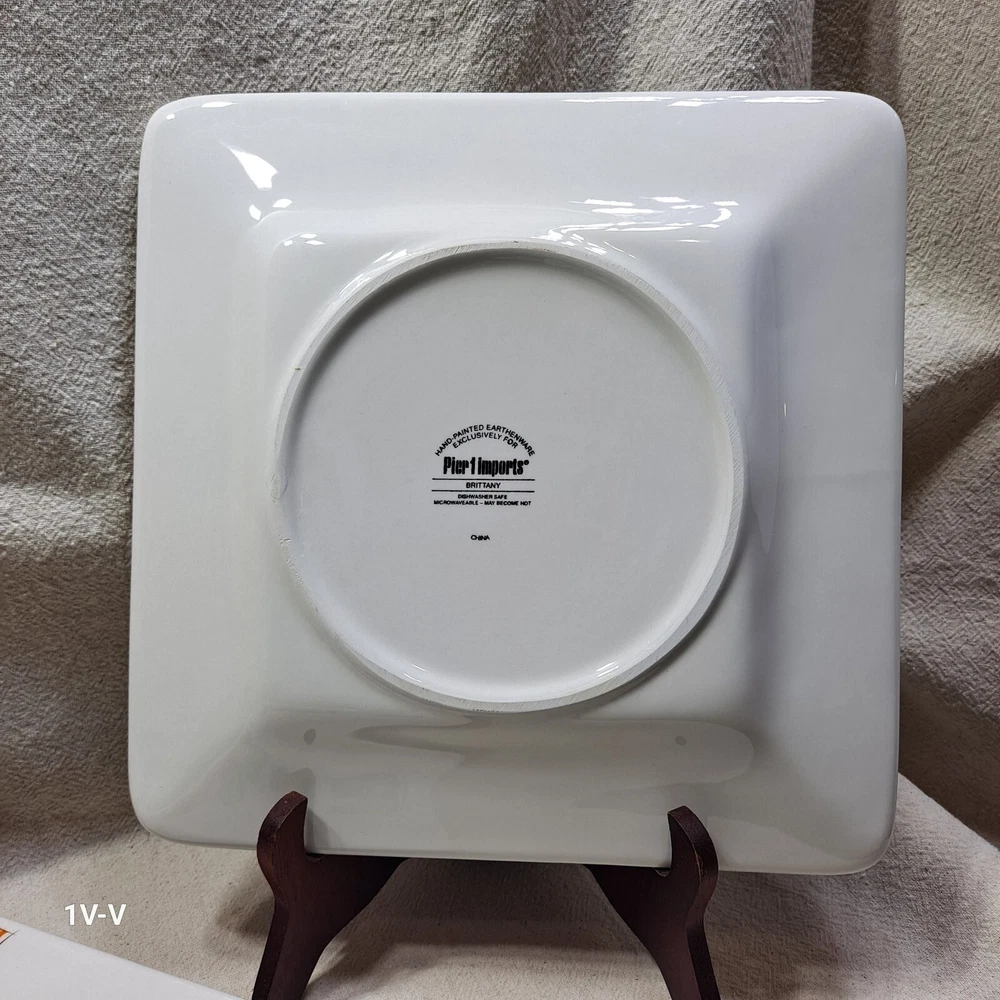 This is a set of two Pier 1 Brittany square earthenware dinner plates featuring a colorful flower pattern. The plates are made in China and have a printed backstamp. They are part of the 2010-2019 production style and are suitable for all occasions. They were discontinued in 2012. The brand of the plates is Pier 1. No chips, breaks, or repairs Please review all photos closely before purchasing to ensure desired quality and condition. Feel free to contact me with any questions or requests for more photos. Your interest and feedback are greatly appreciated. Similar items are available. Purchasing from this store will benefit a disabled veteran and his family.