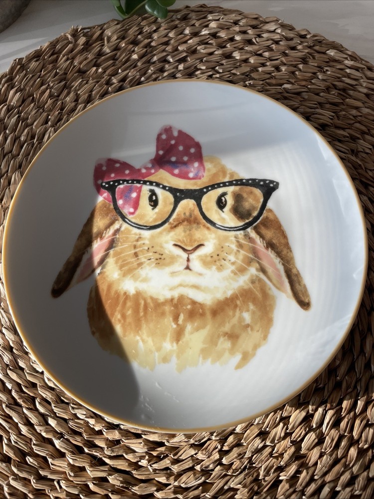 The Pier 1 Bunny Faces 8” Salad Luncheon Plate is a festive and charming addition to any Easter table setting. Made of porcelain with a glossy finish, this round plate features cute rabbit faces in yellow, perfect for serving salads or lunches. The set includes one salad plate with a diameter of 8 inches, making it ideal for entertaining guests or everyday use. The plate is printed with a brand backstamp and is not handmade, adding to its versatility and ease of care.