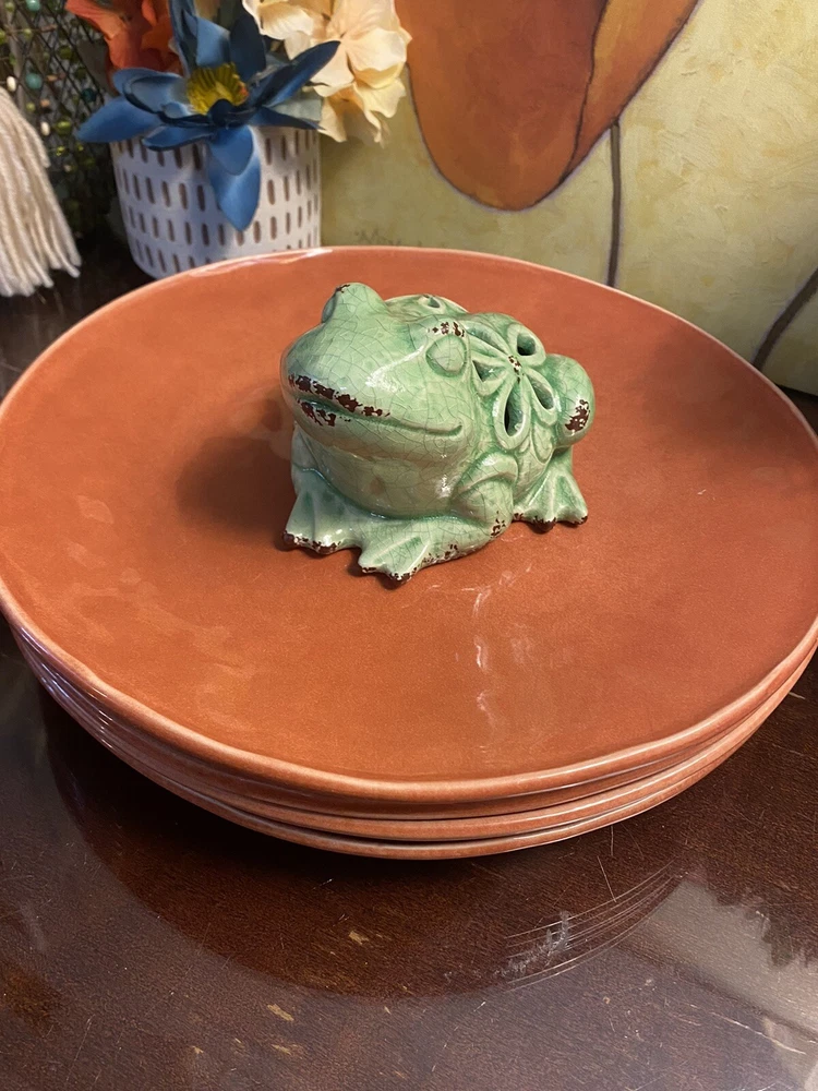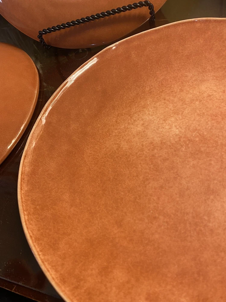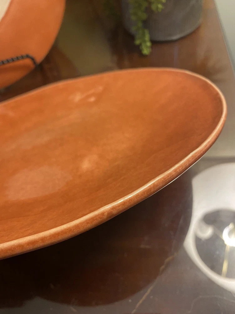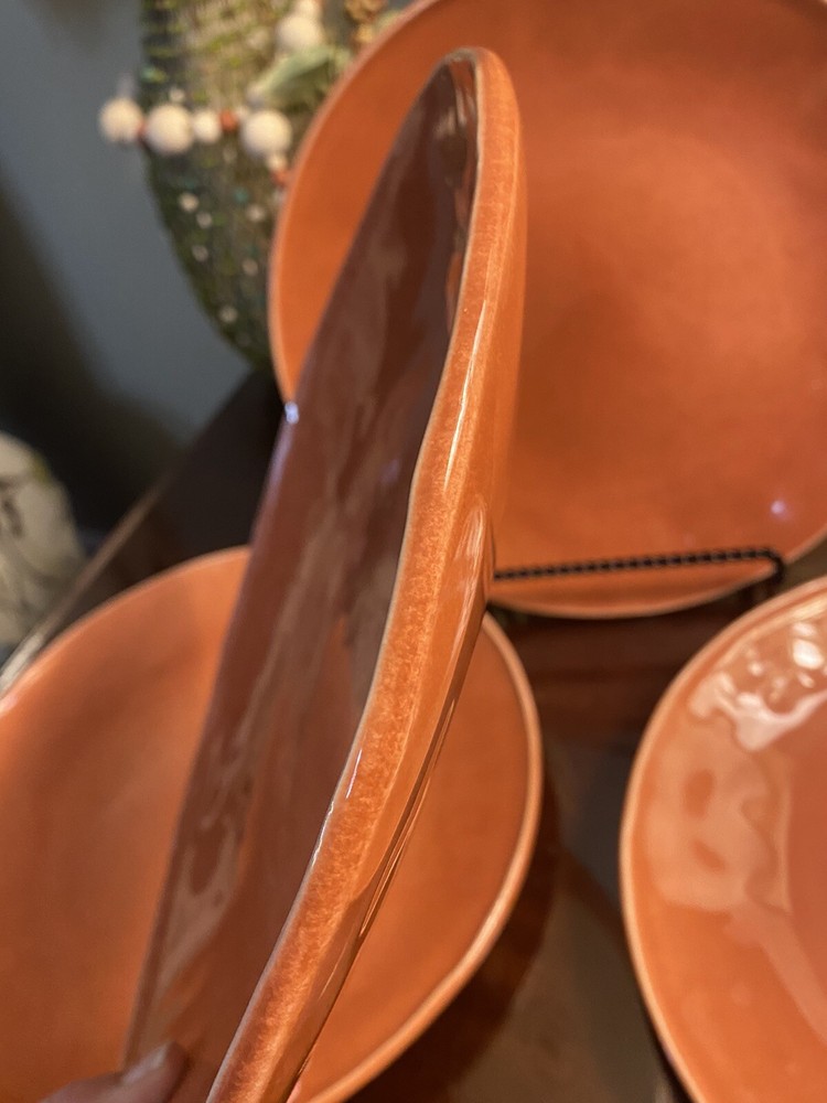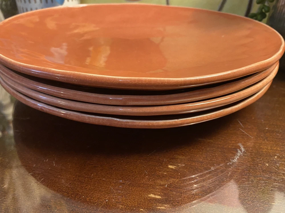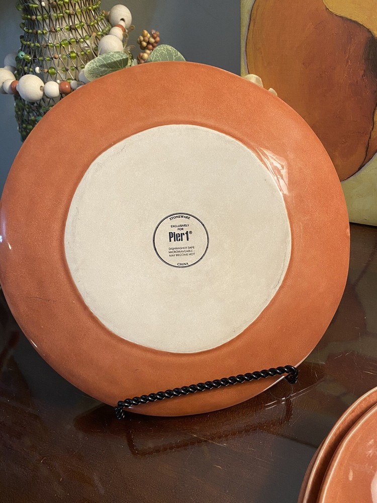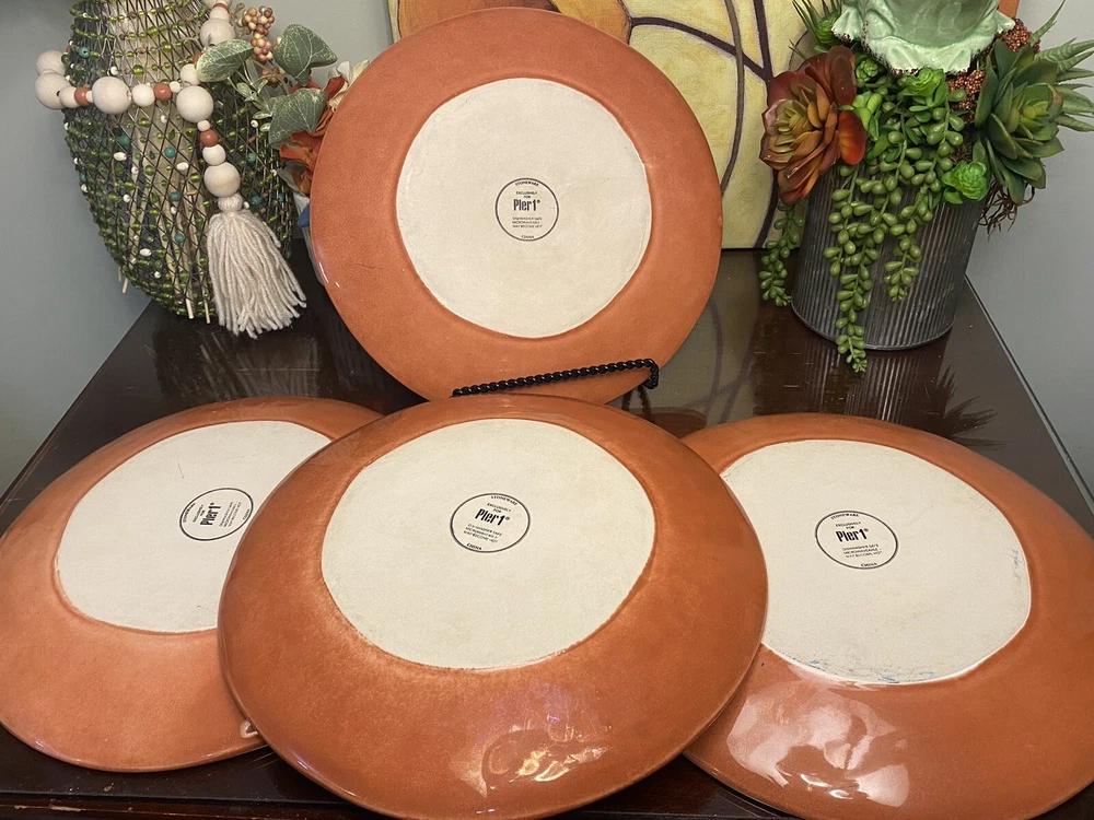 Elevate your dining experience with this set of four Pier 1 burnt orange 11-inch stoneware plates. The unique wavy rim adds a touch of warm elegance to the round plates, making them suitable for any occasion. The glossy finish enhances the plate's durability and ease of cleaning, while the burnt orange color adds a pop of vibrancy to your table setting. Each plate is carefully crafted in China and features a printed backstamp authenticating the product. Whether you're hosting a dinner party or enjoying a family meal, these plates are sure to impress your guests. Add this beautiful set to your collection today and enjoy the perfect blend of style and functionality.