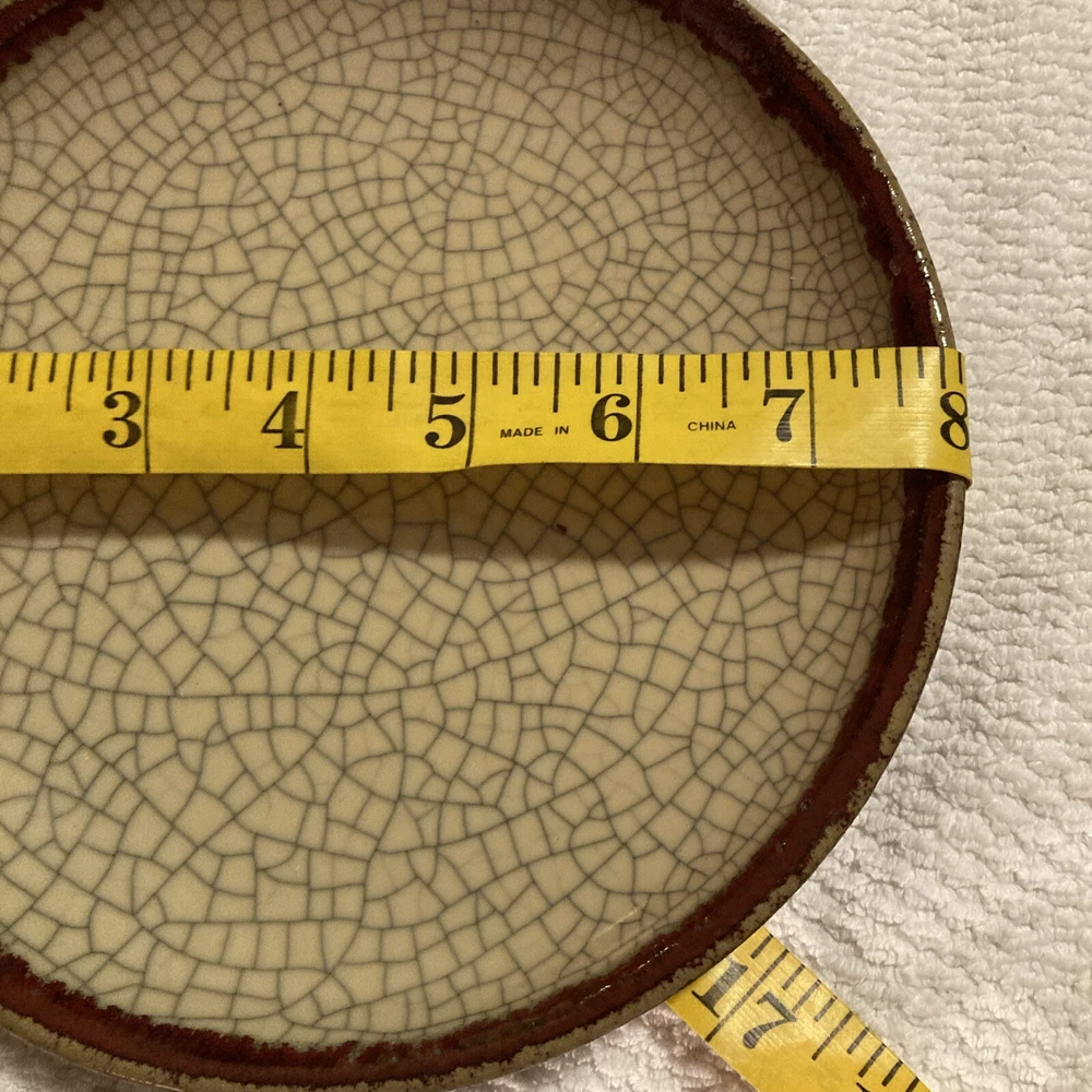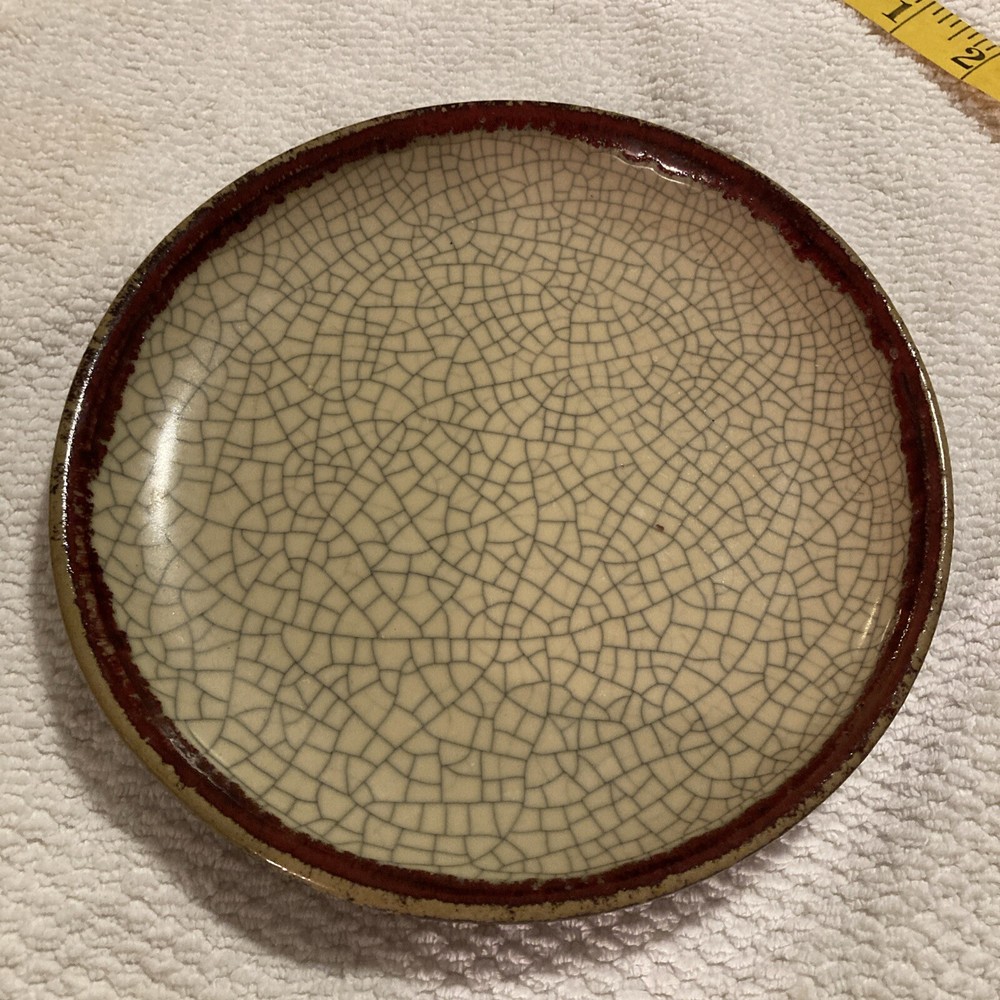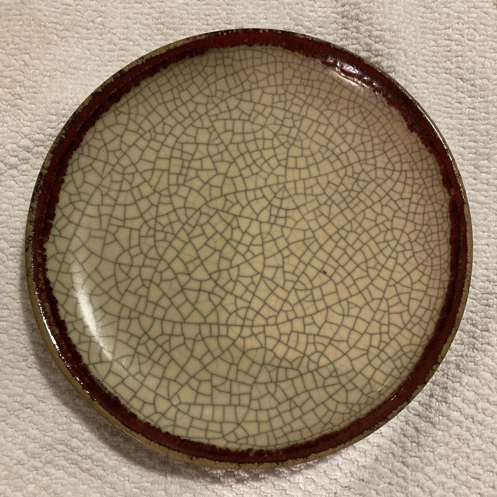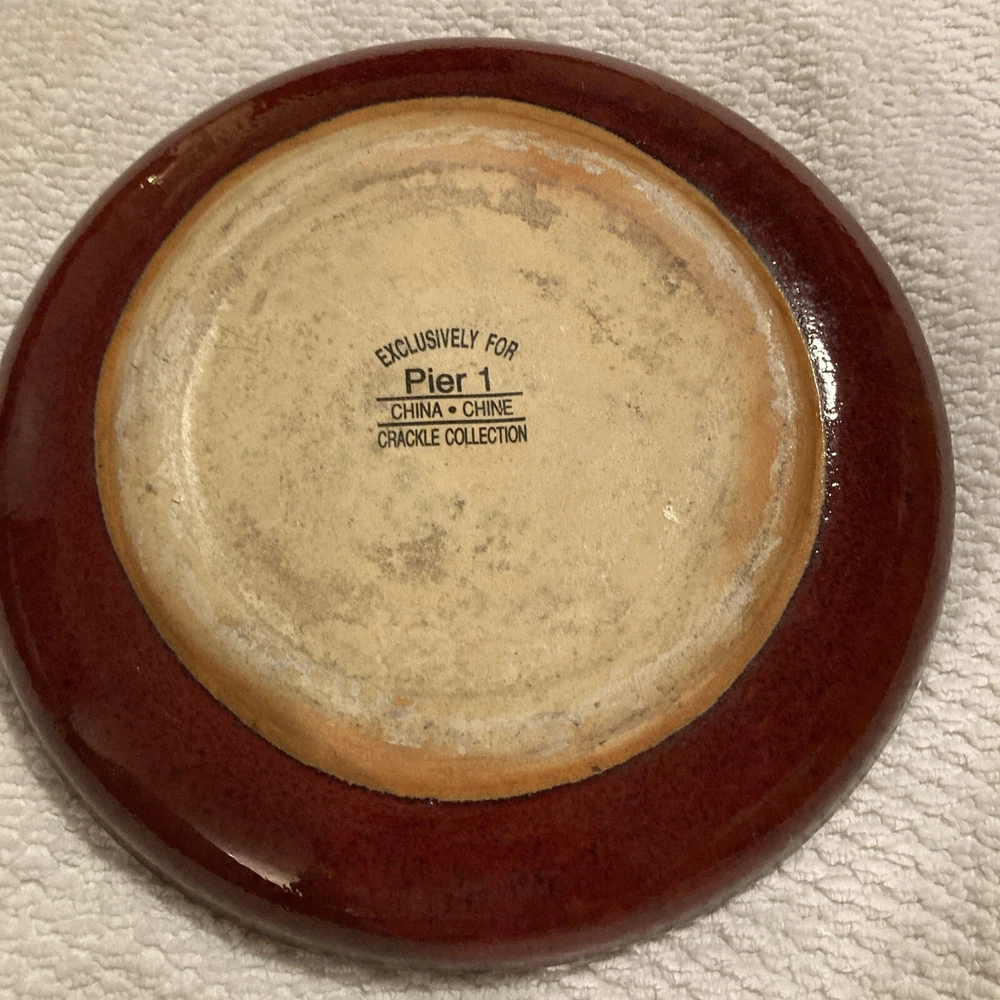 Add some rustic charm to your dinnerware collection with this Pier 1 plate from the Crackle Collection. The plate features a round shape with an 8" diameter and a brick red trim on a khaki base. The plate has a crazed crackling look that gives it an antique appeal. It is made of stoneware and is dishwasher safe, although hand wash is recommended for its longevity. This plate is perfect for all occasions and can be used as a salad plate.
