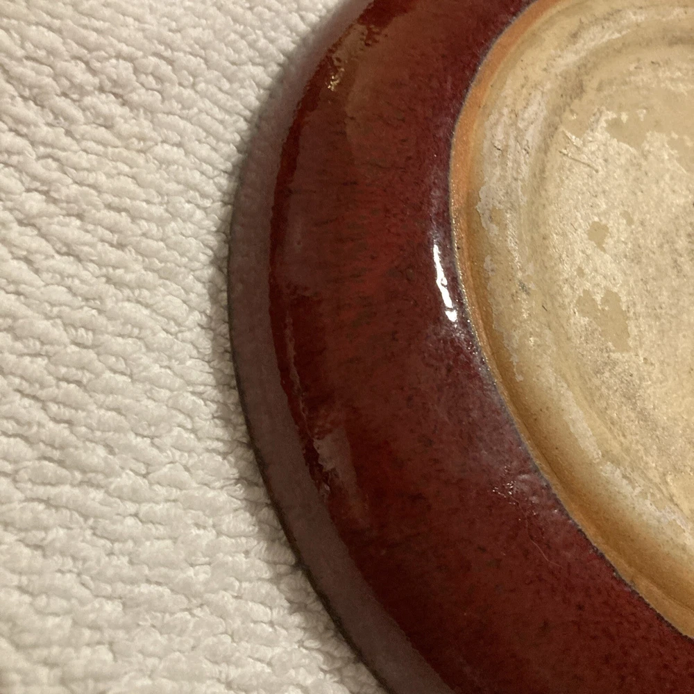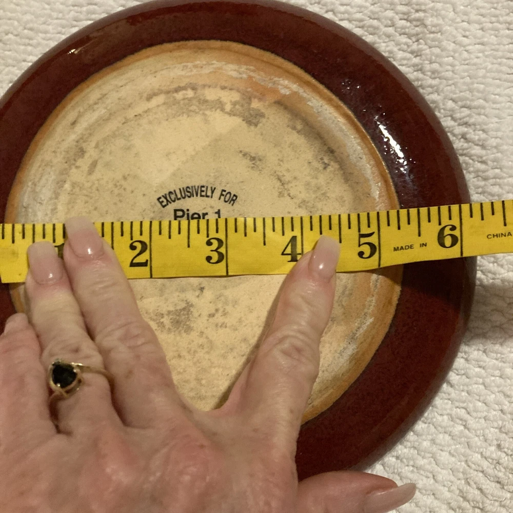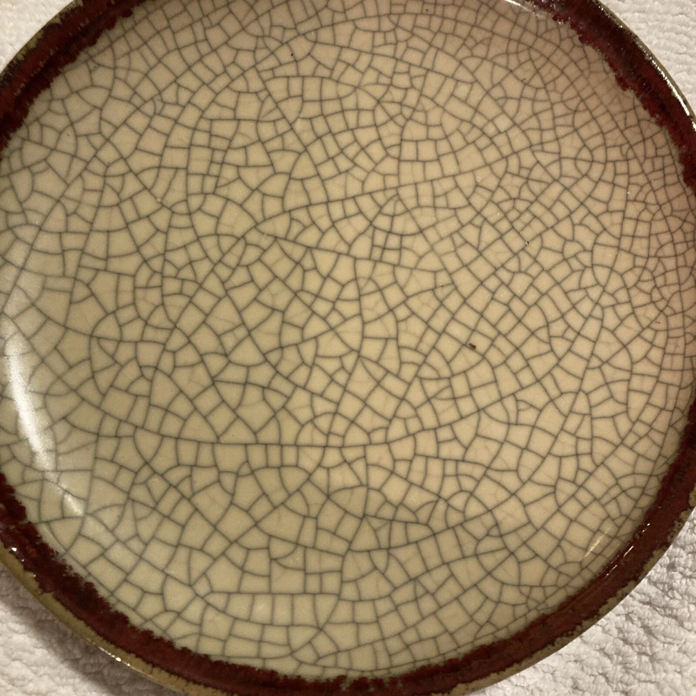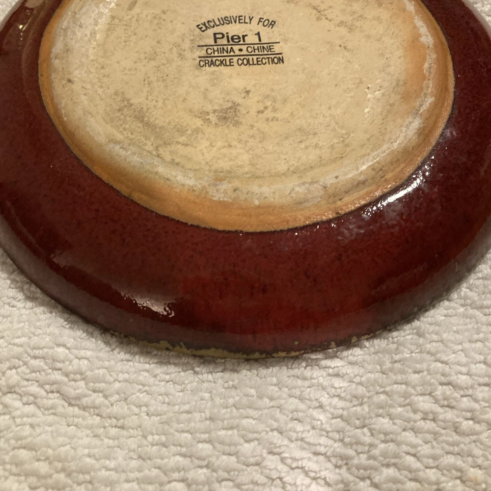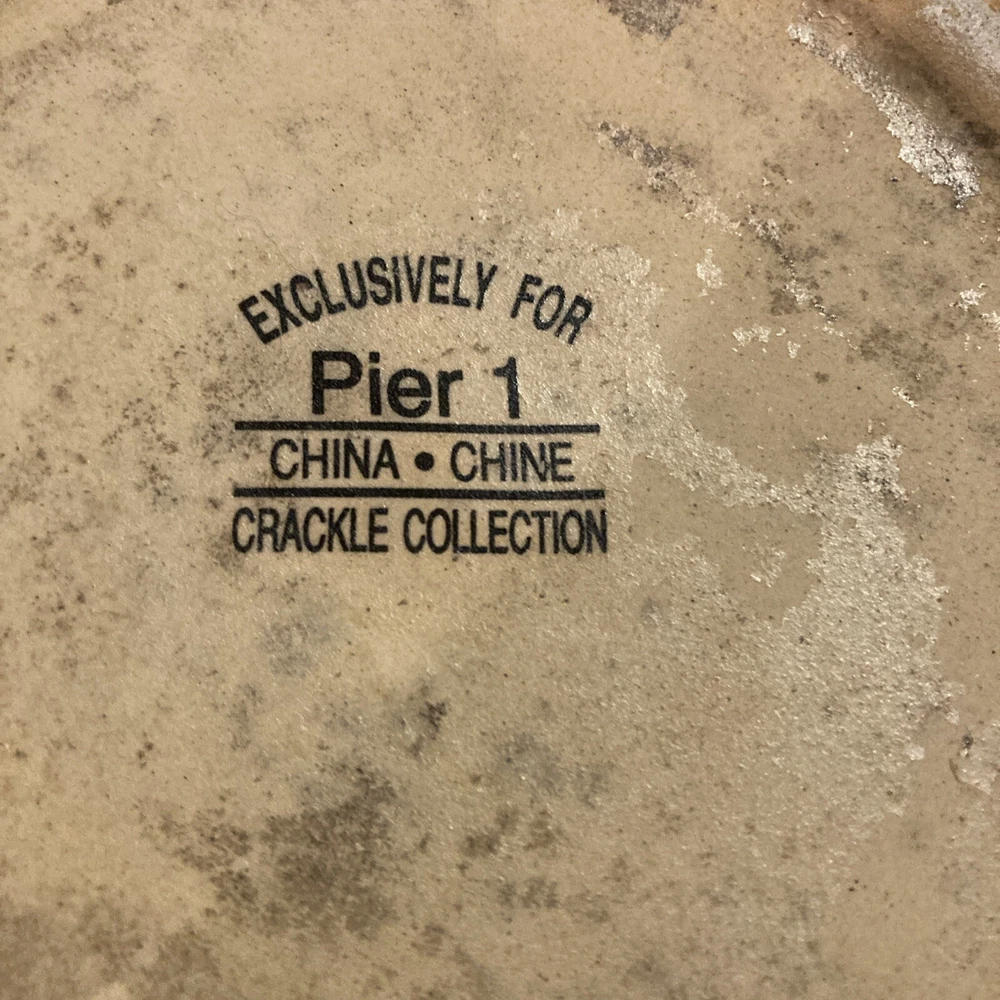 Add some rustic charm to your dinnerware collection with this Pier 1 plate from the Crackle Collection. The plate features a round shape with an 8" diameter and a brick red trim on a khaki base. The plate has a crazed crackling look that gives it an antique appeal. It is made of stoneware and is dishwasher safe, although hand wash is recommended for its longevity. This plate is perfect for all occasions and can be used as a salad plate.