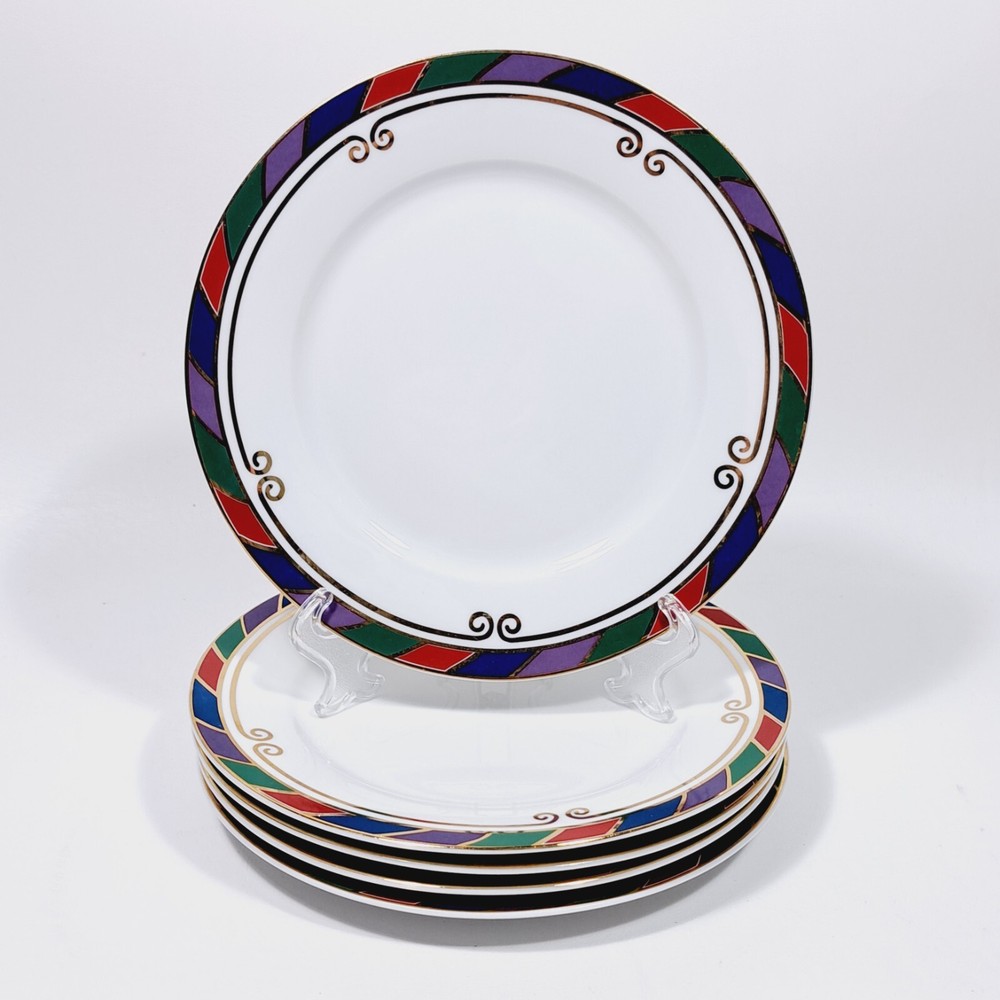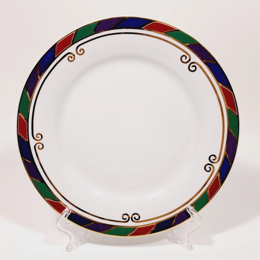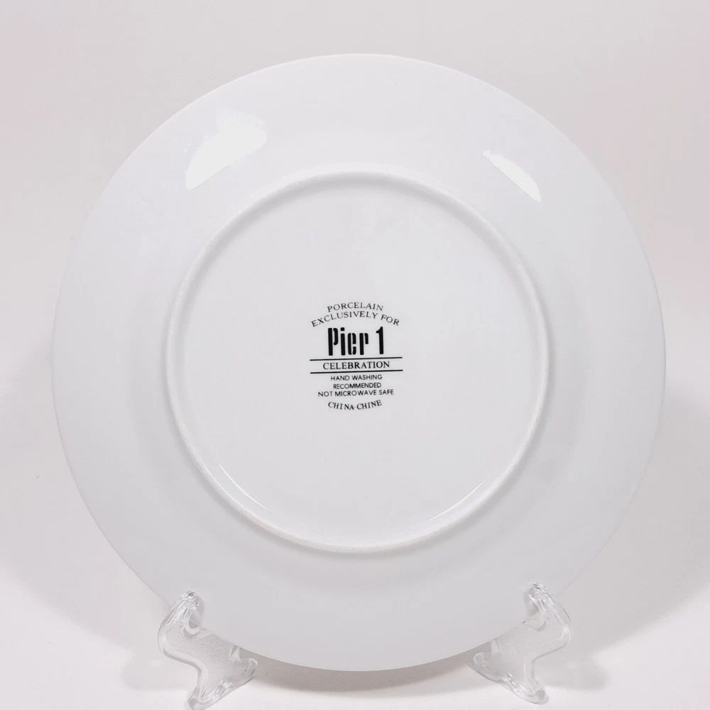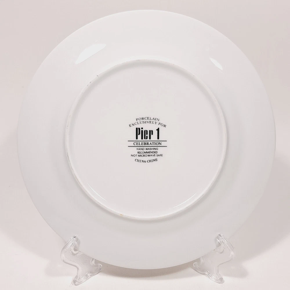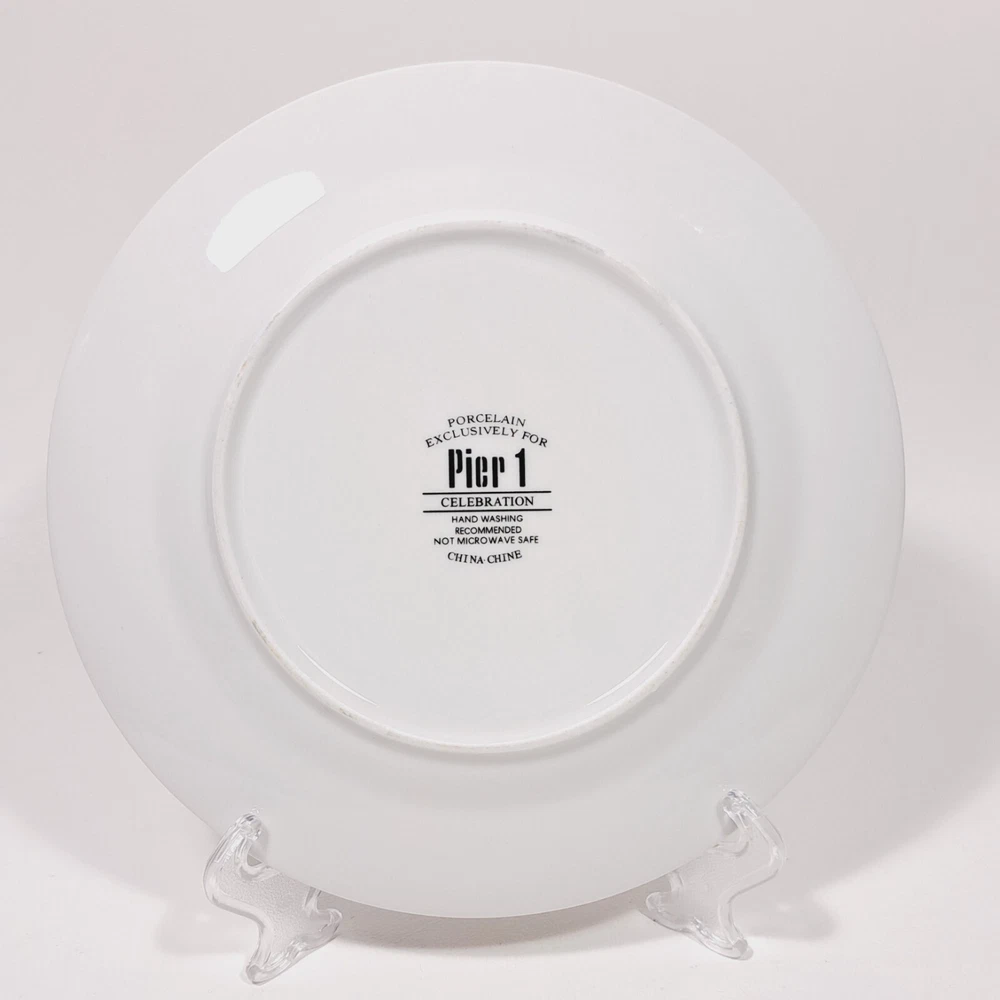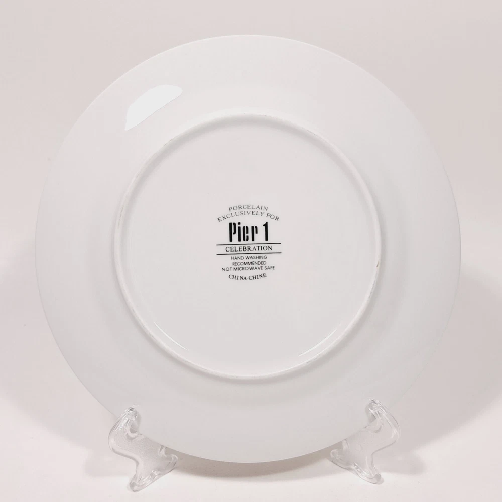 Pier 1 Celebration 7 5/8" Salad Plates Multicolored Band Gold Scroll Set of 5 Hand washing recommended Not microwave safe In excellent used condition-no chips or cracks. Minimal signs of use. Please see all photos for condition as they are part of the description. Please see my other listings of this pattern. I will combine shipping for multiple purchases.