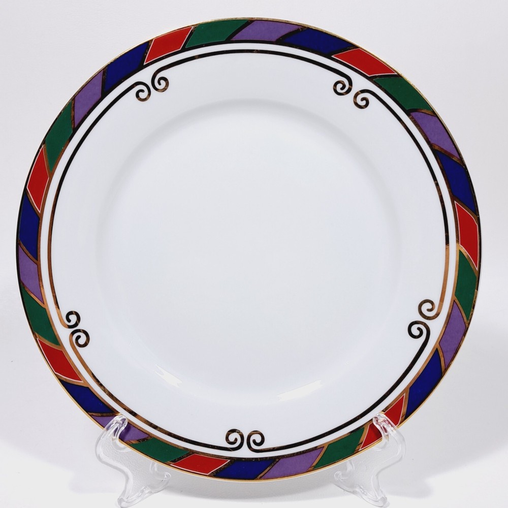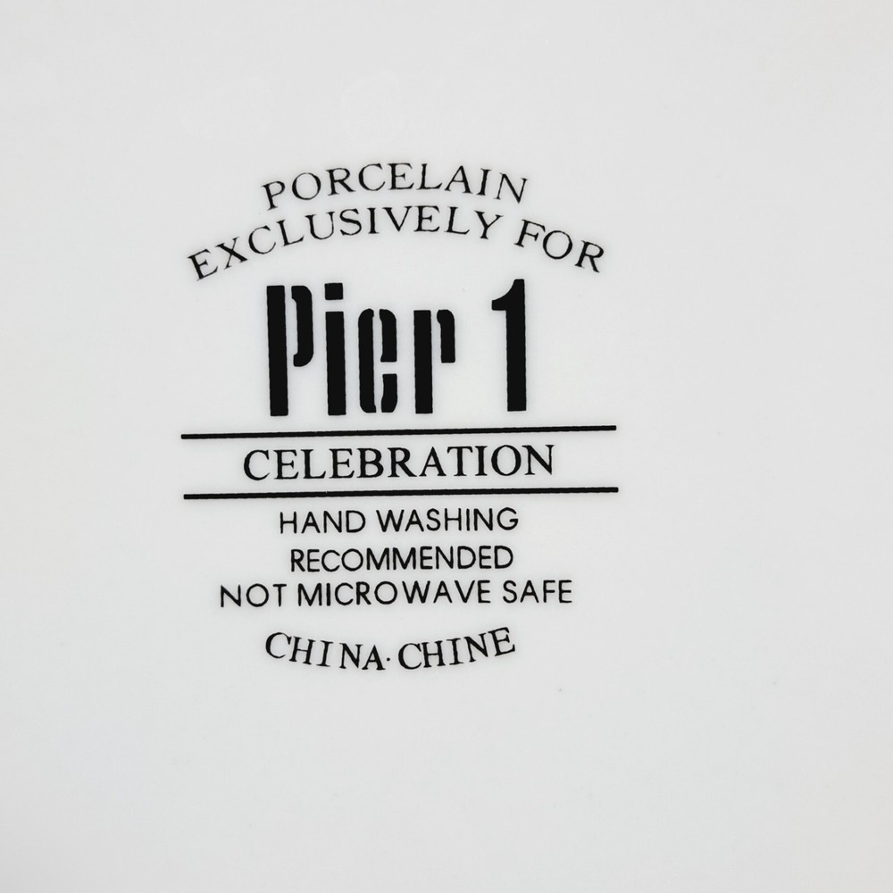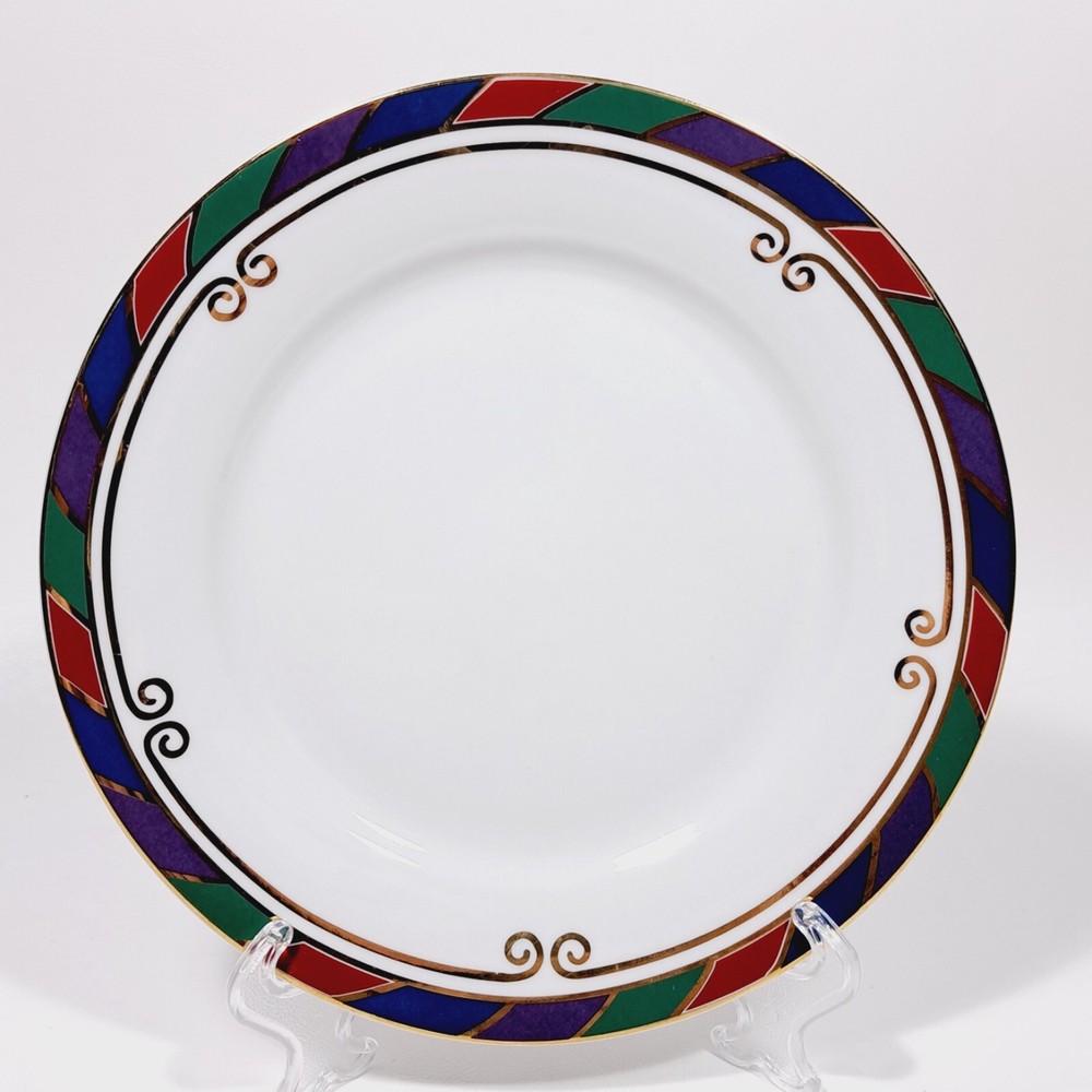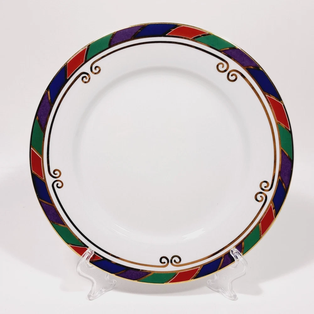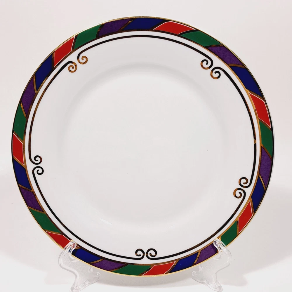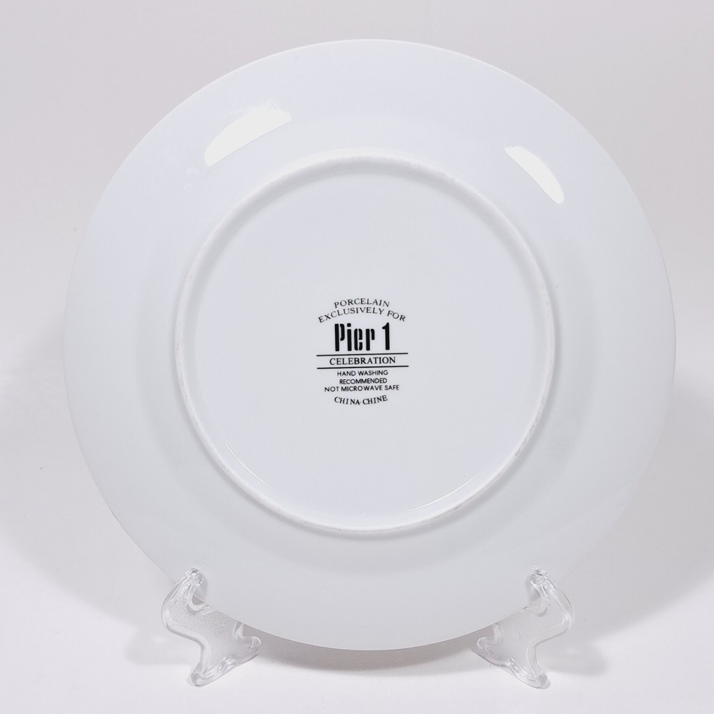 Pier 1 Celebration 7 5/8" Salad Plates Multicolored Band Gold Scroll Set of 5 Hand washing recommended Not microwave safe In excellent used condition-no chips or cracks. Minimal signs of use. Please see all photos for condition as they are part of the description. Please see my other listings of this pattern. I will combine shipping for multiple purchases.