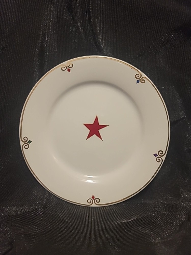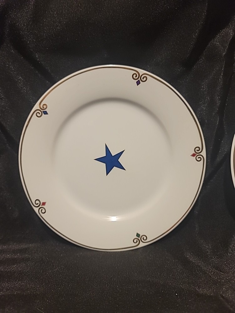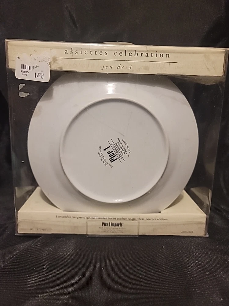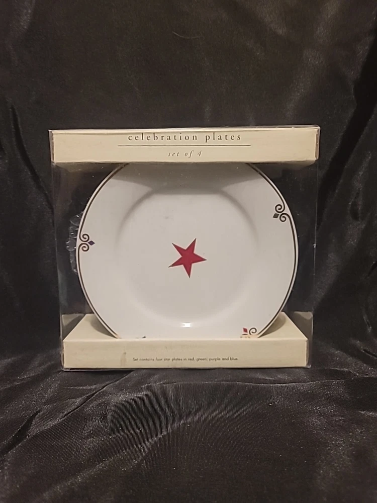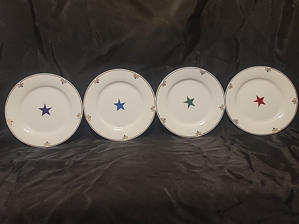 Condition: *NEW IN BOX* Never Opened, only to photograph -Box has minor damage and dust -Set of 4 - each plate has a different color star in middle - Red, Green, Purple, Blue -Discontinued **SEE PHOTOS ***Photos are actual item you are purchasing*** I've thoroughly inspected the plates and have, to the best of my ability, tried to note any issues (and photograph any). If I have missed anything it is by sheer accident and I will correct the problem. Please see photos. PLEASE READ - We do not charge any shipping/handling charges. The shipping cost is the EXACT amount we pay. Due to the weight, the most economical shipping is USPS Parcel Select Ground to help keep shipping cost down