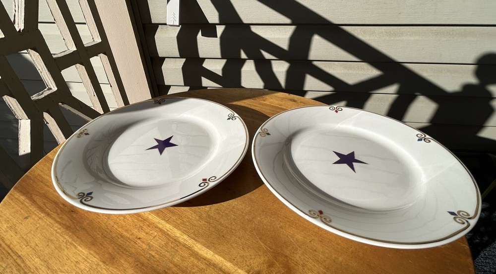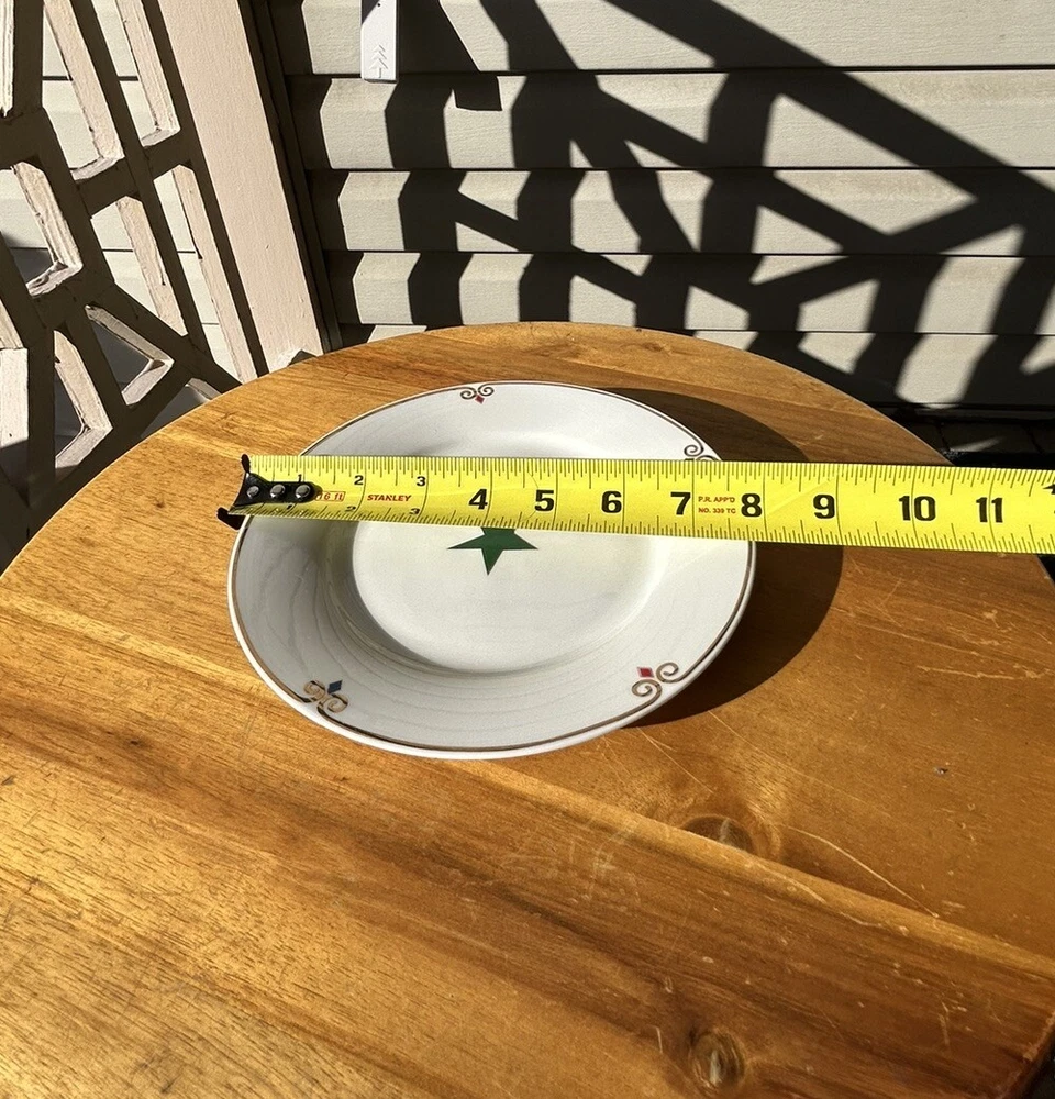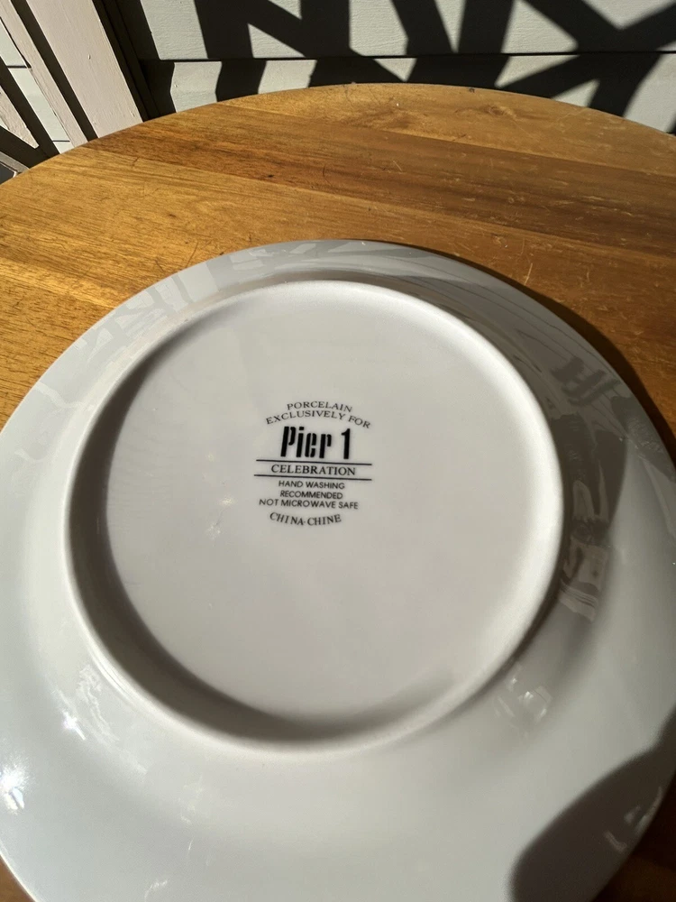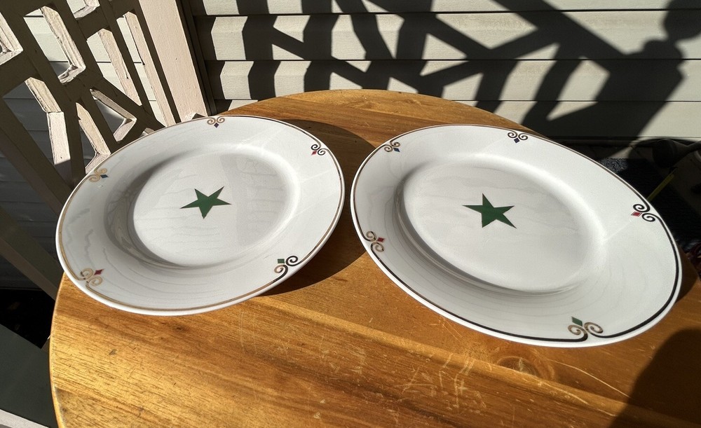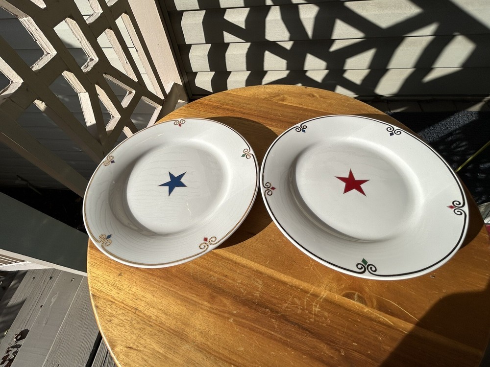 Pier 1 Celebration Star Accent Porcelain Salad Plates Mixed Colors 8”-Lot Of 6. Listing is for 6 plates total including 2 green star, 2 purple star, 1 red star, and 1 blue star. Approx. 8” in diameter. Printed with Pier 1 Hand Wash Only on the back. No apparent chips or cracks. Some light scratches and signs of wear as common in used dinnerware. Please see all photos as part of item description.