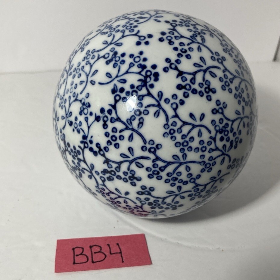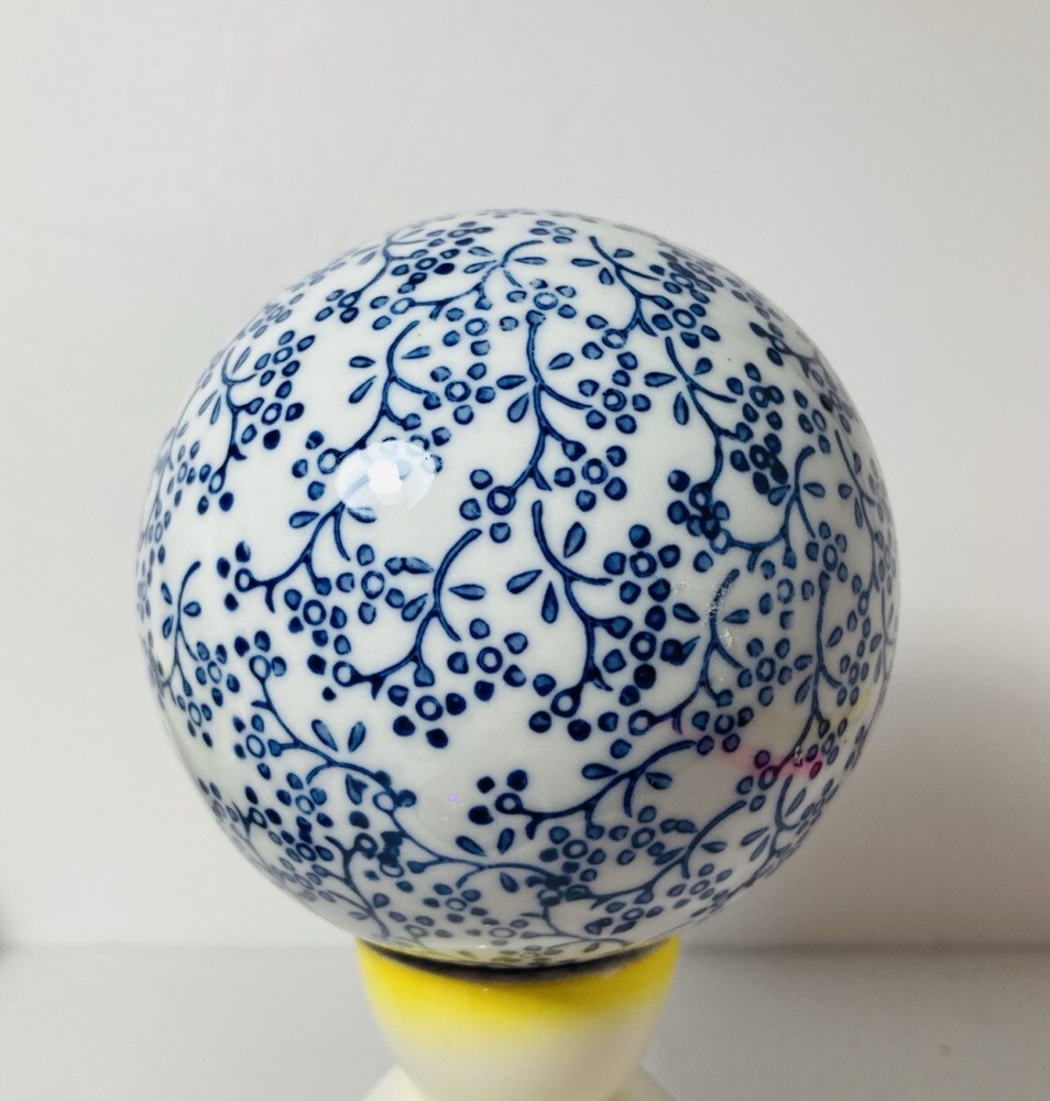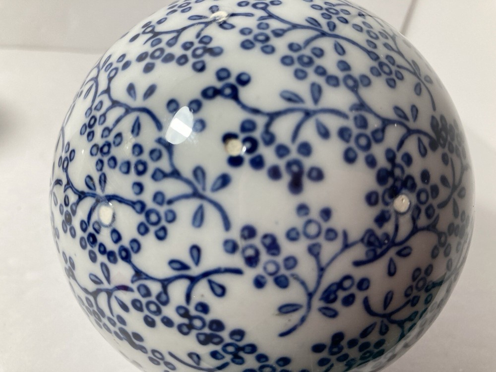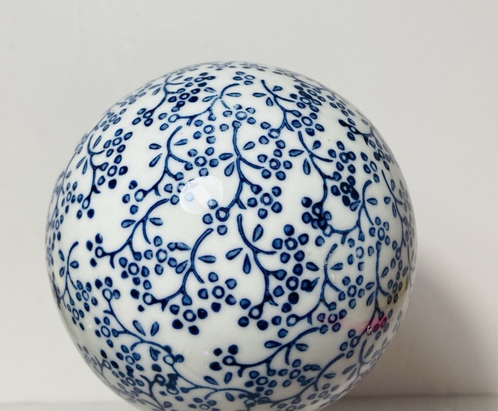 Beautiful and Classic ceramic carpet ball. Perfect to add a touch of charm to your home decor. I believe this was once purchase at pier 1. Measuring 4 inches in diameter, perfect Blue and White floral sphere. Perfect for everyday use or as a unique addition to any room. Made of high-quality ceramic, durable and stylish. This is used, I see no issues. There is 3 tiny white dots on the bottom, see photo. I don’t know why they are there ? Maybe it was from a display rack? Idk No chips, no cracks no discoloration.