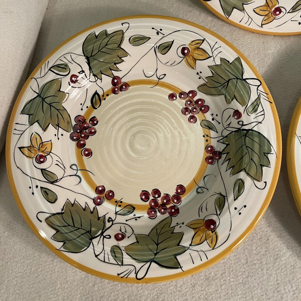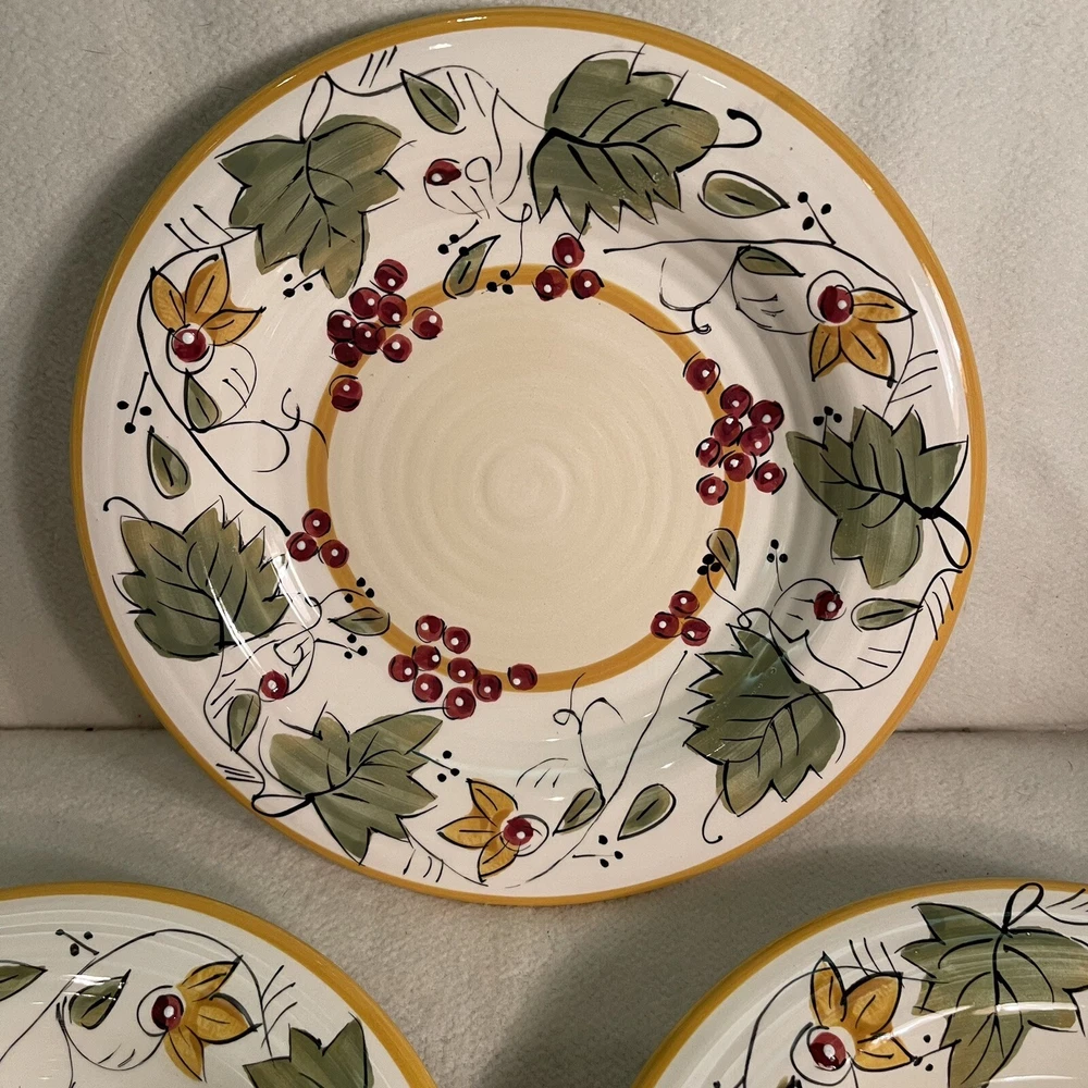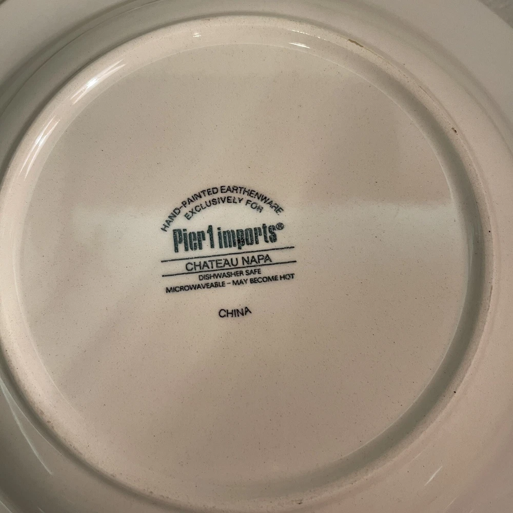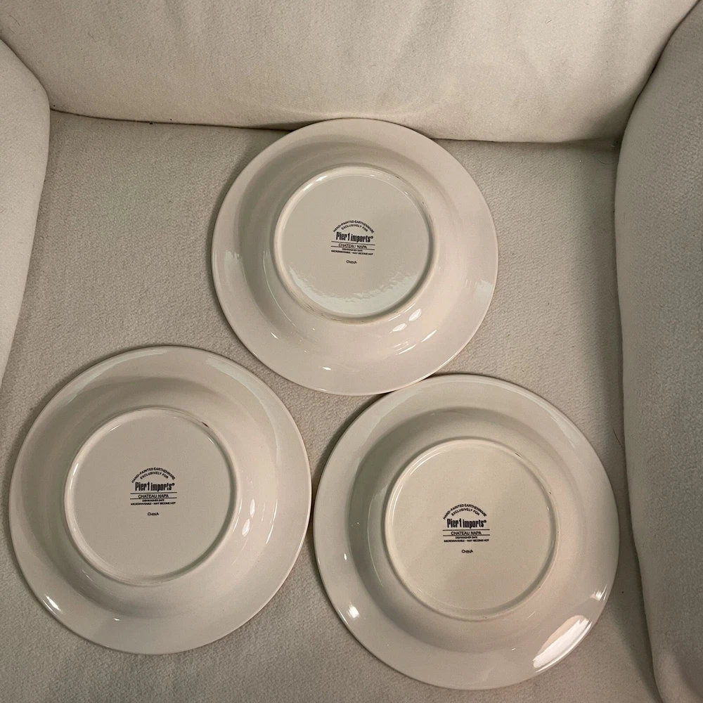 Add a touch of contemporary elegance to your dining table with this three-piece Pier 1 Chateau Napa salad plate set. The round plates measure 8.75 inches in diameter and feature a beautiful hand-painted Tuscan pattern in multicolor. Made of high-quality stoneware, these plates are perfect for any occasion, whether it's a casual family dinner or a formal event. The plates are part of the Chateau Napa product line and are produced in an earthenware style in China. They come with a printed backstamp and weigh a total of 3.6 lbs. This set is a must-have for anyone looking to upgrade their dining experience. Order now and enjoy the sophistication of these beautifully crafted plates. Excellent condition, no chips or cracks.