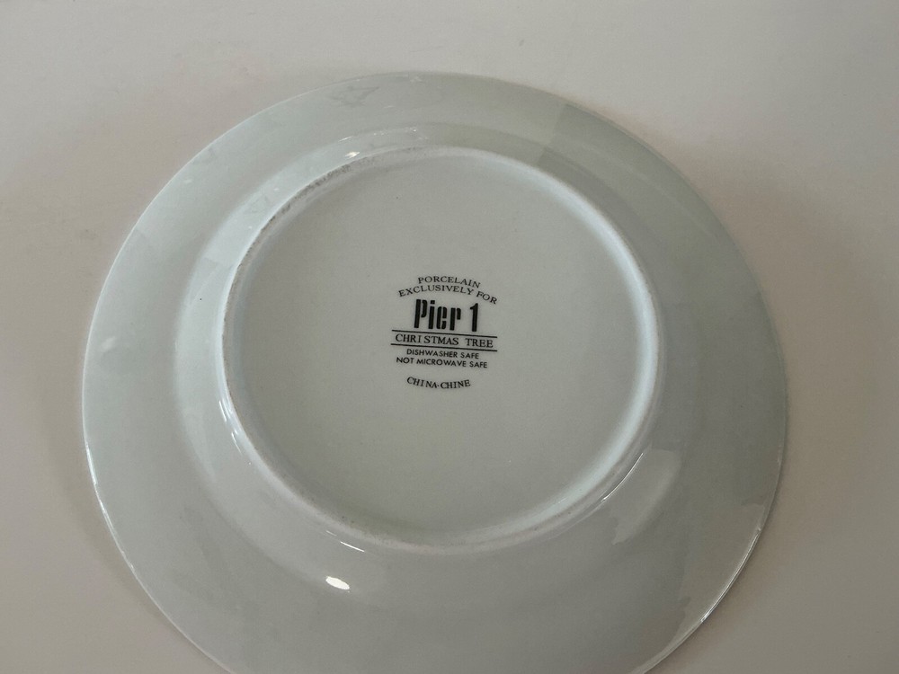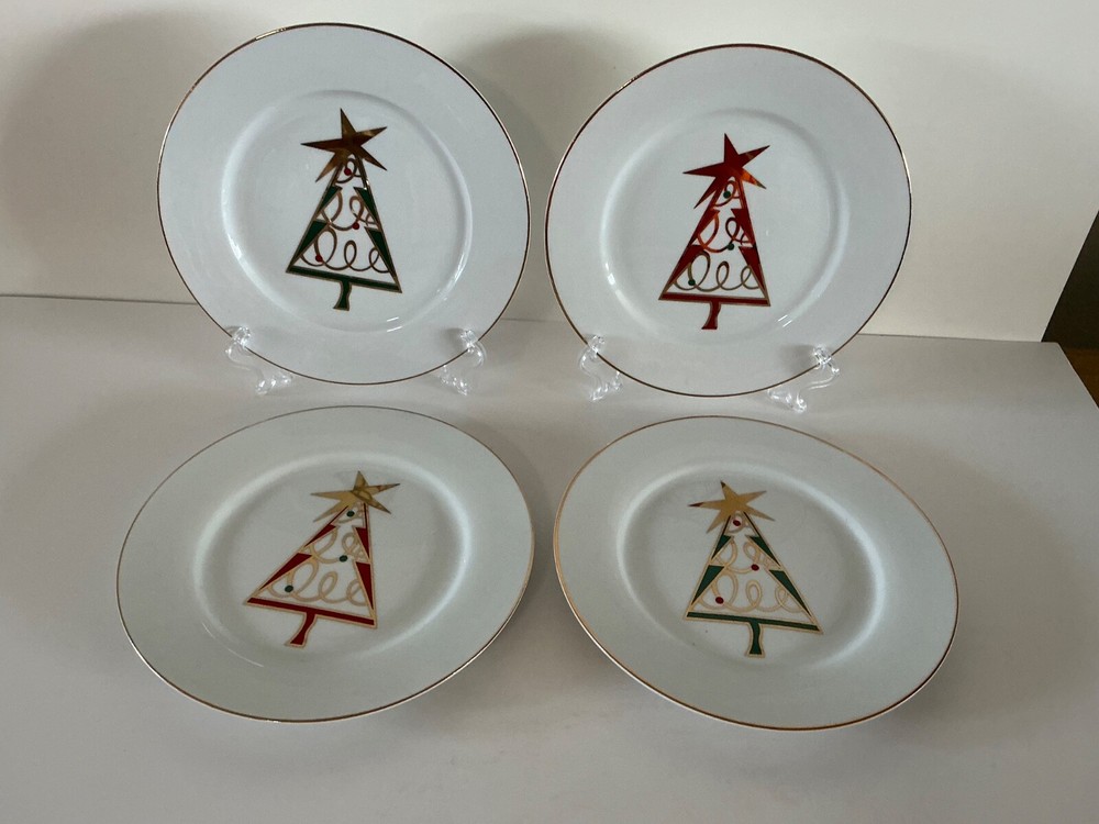 This set of four Pier 1 Christmas Tree Holiday Plates features a festive red and green design with a star pattern, perfect for holiday gatherings. Made of porcelain, these round dessert plates have a glossy finish and gold rim, adding a touch of elegance to your table setting. With a 7.5-inch diameter, they are ideal for serving holiday desserts and salads during the Christmas season. Hand wash only to preserve their original condition.