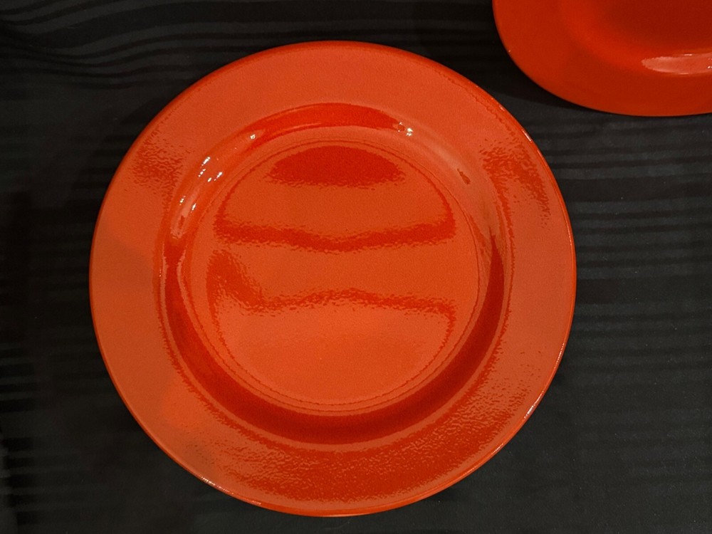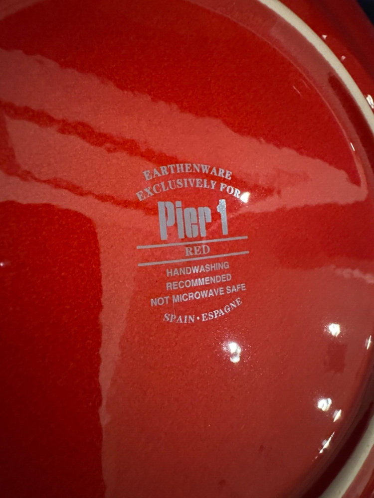 Add a touch of contemporary style to your dinnerware collection with this six-piece set of Pier 1 earthenware dinner plates in a vibrant red color. The round plates measure approx 10.5 inches in diameter and are made of durable stoneware material, ensuring they will last through many occasions. The plates feature a glossy finish and are printed with the Pier 1 backstamp. These plates are perfect for all occasions, whether you're hosting a formal dinner party or a casual family gathering. The earthenware production technique adds a unique touch to the design, making them a great addition to any decorative cookware collection. Made in Spain, these plates are an original Pier 1 product and are sure to impress your guests.