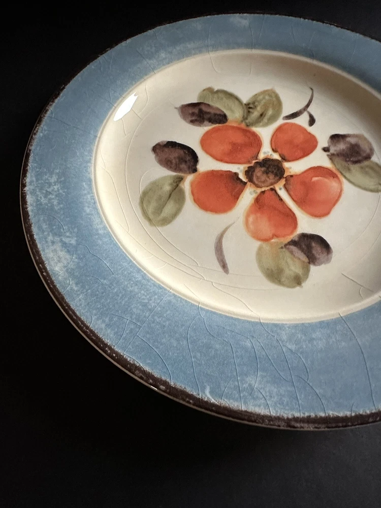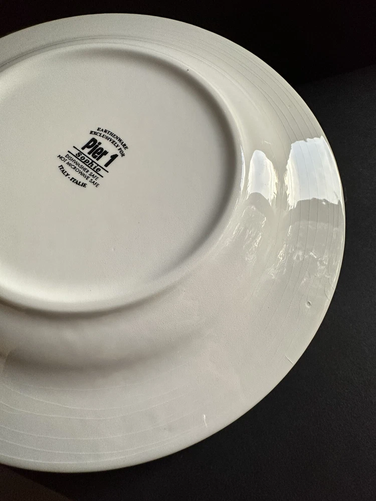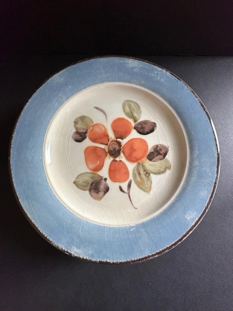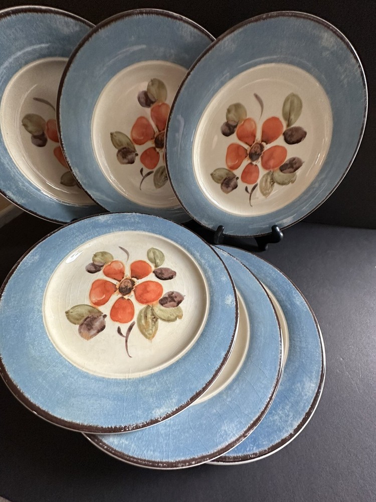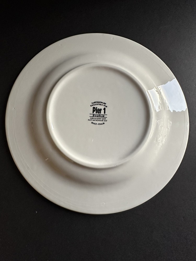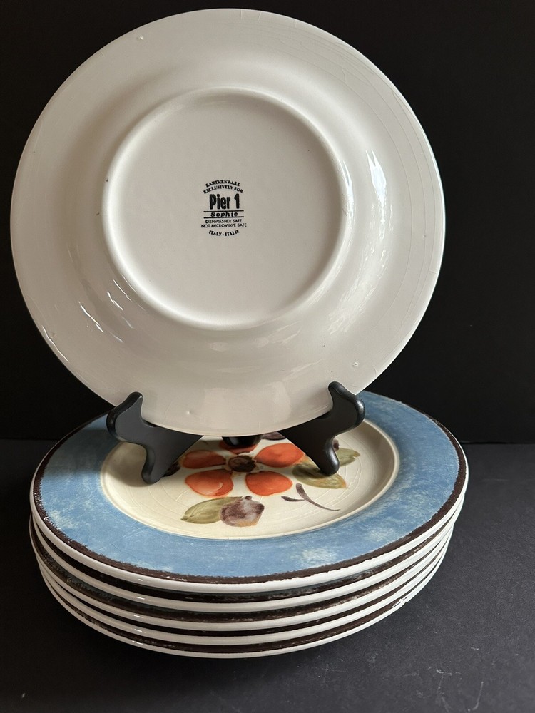Set of 6 Pier 1 Earthenware Sophie Plates 10.5” Made in Italy. Bright cheery orange flower, circled in cornflower blue. Brown rim. Dishwasher safe. Do not microwave. Condition is very good. No utensil marks or scratches. One plate has a small flea bite on the edge. (See last 3 photos) plates do have some crazing but no other chips or cracks.