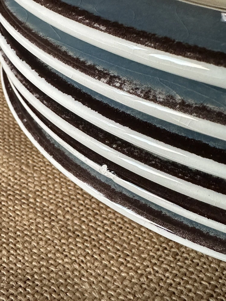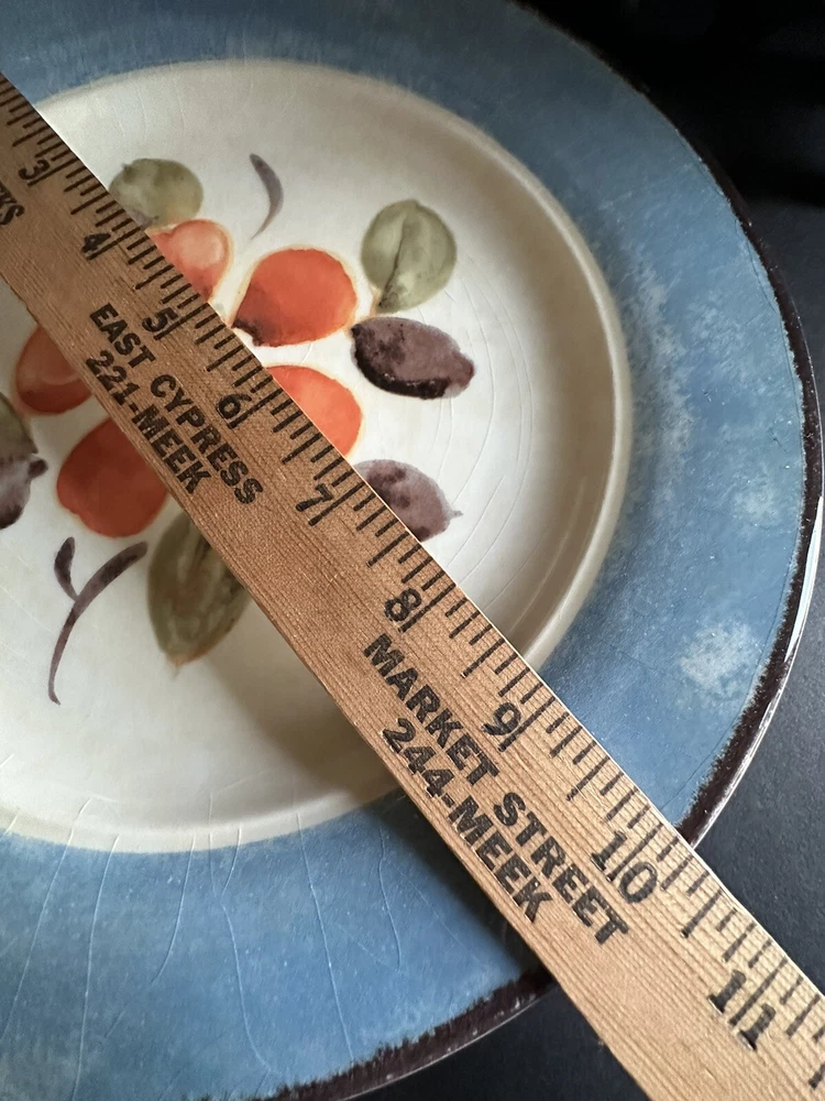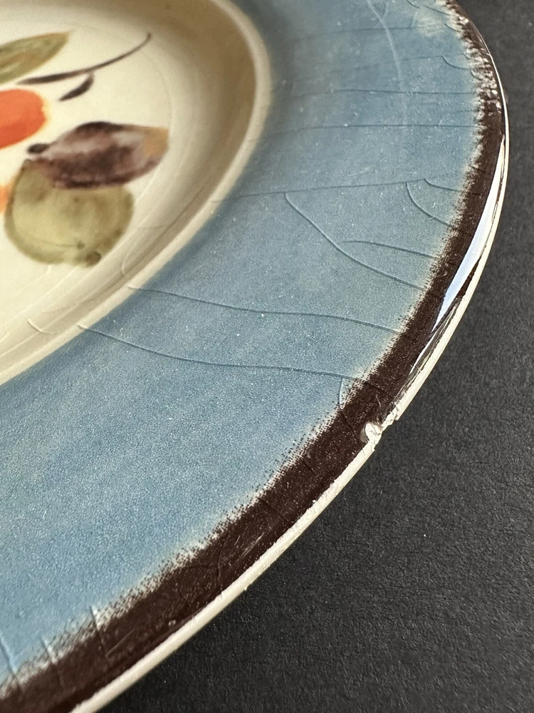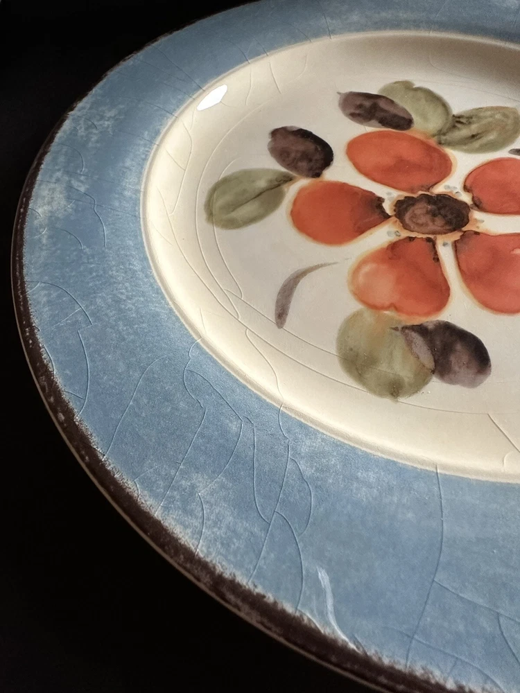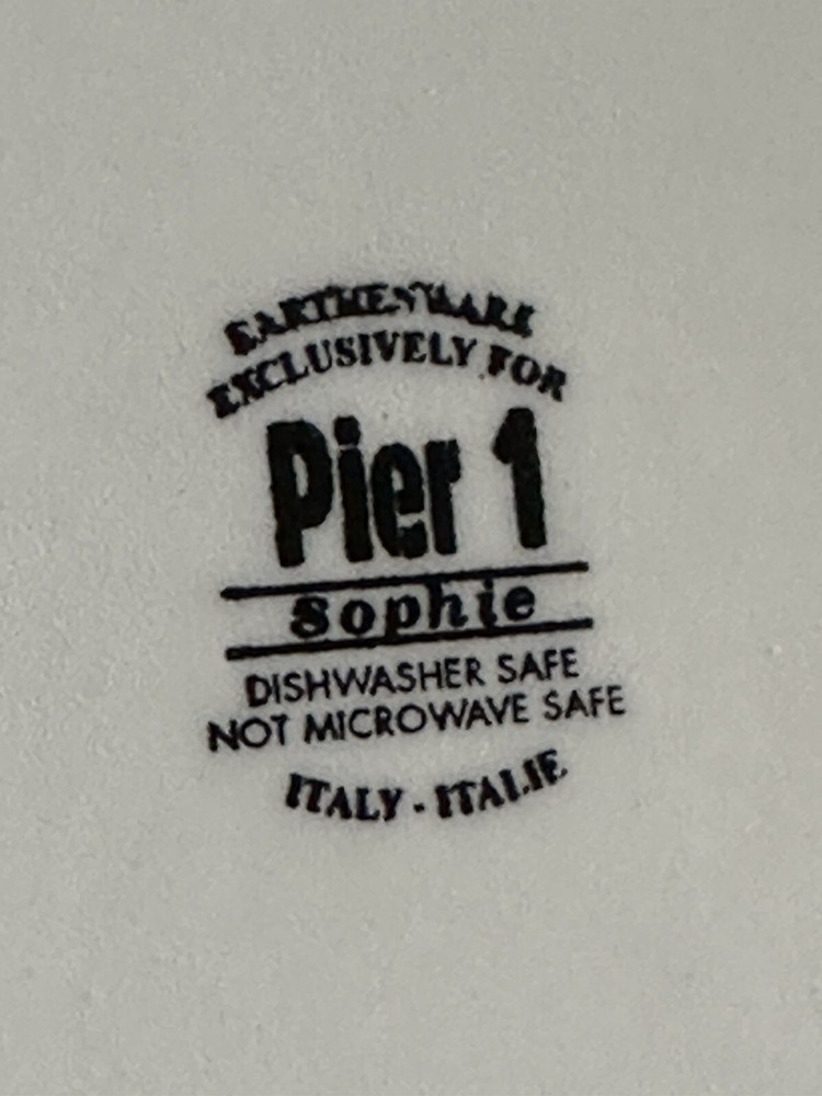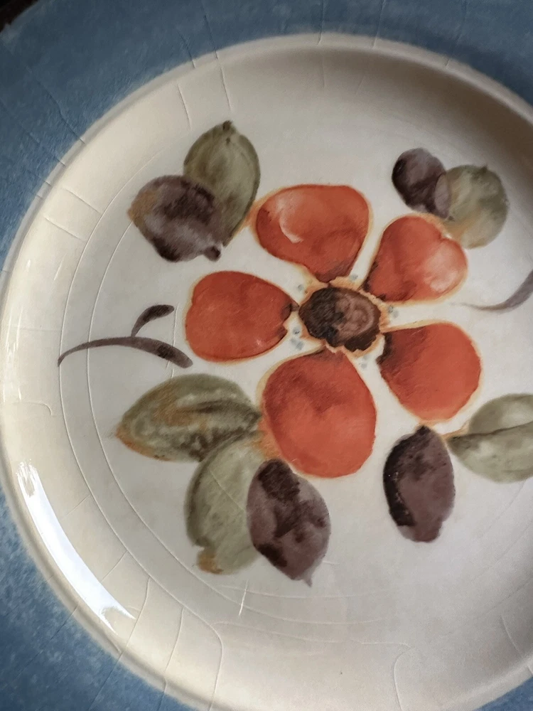 Set of 6 Pier 1 Earthenware Sophie Plates 10.5” Made in Italy. Bright cheery orange flower, circled in cornflower blue. Brown rim. Dishwasher safe. Do not microwave. Condition is very good. No utensil marks or scratches. One plate has a small flea bite on the edge. (See last 3 photos) plates do have some crazing but no other chips or cracks.
