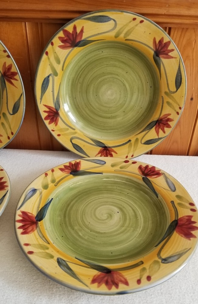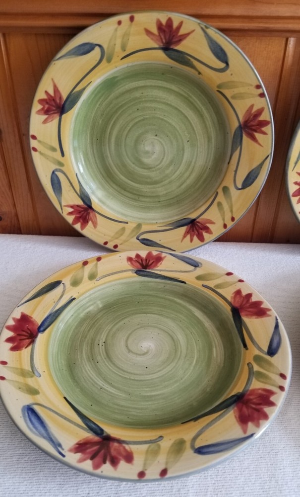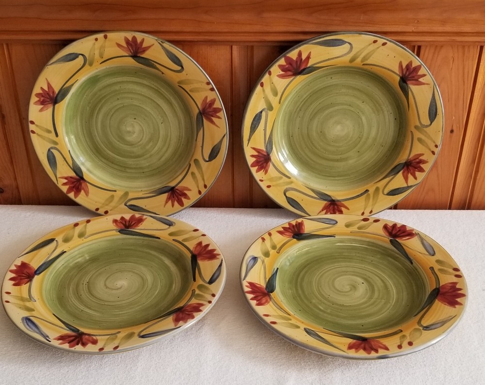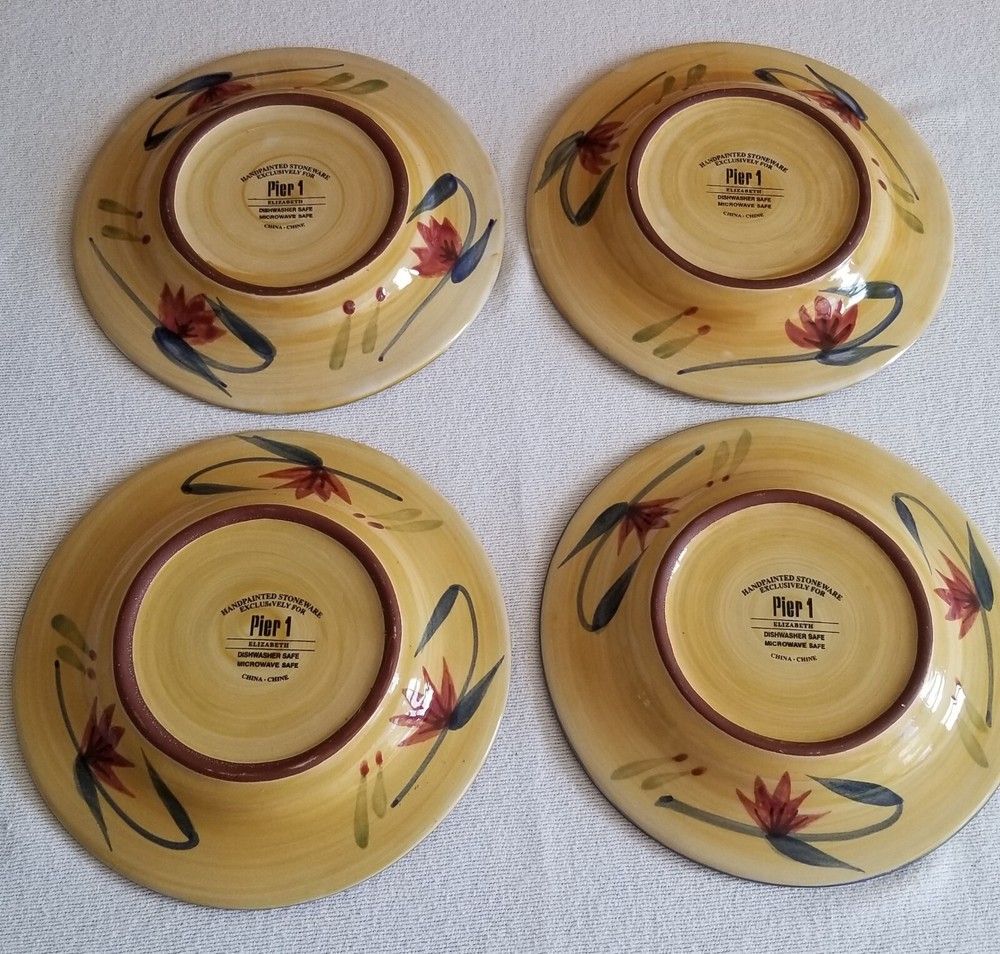 Set of 4, Pier 1, Elizabeth, 8-1/8" salad plates in Excellent, pre-owned condition. No nicks, chips or glaze crazing. This pattern was manufactured between 2005 - 2010. Since this pattern is handpainted, there are subtle variations in the colors on each plate. This is typical and normal. It actually makes them more interesting and unique! Choice of S&H. Thanks for shopping with SugarBarn.