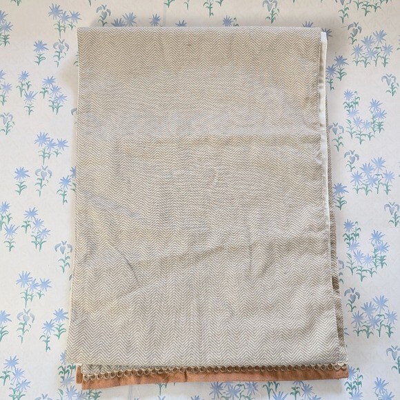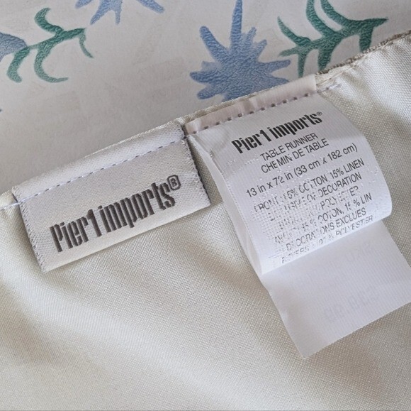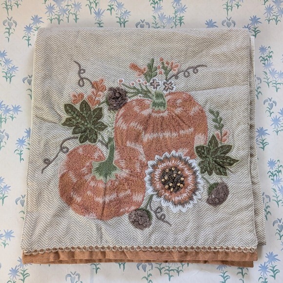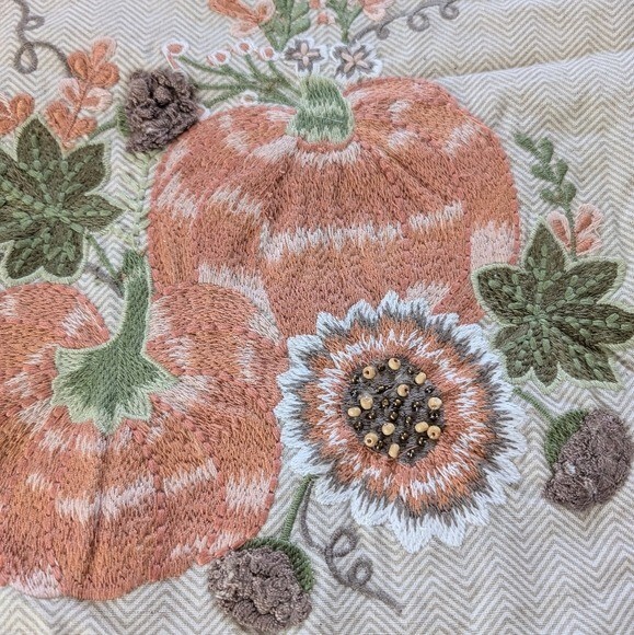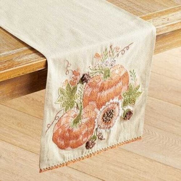Pier 1 Imports Embroidered Harvest Pumpkin Table Runner. Natural tan background with orange, green, white and brown embroidered autumn design featuring pumpkins and sunflower. 85% Cotton, 15% Linen. Made in India. Length - 72" Width - 13" New unused condition. *All measurements are approximate.*