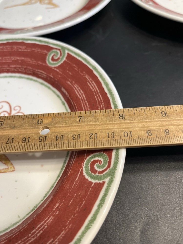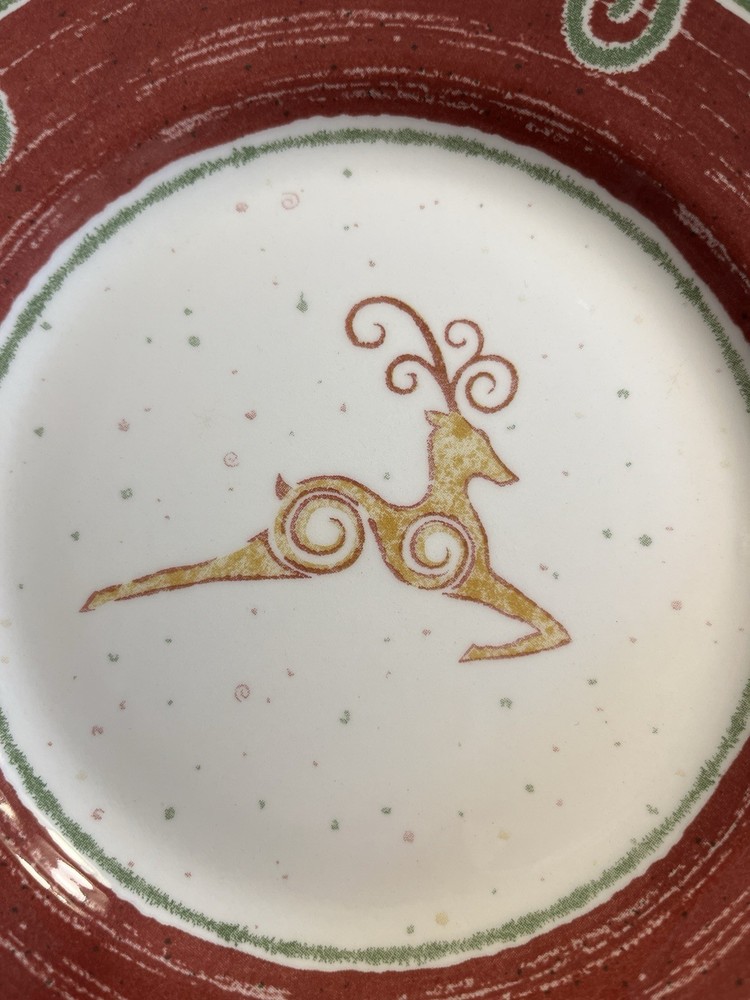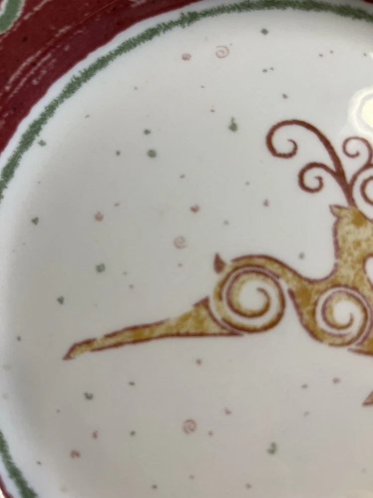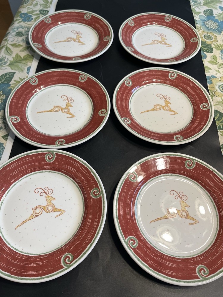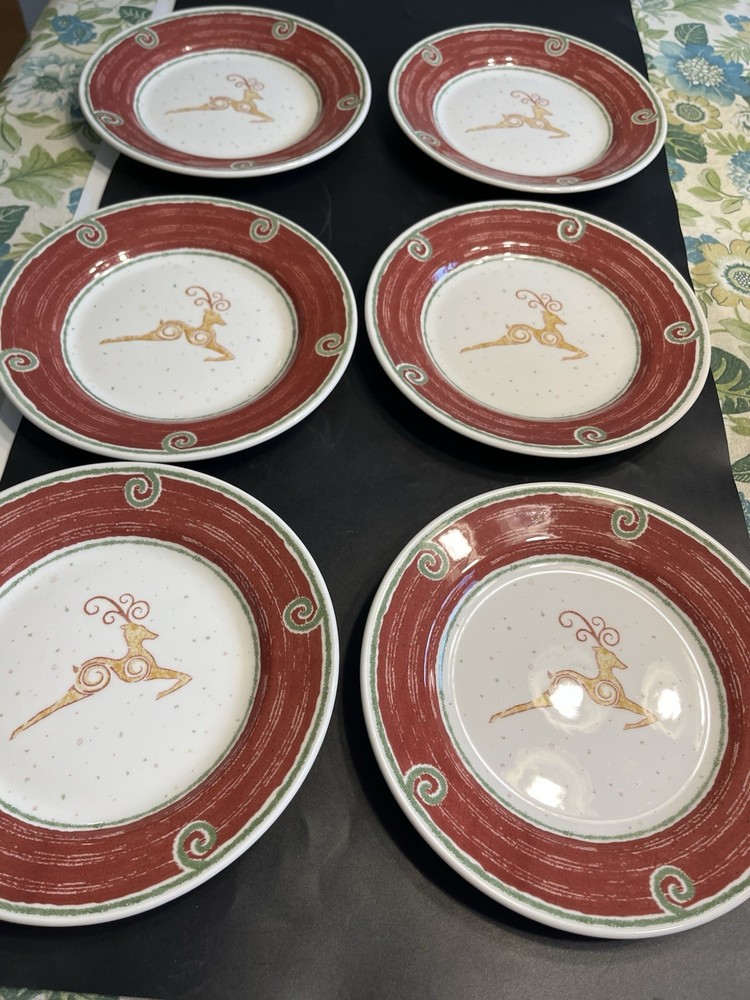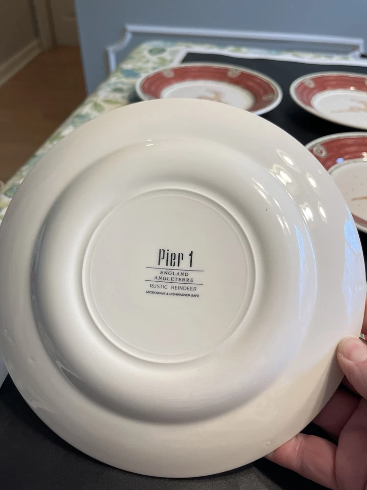 The Pier 1 England Rustic Reindeer 8” Luncheon Dessert Plates 6pc are a festive and charming addition to any holiday table setting. Made in England, these ceramic plates feature a rustic reindeer pattern in a multicolor design, perfect for Christmas celebrations. With a round shape and glossy finish, these luncheon plates by Pier 1 offer a touch of elegance to your dining experience, making them a delightful choice for holiday gatherings.