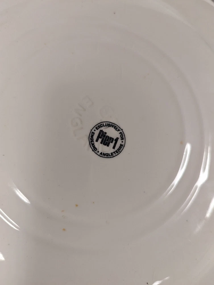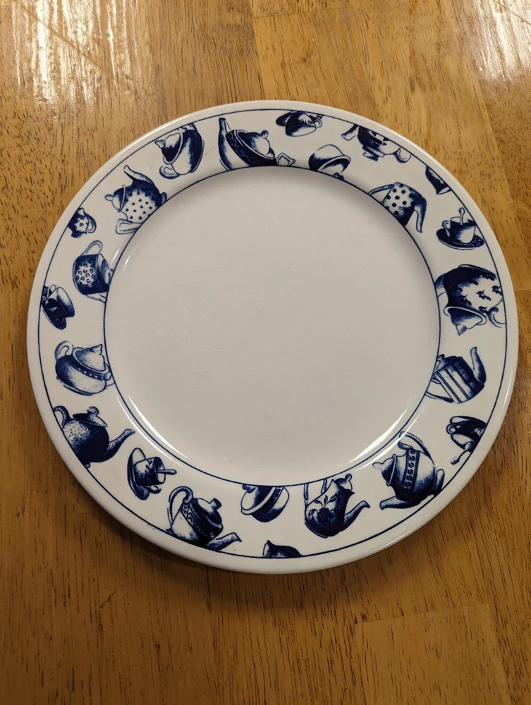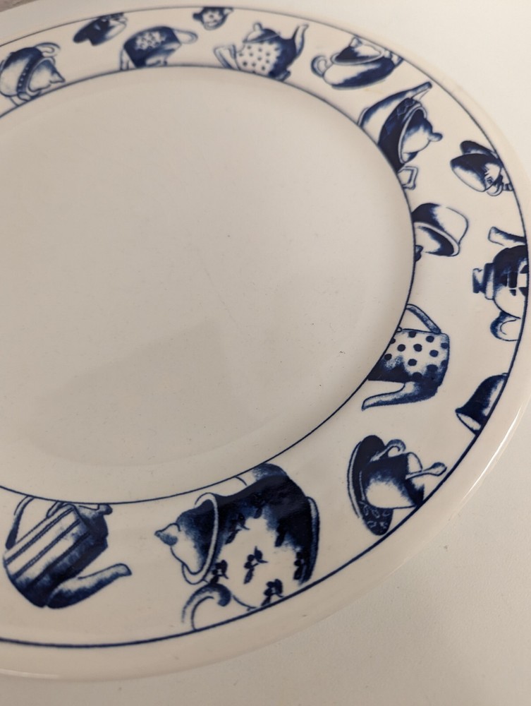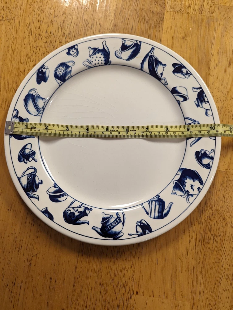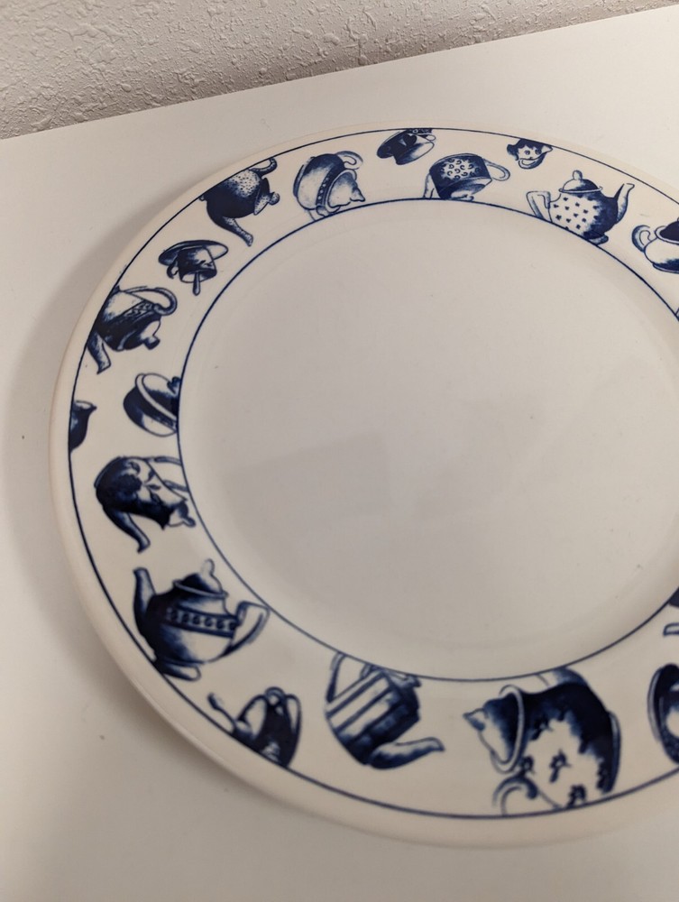 This charming dinner plate from Pier 1 is a delightful addition to your table setting. With its white porcelain and ceramic material, the plate is both durable and elegant. The blue teapot design rim adds a touch of whimsy to your dining experience. Measuring 10 inches, this round plate is perfect for all occasions, whether it's a casual lunch or a fancy dinner party. The plate is an original piece from England. The combination of white and blue colors is perfect for a cottage core style, and it can easily complement any other tableware. Very good condition. No chips are cracks. A bit of light crazing on one section and there is a very faint light brown mark (see photos, might be a manufacturers defect, as it is smooth.).