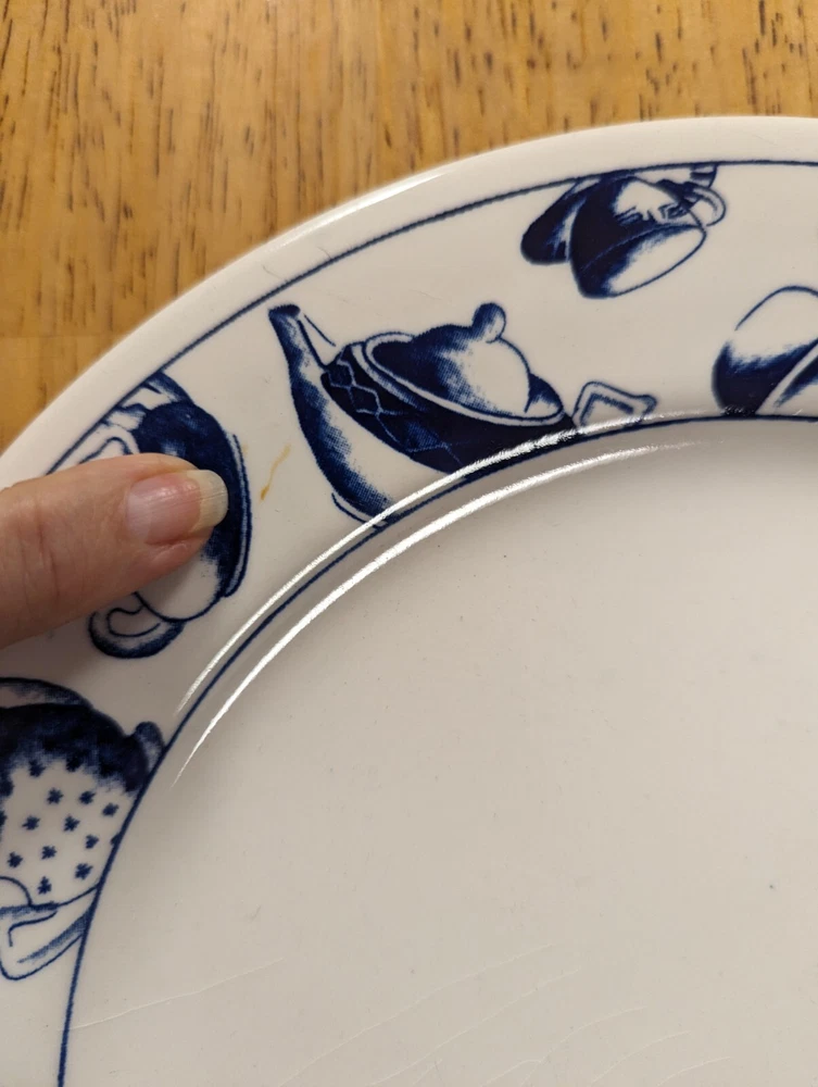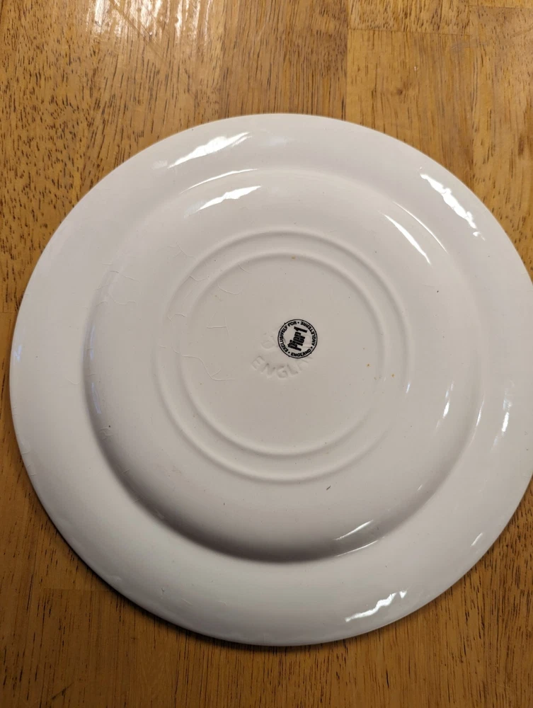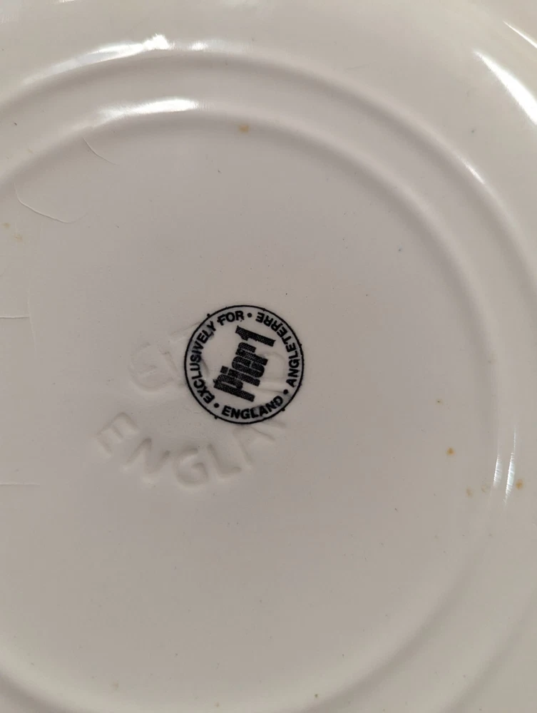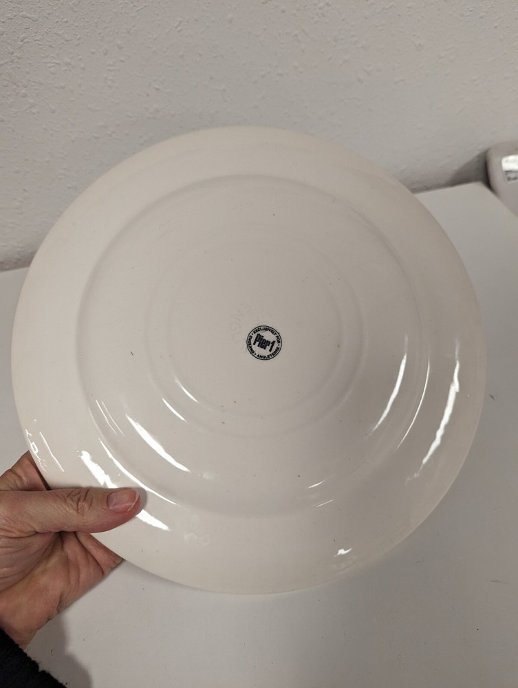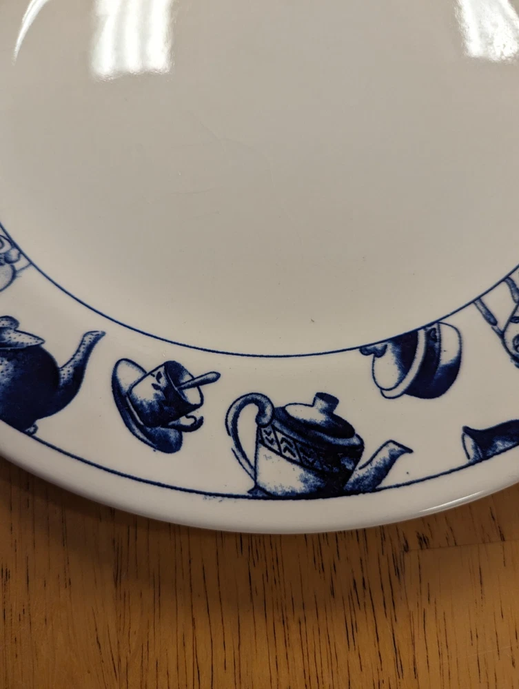 This charming dinner plate from Pier 1 is a delightful addition to your table setting. With its white porcelain and ceramic material, the plate is both durable and elegant. The blue teapot design rim adds a touch of whimsy to your dining experience. Measuring 10 inches, this round plate is perfect for all occasions, whether it's a casual lunch or a fancy dinner party. The plate is an original piece from England. The combination of white and blue colors is perfect for a cottage core style, and it can easily complement any other tableware. Very good condition. No chips are cracks. A bit of light crazing on one section and there is a very faint light brown mark (see photos, might be a manufacturers defect, as it is smooth.).