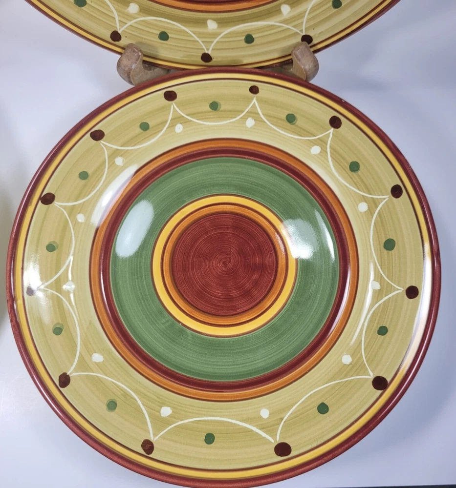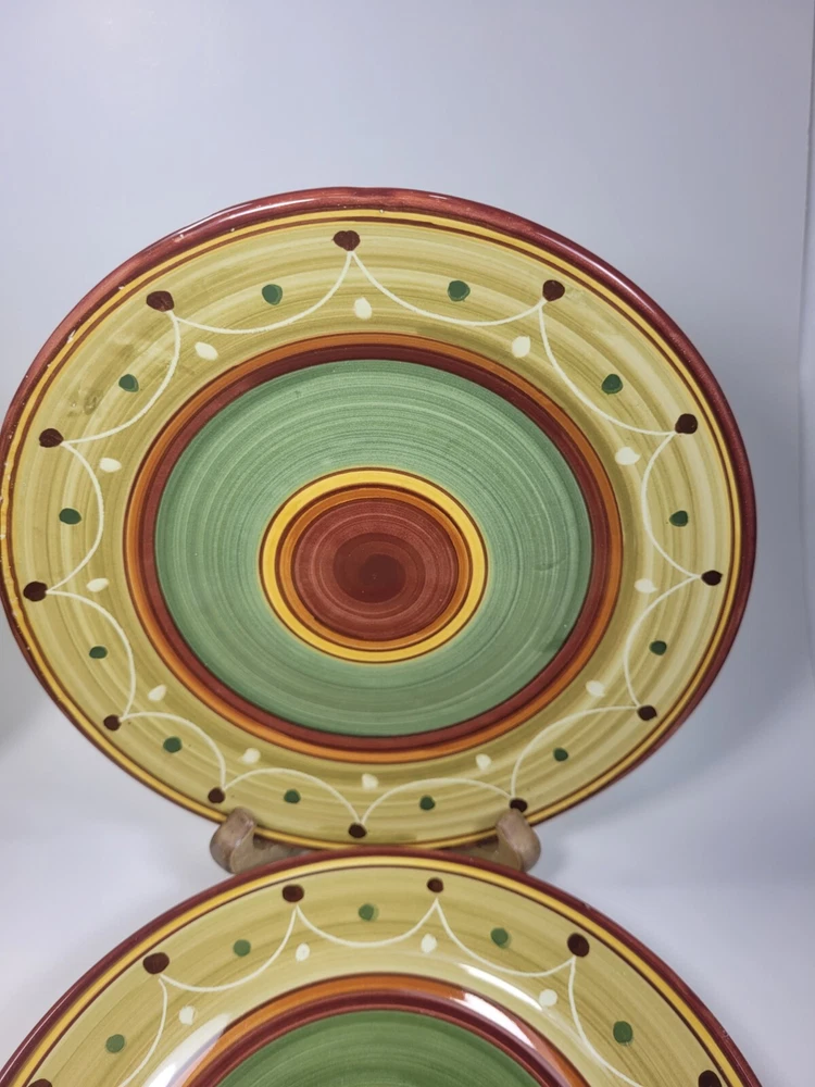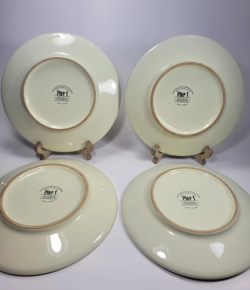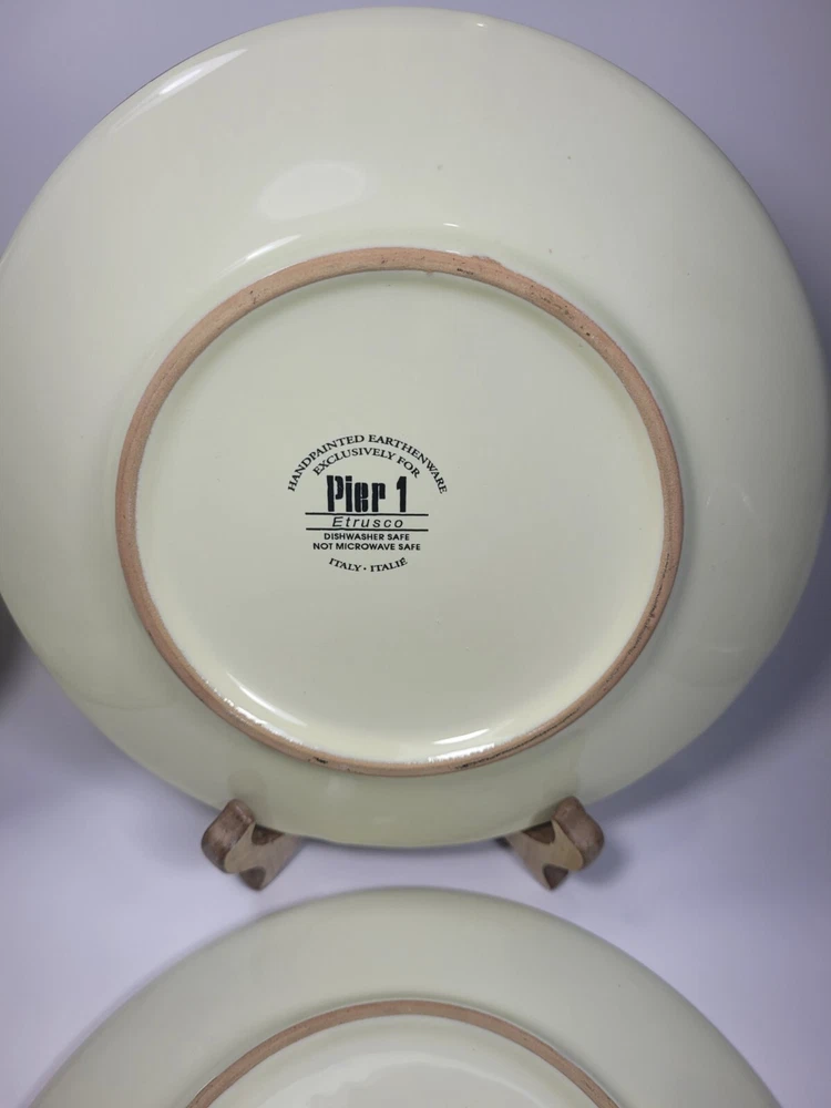 Enhance your dining experience with this stunning set of four hand-painted Pier 1 Etrusco 8" salad plates. These round earthenware plates feature a beautiful multicolor pattern. Perfect for all occasions, this plate set is a great addition to your collection. Crafted in Italy using traditional pottery techniques, these decorative plates are dishwasher safe. The glossy finish and printed backstamp add to their charm. Each plate has a diameter of 8 inches and is ideal for serving salads. This original Pier 1 product is perfect for teens, adults, and unisex kids. They are in nice preowned condition. They are hand painted and each plate is unique. No chips or cracks, but one plate has some spots that didn't get painted/glazed completely. See the last photo. This adds to the uniqueness of the pieces. 12.95 US SHIPPING INTERNATIONAL BUYERS PAY THROUGH THE EBAY INTERNATIONAL SHIPPING PROGRAM IF YOU ARE PURCHASING MORE THAN ONE ITEM, PLEASE WAIT TO BE INVOICED TO PAY SO I CAN SEND AN UPDATED INVOICE WITH DISCOUNTED SHIPPING RATES. IF ITEMS ARE PAID BEFORE THE INVOICE IS SENT I CAN'T GO BACK AND CHANGE THE CHARGES. PLEASE SEE ALL PHOTOS AS THEY ARE PART OF MY ITEMS DESCRIPTION, BOXES MAY SHOW SIGNS OF SHELF WEAR BUT THIS DOESN'T AFFECT THE PRODUCT INSIDE WITH VINTAGE ITEMS, THEY MAY SHOWS SIGNS OF WEAR NORMAL WITH THEIR AGE, I WILL BE SURE TO LIST ANY MAJOR BLEMISHES I SEE. I TAKE LOTS OF PHOTOS FROM ALL ANGLES TO HELP SHOW THE CONDITION OF MY ITEMS. ALL OF MY ITEMS COME FROM A SMOKE FREE - PET FREE HOME. QUESTIONS, PLEASE ASK BEFORE PURCHASE. I TAKE PRIDE IN PACKAGING WELL AND FAST SHIPPING. I STRIVE FOR A FIVE STAR RATING. PLEASE CONTACT ME BEFORE LEAVING BAD FEEDBACK. I LEAVE FEEDBACK ONCE I RECEIVE FEEDBACK. THANKS FOR LOOKING AT MY ITEMS