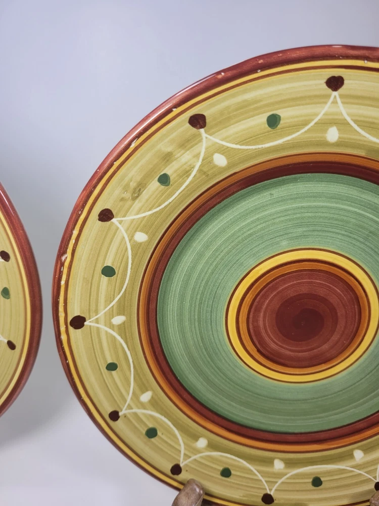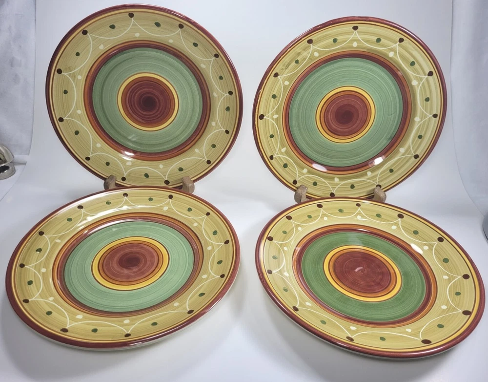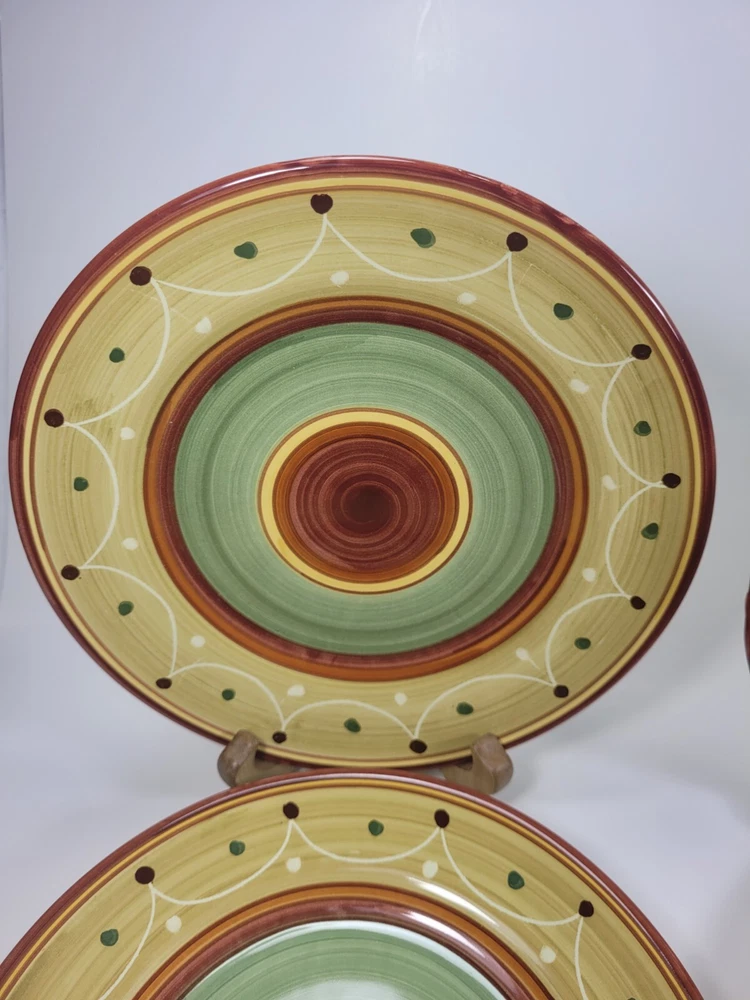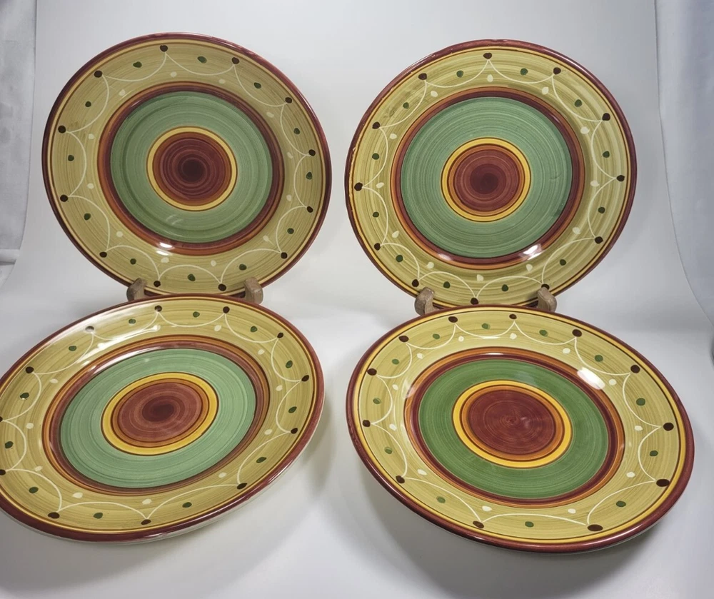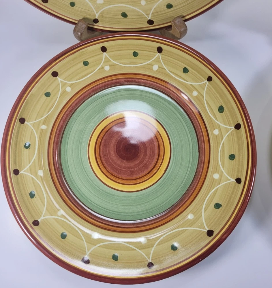 Enhance your dining experience with this stunning set of four hand-painted Pier 1 Etrusco 8" salad plates. These round earthenware plates feature a beautiful multicolor pattern. Perfect for all occasions, this plate set is a great addition to your collection. Crafted in Italy using traditional pottery techniques, these decorative plates are dishwasher safe. The glossy finish and printed backstamp add to their charm. Each plate has a diameter of 8 inches and is ideal for serving salads. This original Pier 1 product is perfect for teens, adults, and unisex kids. They are in nice preowned condition. They are hand painted and each plate is unique. No chips or cracks, but one plate has some spots that didn't get painted/glazed completely. See the last photo. This adds to the uniqueness of the pieces. 12.95 US SHIPPING INTERNATIONAL BUYERS PAY THROUGH THE EBAY INTERNATIONAL SHIPPING PROGRAM IF YOU ARE PURCHASING MORE THAN ONE ITEM, PLEASE WAIT TO BE INVOICED TO PAY SO I CAN SEND AN UPDATED INVOICE WITH DISCOUNTED SHIPPING RATES. IF ITEMS ARE PAID BEFORE THE INVOICE IS SENT I CAN'T GO BACK AND CHANGE THE CHARGES. PLEASE SEE ALL PHOTOS AS THEY ARE PART OF MY ITEMS DESCRIPTION, BOXES MAY SHOW SIGNS OF SHELF WEAR BUT THIS DOESN'T AFFECT THE PRODUCT INSIDE WITH VINTAGE ITEMS, THEY MAY SHOWS SIGNS OF WEAR NORMAL WITH THEIR AGE, I WILL BE SURE TO LIST ANY MAJOR BLEMISHES I SEE. I TAKE LOTS OF PHOTOS FROM ALL ANGLES TO HELP SHOW THE CONDITION OF MY ITEMS. ALL OF MY ITEMS COME FROM A SMOKE FREE - PET FREE HOME. QUESTIONS, PLEASE ASK BEFORE PURCHASE. I TAKE PRIDE IN PACKAGING WELL AND FAST SHIPPING. I STRIVE FOR A FIVE STAR RATING. PLEASE CONTACT ME BEFORE LEAVING BAD FEEDBACK. I LEAVE FEEDBACK ONCE I RECEIVE FEEDBACK. THANKS FOR LOOKING AT MY ITEMS