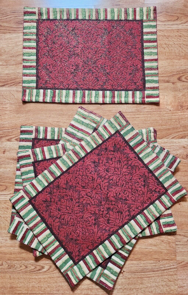 VINTAGE PIER ONE SET OF 6 PLACEMATS 13" X 18" BEAUTIFUL SPARKLES OF GREEN, GOLD, BEIGE, AND BURGUNDY FLORAL SCROLL PATTERN WITH STRIPES ON ALL SIDES EXCELLENT PRE-OWNED CONDITION. NO STAINS ,RIPS, OR TARES. PERFECT FOR FALL AND CHRISTMAS. SMOKE FREE HOME THANK YOU FOR LOOKING. HAVE A WONDERFUL DAY. FAST SHIPPING!