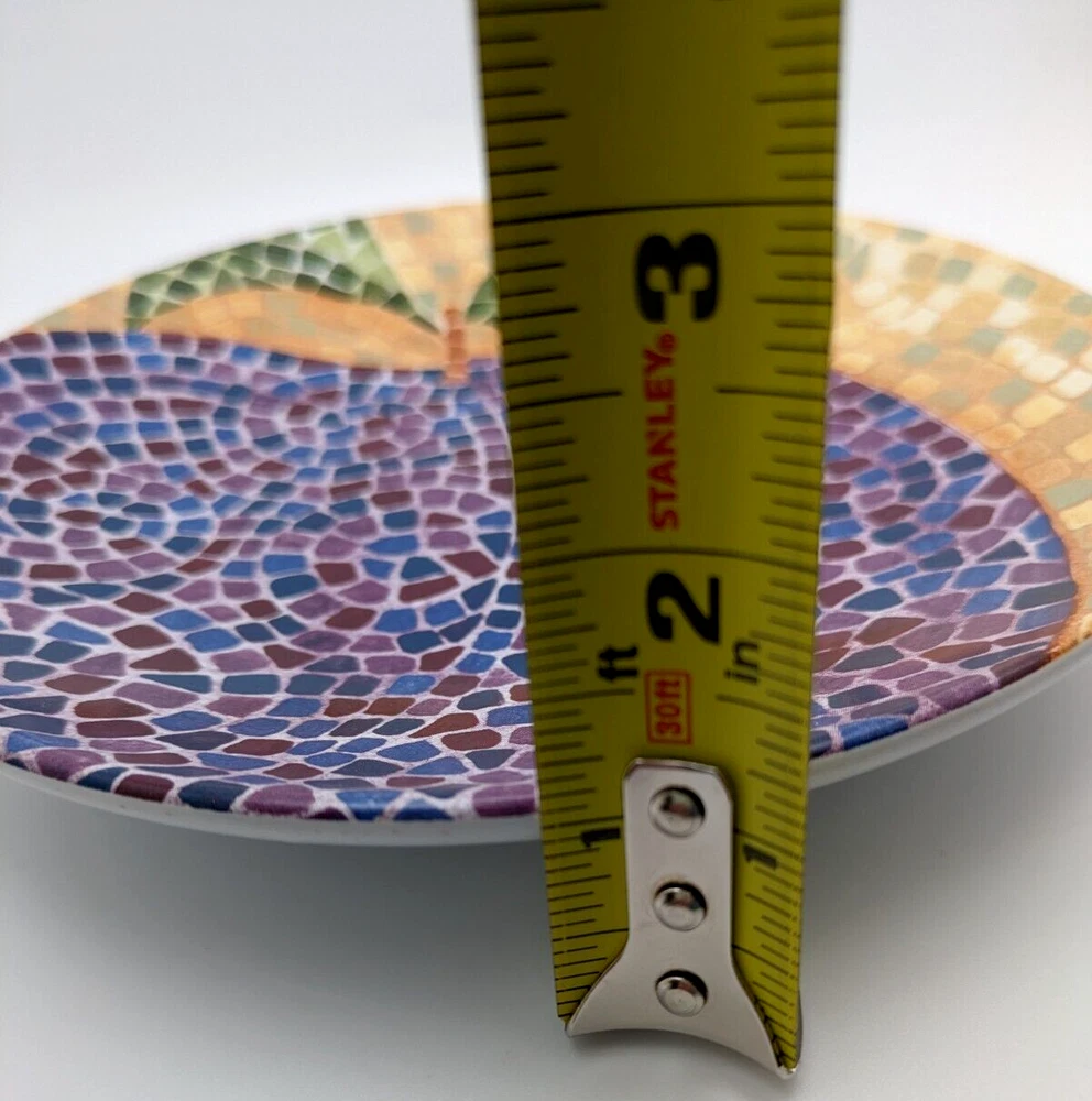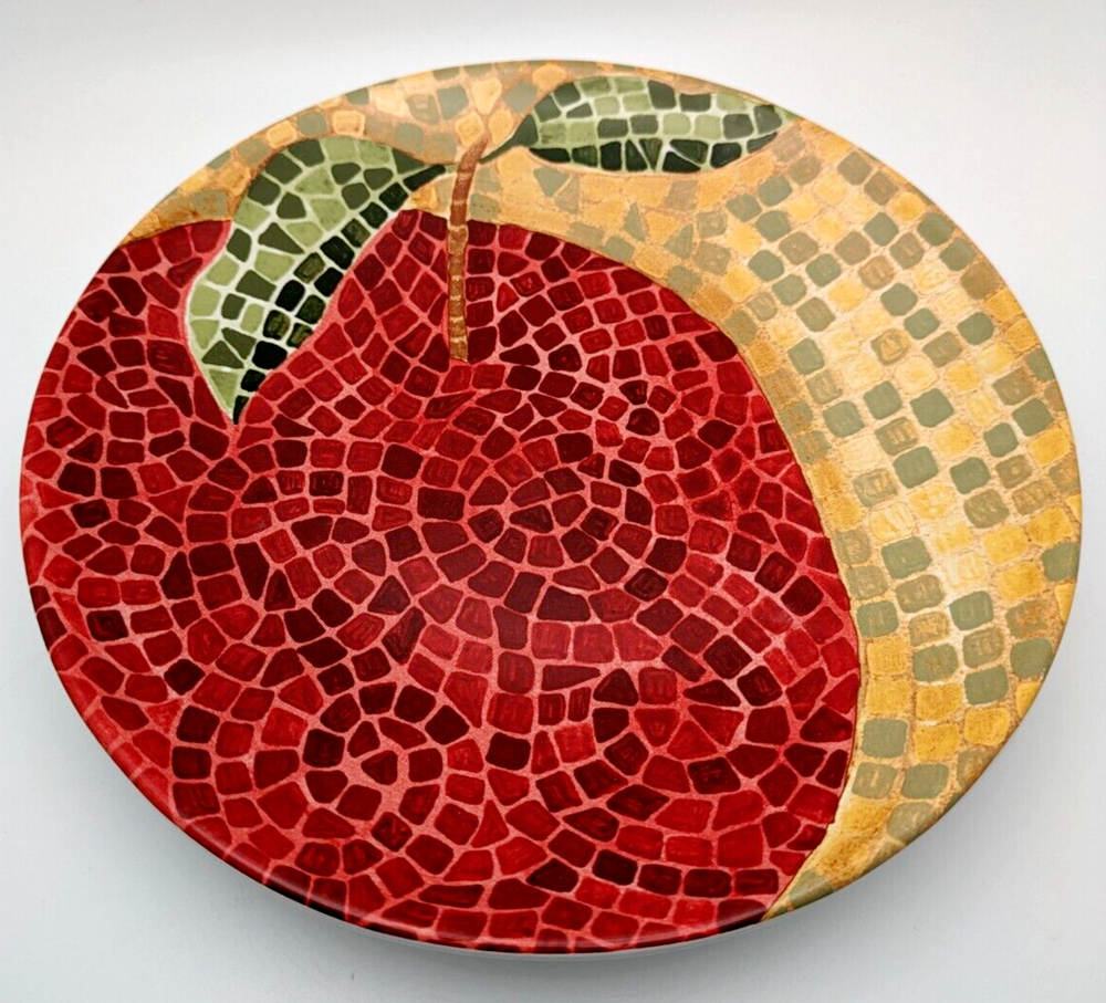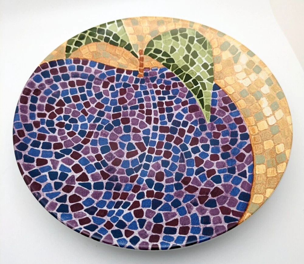 Pier 1 Fruit Mosaic Look Salad or Dessert Plates Apple Orange Plum Pear 4 Piece Set Diameter 8" Excellent Condition. No chips or cracks. Pretty! Please see pictures as they are part of the description...