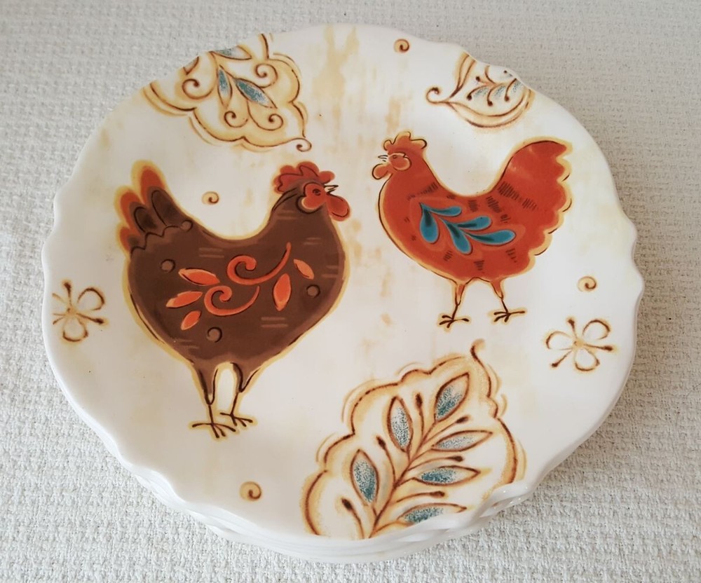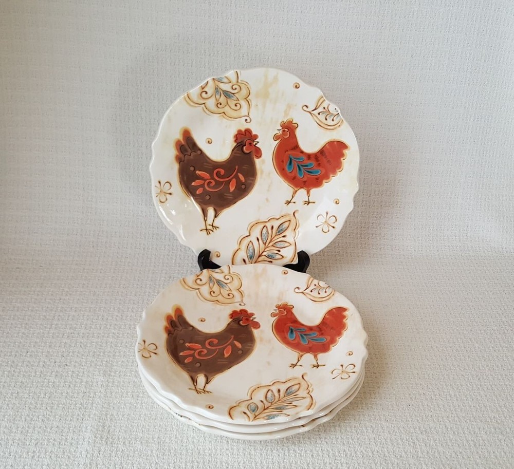 Fun set of rooster themed plates are in the Gallo pattern, from Pier 1. These ironstone salad plates are approx. 9" in diameter. They have only very minor signs of use/handling, and there are no chips...