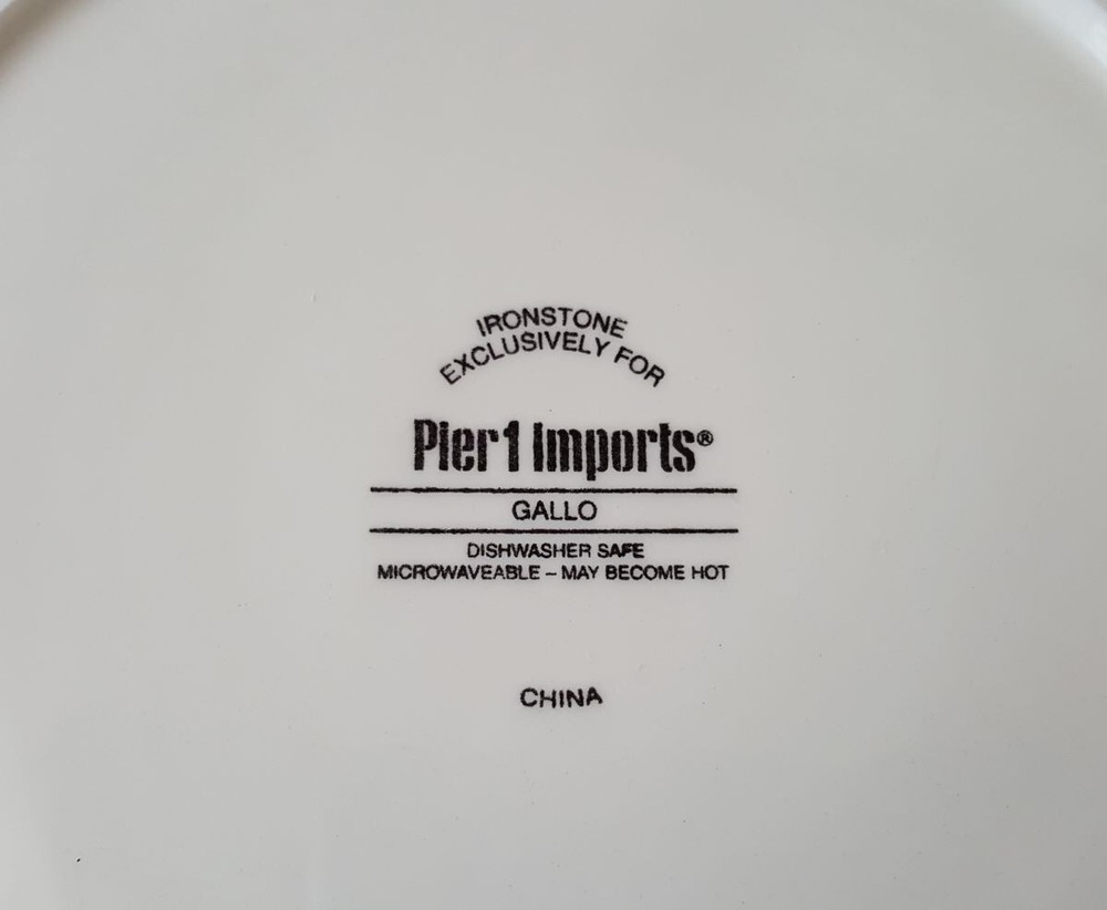 Fun set of rooster themed plates are in the Gallo pattern, from Pier 1. These ironstone salad plates are approx. 9" in diameter. They have only very minor signs of use/handling, and there are no chips, nicks or cracks.