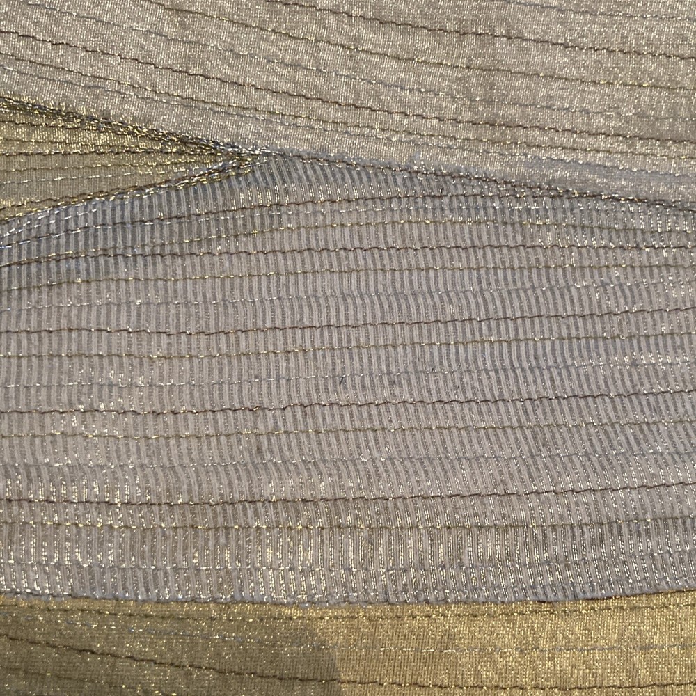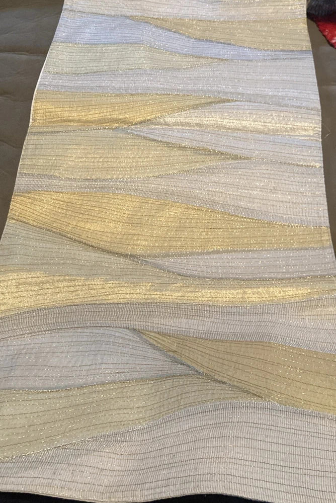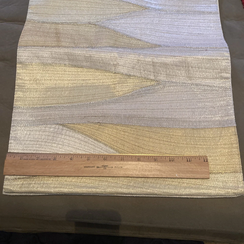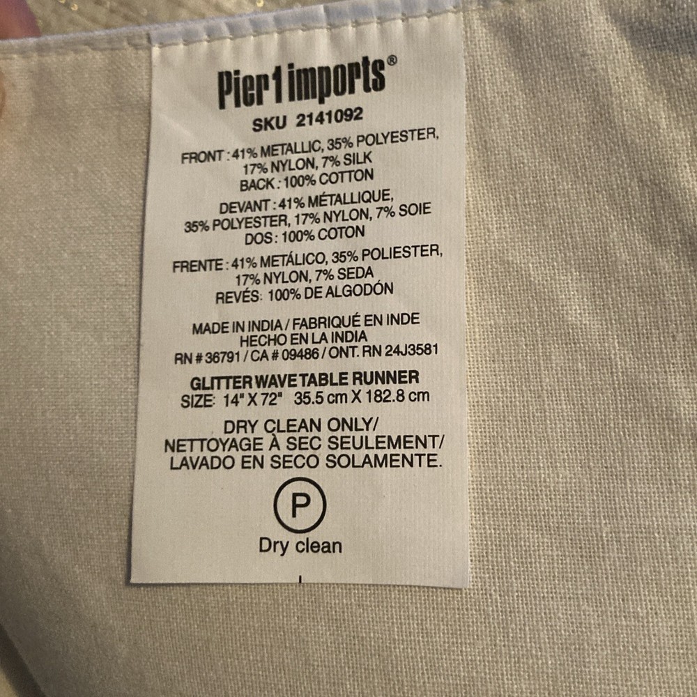Pier 1 Glitter Wave Metallic Embroidered 14" x 72" Table Runner Ivory And Gold Metallic, polyester, nylon, silk Lined backing is 100% cotton...