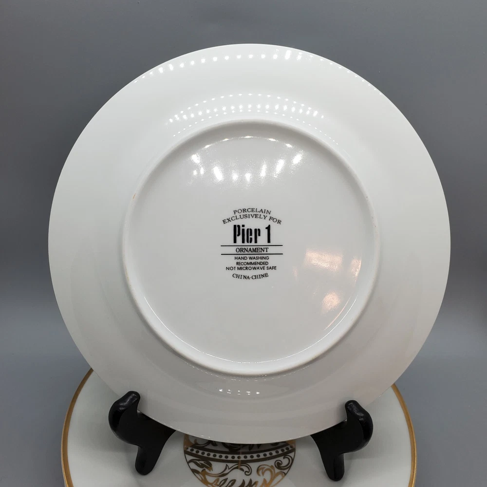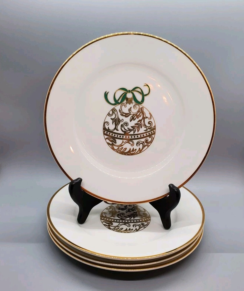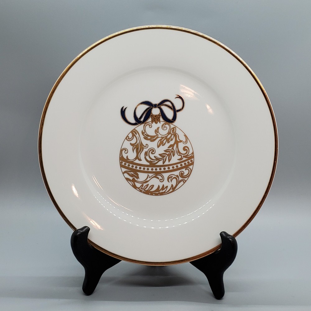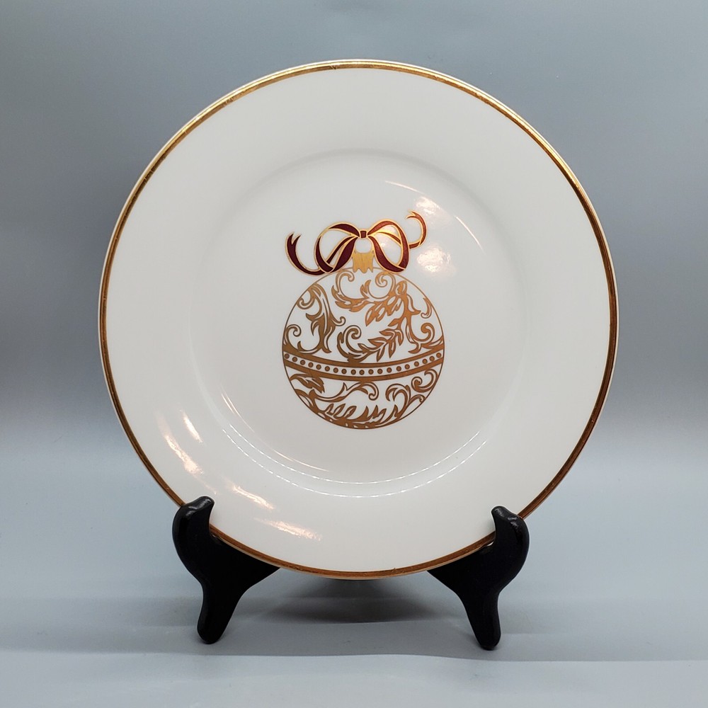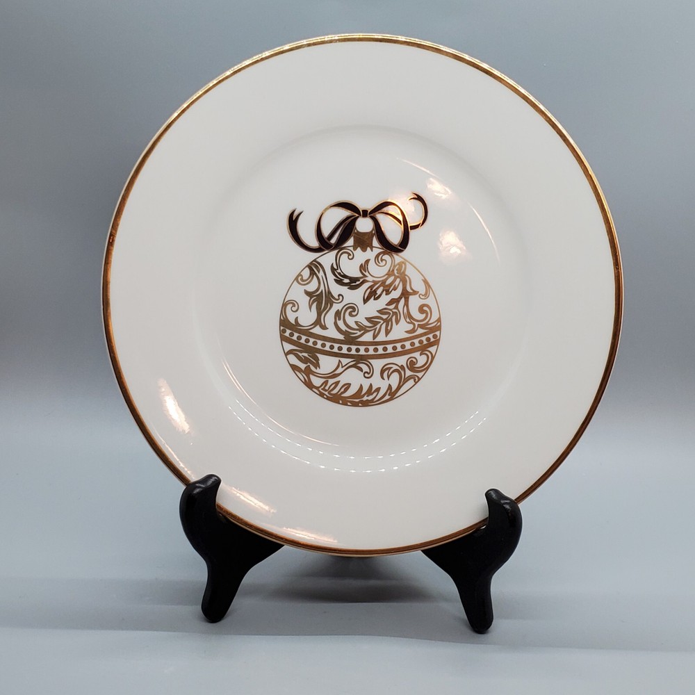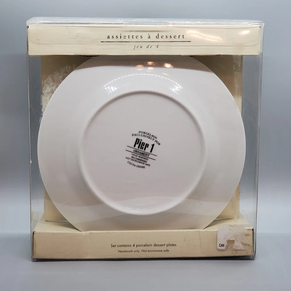 Add a touch of elegance to your Christmas dessert table with this set of four Pier 1 Christmas ornament dessert plates. These 7.5" round plates feature a beautiful white background and gold ornament pattern, perfect for the holiday season. Made of high-quality porcelain, these plates are durable and easy to clean, with care instructions recommending hand wash only. The set includes four plates, each with a different colored ribbon: green, red, blue, and black. They are in excellent pre-owned condition and come in their original packaging. Shipped with USPS Ground Advantage.