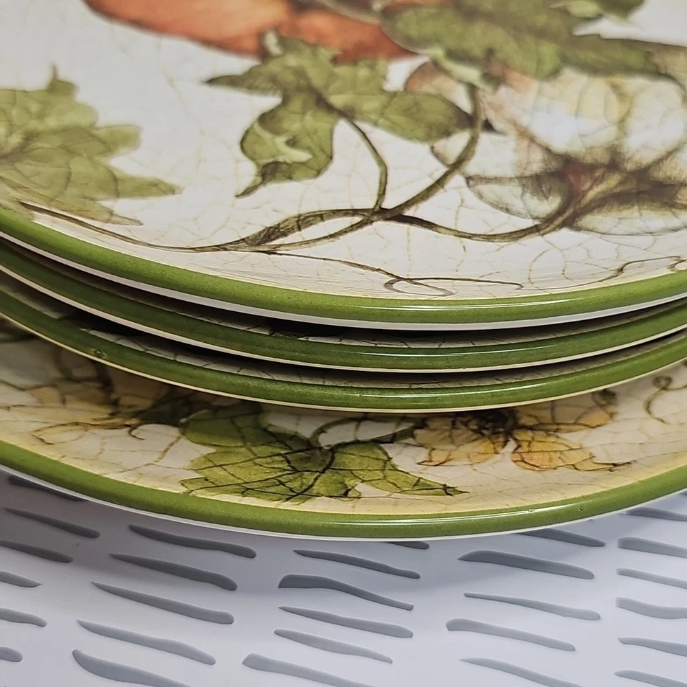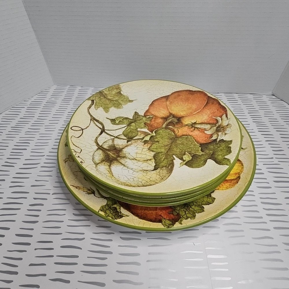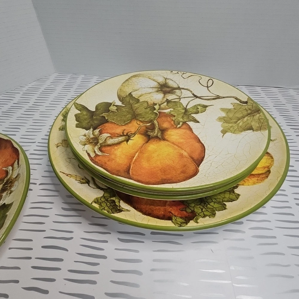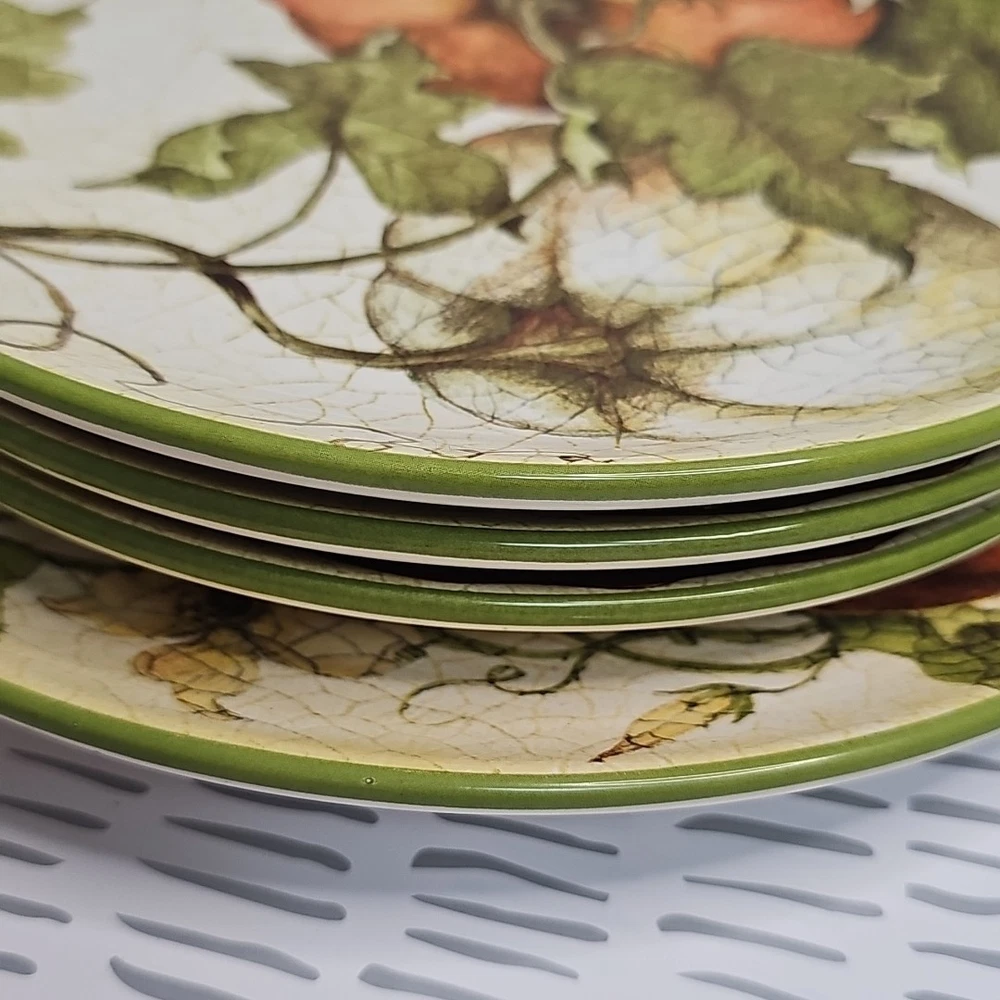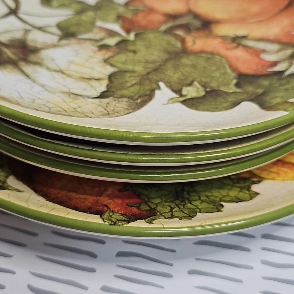Add a touch of harvest charm to your dining table with this Pier 1 Grateful Harvest Pumpkin set of 4 plates. The earthen harvest product line features a round, multicolored ceramic plates with a Harvest pattern that perfect for all occasions, Halloween, and Thanksgiving. The set includes one dinner plate and three salad plates, all dishwasher safe and decorated with pumpkins and fall-themed designs. This contemporary style plates are from the 2010-2019 era, made in China, and have a printed backstamp. The glossy finish and handcrafted design make them perfect for friends giving, and the set is great for both adult and children use. Don't miss out on this opportunity to add a touch of thanksgiving and fall to your dining table.