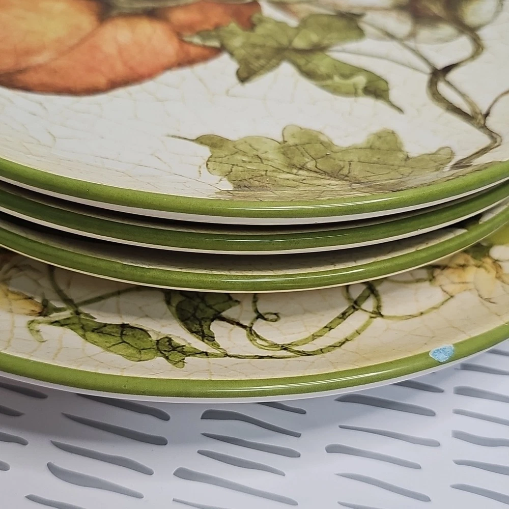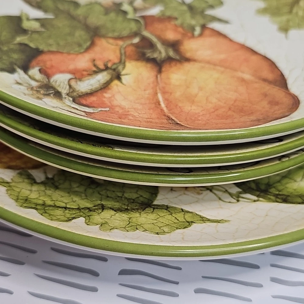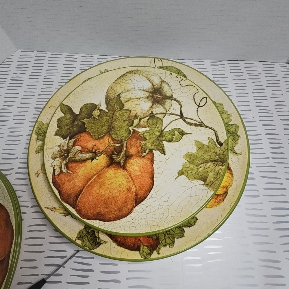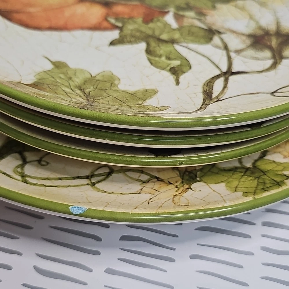 Add a touch of harvest charm to your dining table with this Pier 1 Grateful Harvest Pumpkin set of 4 plates. The earthen harvest product line features a round, multicolored ceramic plates with a Harvest pattern that perfect for all occasions, Halloween, and Thanksgiving. The set includes one dinner plate and three salad plates, all dishwasher safe and decorated with pumpkins and fall-themed designs. This contemporary style plates are from the 2010-2019 era, made in China, and have a printed backstamp. The glossy finish and handcrafted design make them perfect for friends giving, and the set is great for both adult and children use. Don't miss out on this opportunity to add a touch of thanksgiving and fall to your dining table.