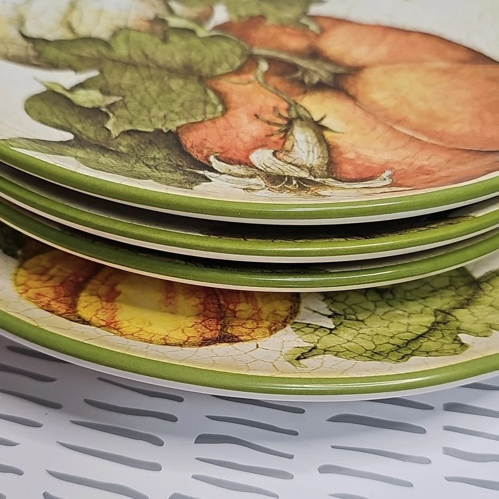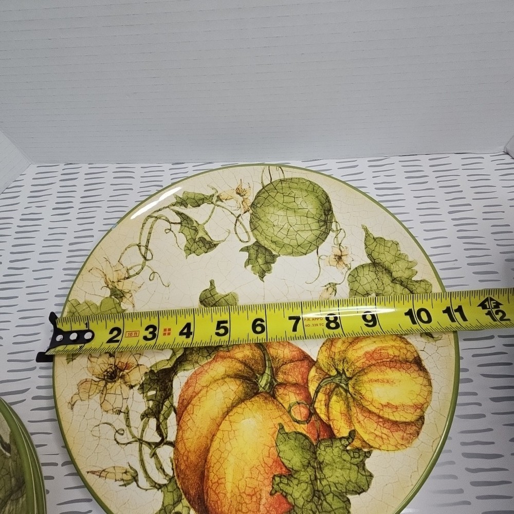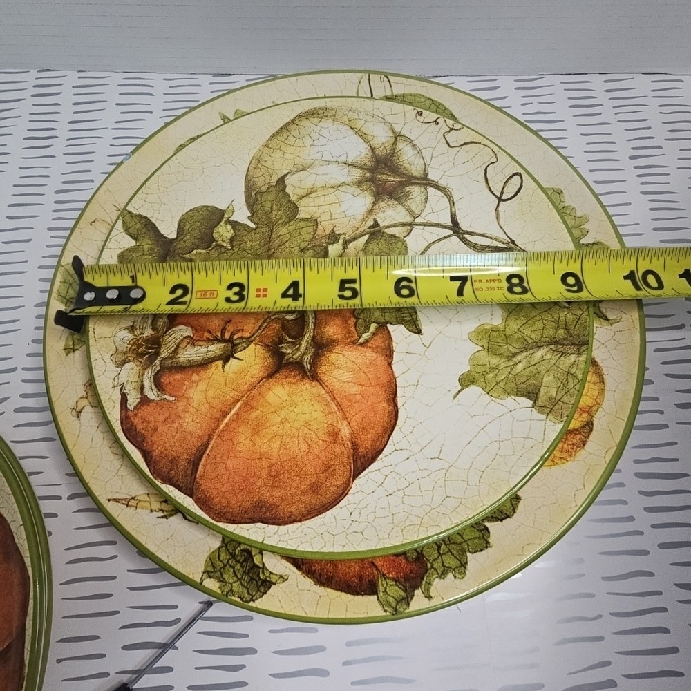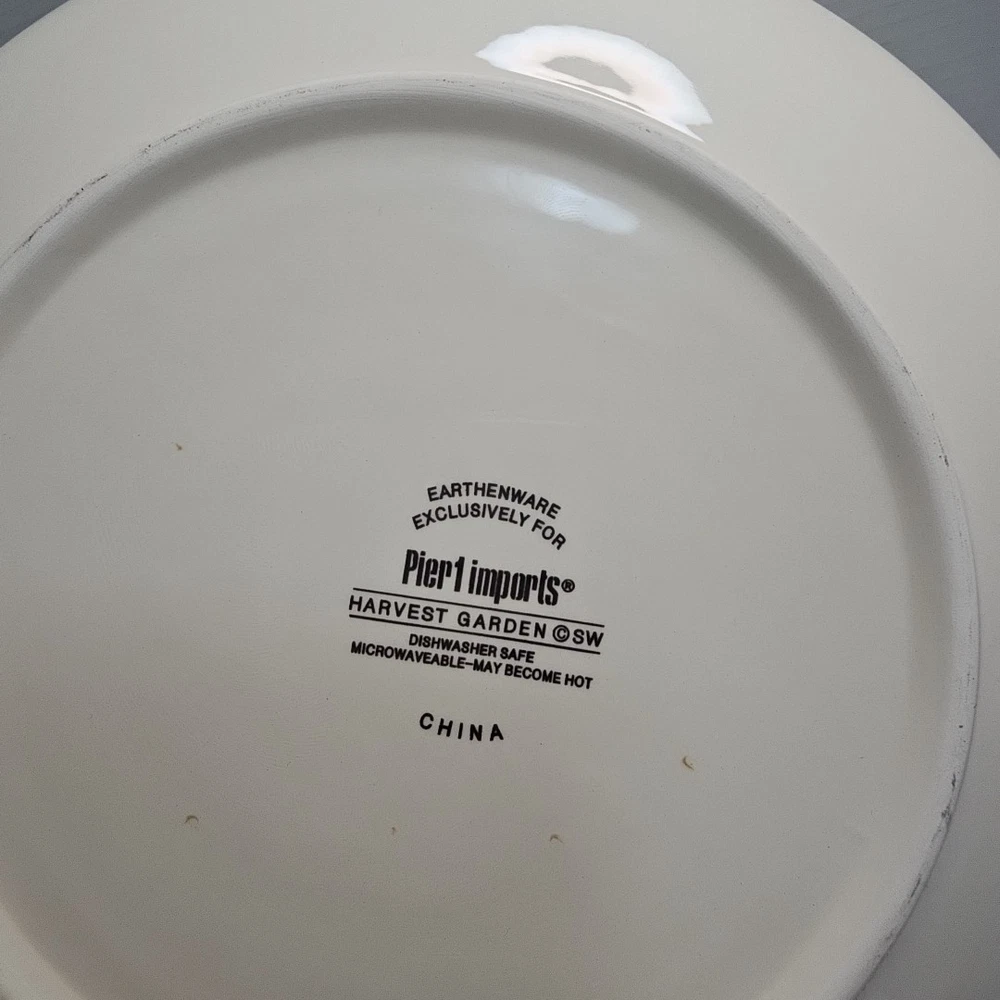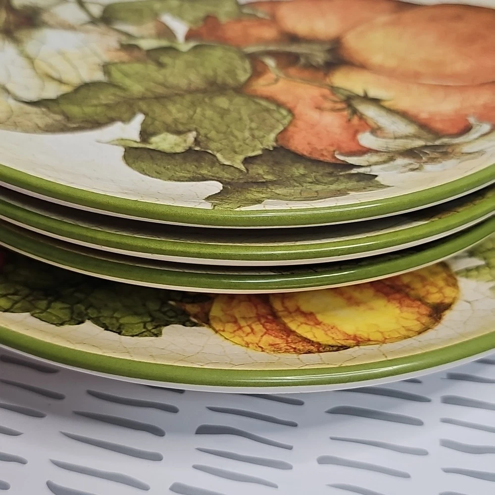 Add a touch of harvest charm to your dining table with this Pier 1 Grateful Harvest Pumpkin set of 4 plates. The earthen harvest product line features a round, multicolored ceramic plates with a Harvest pattern that perfect for all occasions, Halloween, and Thanksgiving. The set includes one dinner plate and three salad plates, all dishwasher safe and decorated with pumpkins and fall-themed designs. This contemporary style plates are from the 2010-2019 era, made in China, and have a printed backstamp. The glossy finish and handcrafted design make them perfect for friends giving, and the set is great for both adult and children use. Don't miss out on this opportunity to add a touch of thanksgiving and fall to your dining table.