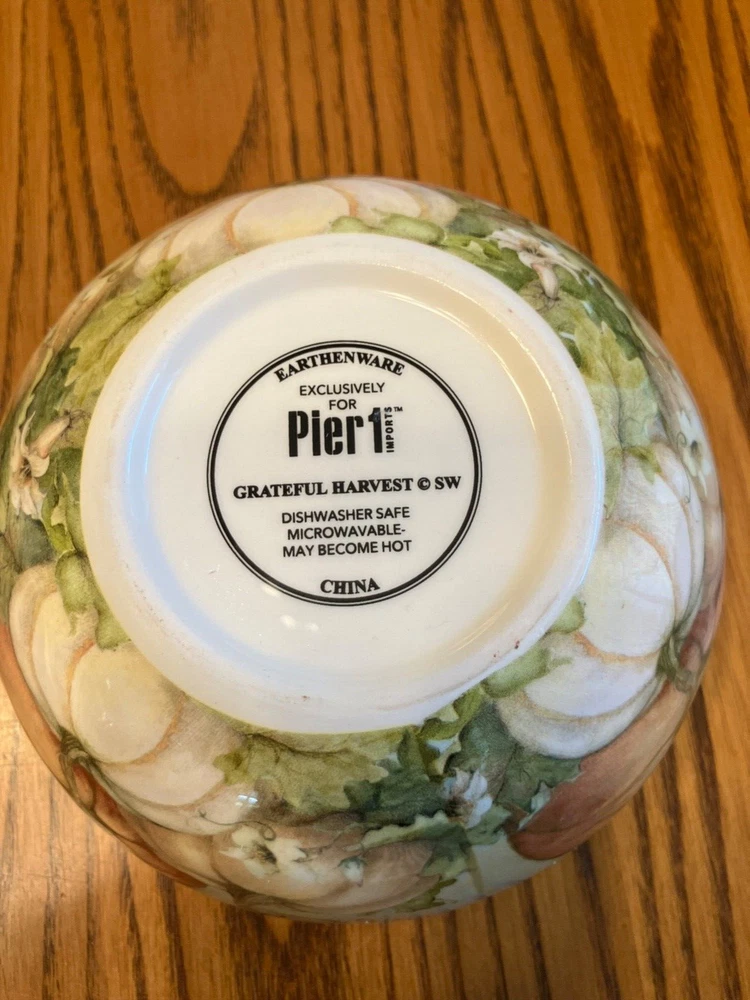 Pier 1 Grateful Harvest soup/cereal bowl. This pattern was manufactured 2018-2019 and is discontinued. In excellent condition, with no chips, cracks, crazing, staining, or utensil marks. Measures 6" diameter by 3" tall. Earthenware bowls is dishwasher and microwave safe. See my feedback and buy with confidence. From a smoke-free home. I do my best to accurately describe and photograph all of my items, so please read descriptions and view all photos before bidding. Feel free to message me with any questions or if you would like additional photos. Payment is due within 3 days of auction ending. I ship fast, usually within 24 hours of receiving payment, but please remember that I have no control over shipping speed once I drop your package off at the post office. I wrap and package all of my items very carefully as I know the heartache of receiving something damaged. I want to you to be happy with your purchase so please contact me before leaving feedback should there be a problem so that I can make things right. Returns accepted only if I have misrepresented an item. Thanks for looking and be sure to check out my other listings. I am happy to combine shipping when possible.