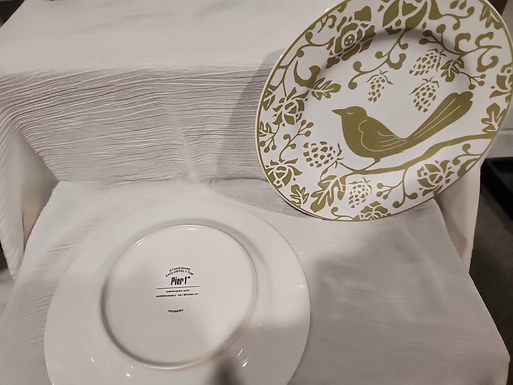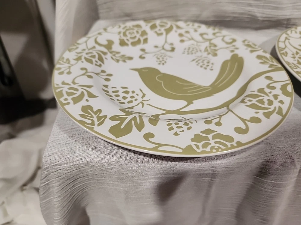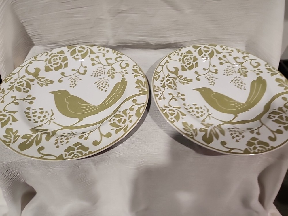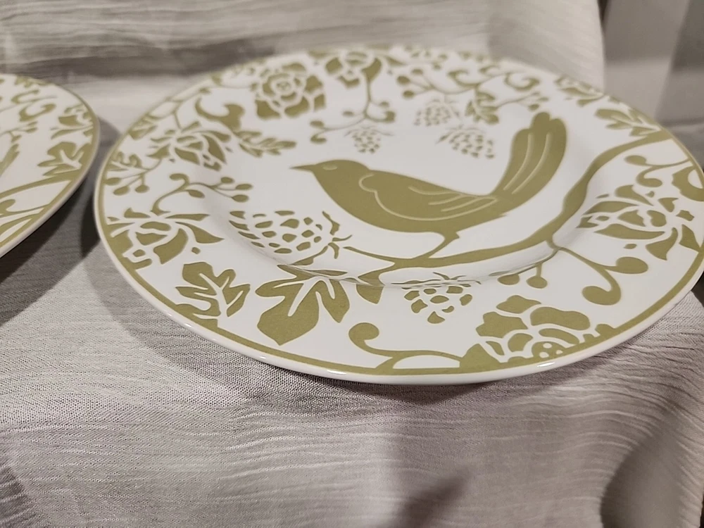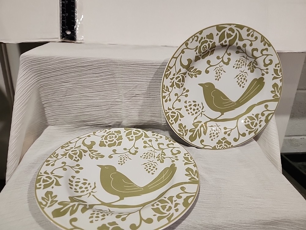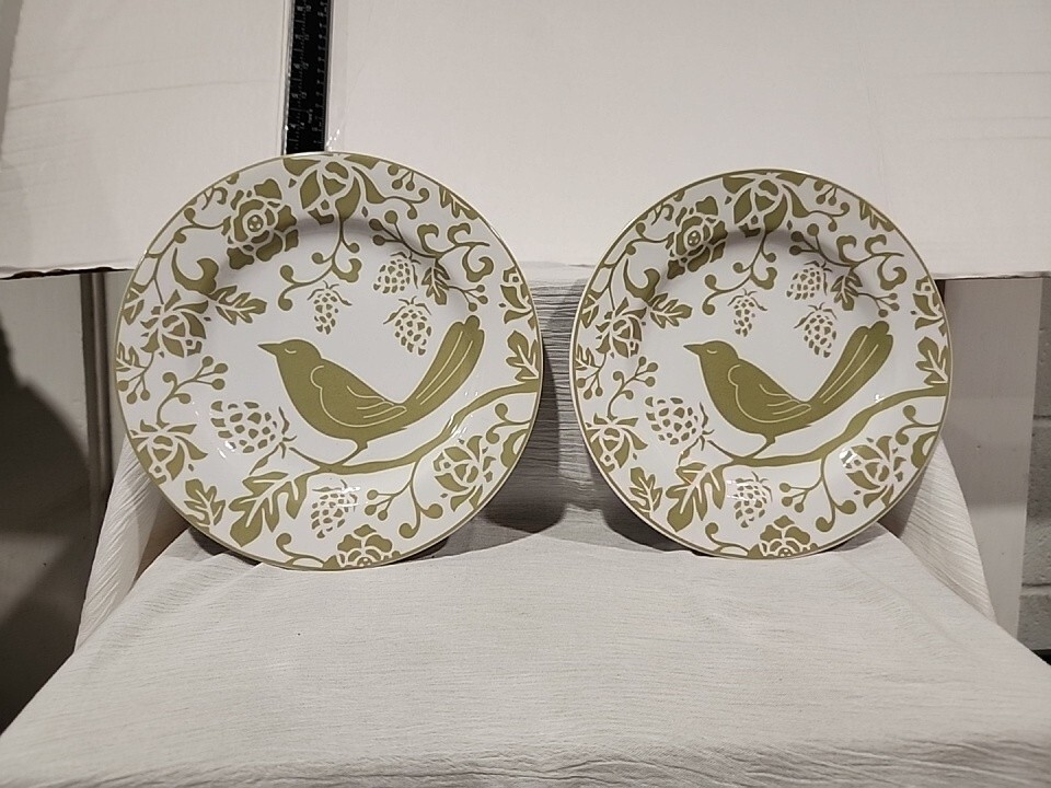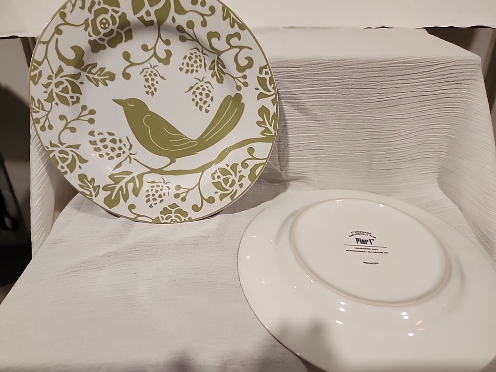 Add a touch of nature to your dining table with this beautiful set of Pier 1 Green Bird Salad Plates. Crafted from high-quality stoneware, these plates feature a unique bird pattern that is perfect for any bird lover. The plates measure 8-1/2" in diameter, making them ideal for serving salads or desserts. The set includes two plates and is perfect for adding a pop of color to your table setting. The green color is vibrant and adds a touch of freshness to your meal. These plates are perfect for any occasion, whether it's a casual family dinner or a formal dinner party.