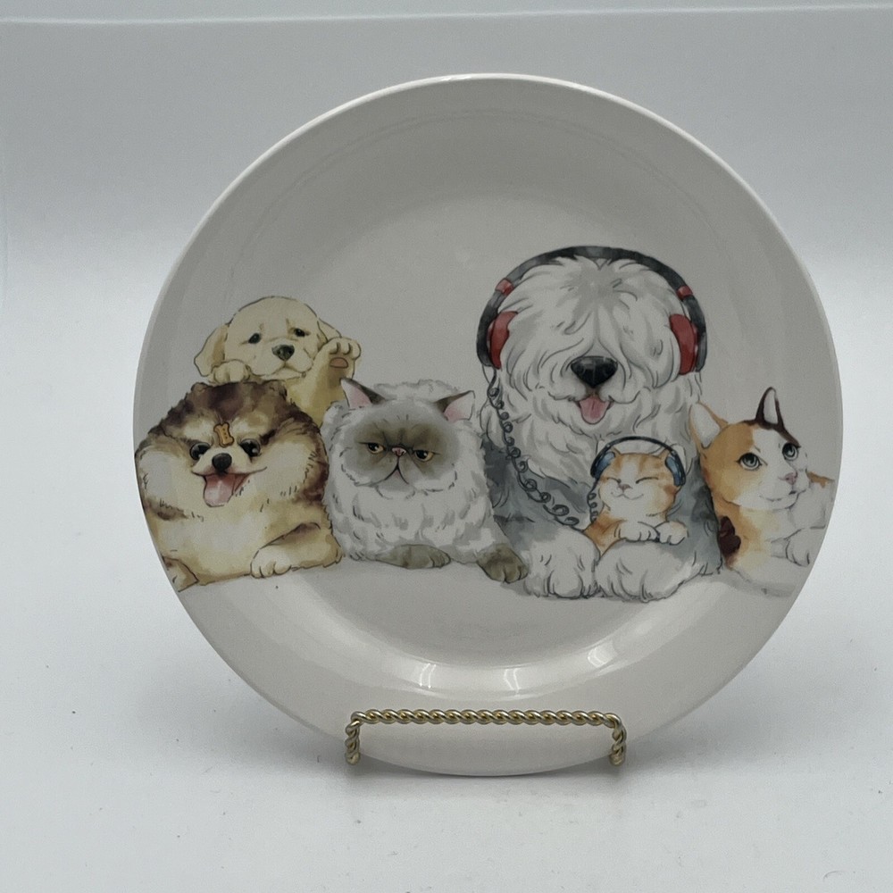 This unique vintage Pier 1 Imports plate features an adorable design of dogs and cats in a round shape, perfect for all occasions. The multicolor pattern is made of high-quality ceramic material and includes a dessert and salad plate set. The plate is microwave and dishwasher safe, as well as decorative, making it a perfect addition to any kitchen. The art pottery production style, printed backstamp, and glossy finish are all indicative of the high-quality production technique used in China. This original piece is perfect for collectors and animal lovers looking for a functional and visually appealing addition to their home.