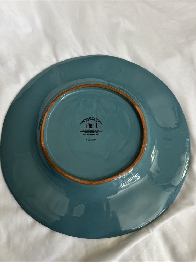The Pier 1 Hand-painted Earthenware Plate Set includes six round dinner plates with a diameter of 11 5/8 inches, featuring a glossy finish in a multicolor pattern called Nuevo Organic Blu. These contemporary style plates are stackable, dishwasher safe, and hand painted, making them ideal for all occasions. Made in America with a production technique of pottery, these plates are machine washable and come in a set that includes dinner plates. The stylish design and decorative features of these earthenware plates make them a perfect addition to any table setting.