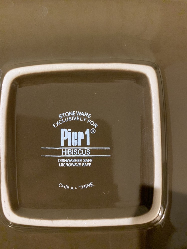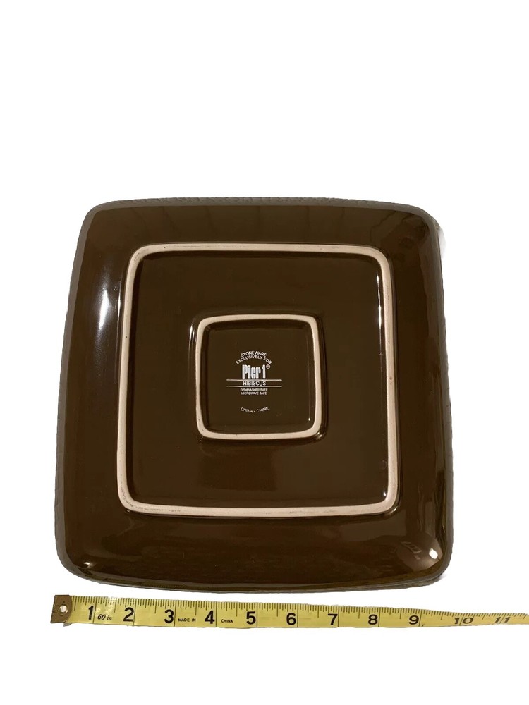 Pier 1 Hibiscus Dinner Plate 10x10 Teal & Brown Underside Replacement Piece 2006 Pier 1 Hibiscus Dinner Plate, featuring a square shape with a glossy finish, this dinner plate is perfect for all occasions. The teal and brown color combination adds a pop of color to your dining table, making it perfect for dining or simply collecting. Crafted from high-quality stoneware, this contemporary original plate is an ideal replacement piece for your dinner set. The 21st-century design makes it a vintage collectible. Perfectly suitable for use, this Hibiscus Dinner Plate is a must-have for the dinnerware enthusiast. Thank you for your interest " )