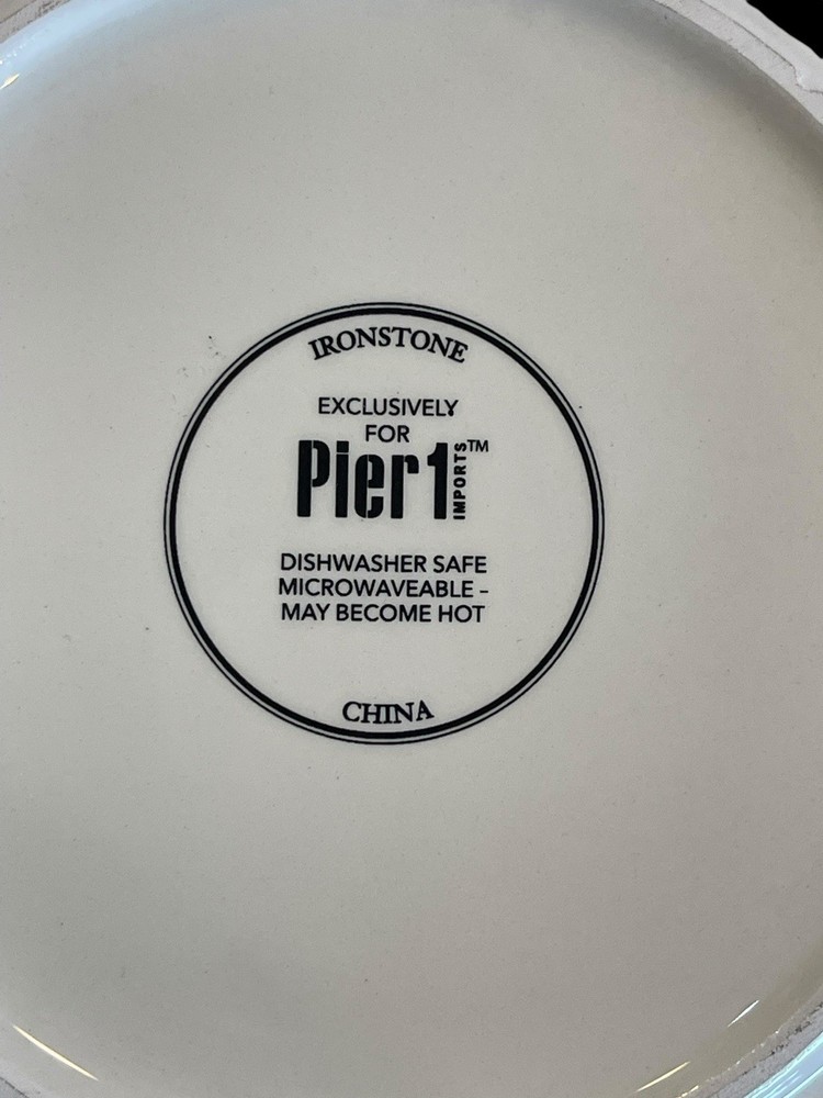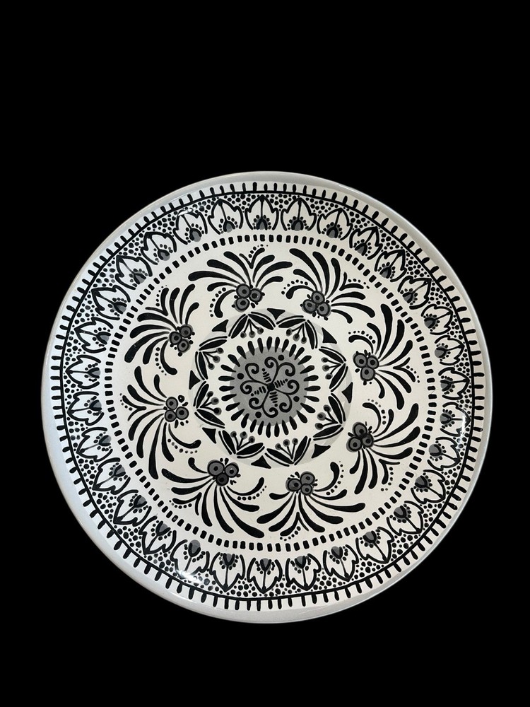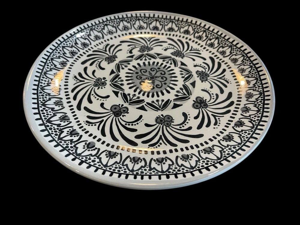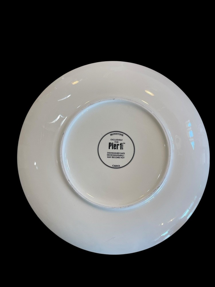 The product is an 8.75" black and white Moroccan design salad plate replacement by Pier 1. Made of ceramic, this floral patterned plate is perfect for serving salads in a stylish and unique way. This one-piece set includes a single salad plate that adds a touch of Moroccan flair to your dining table. 8.75” diameter Excellent !!