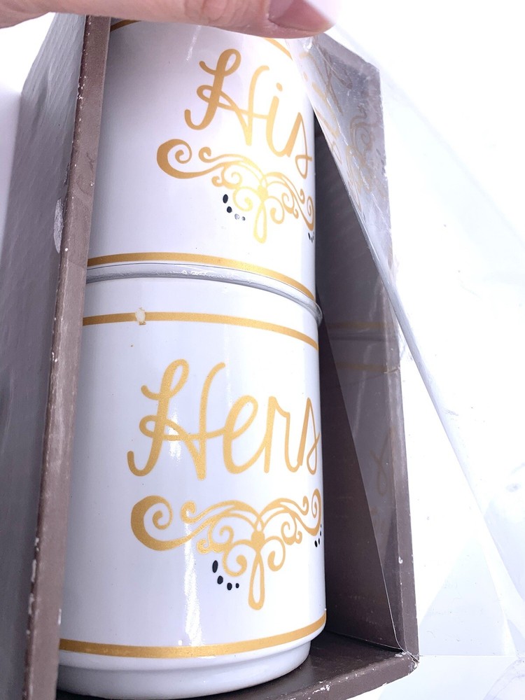 Pier 1 Import His and Hers Coffee Mugs Set NIB Gold Tone Design. Box P13