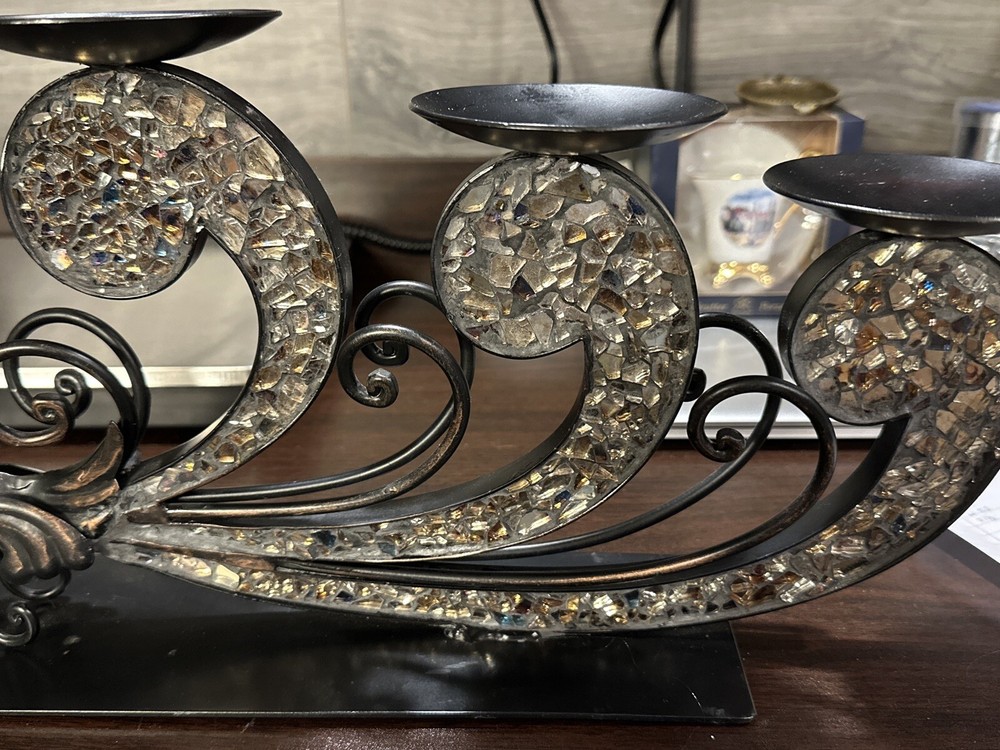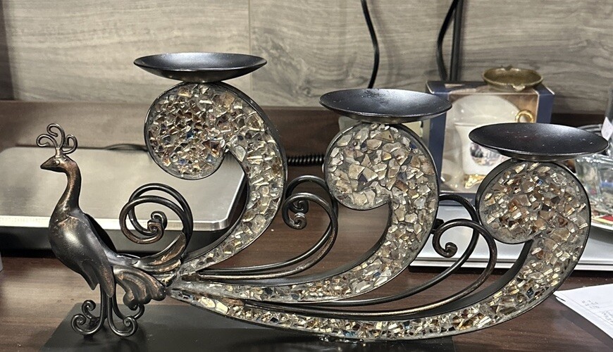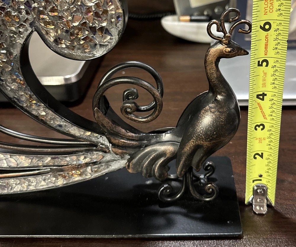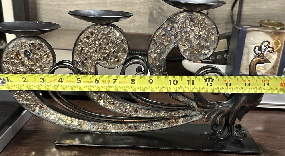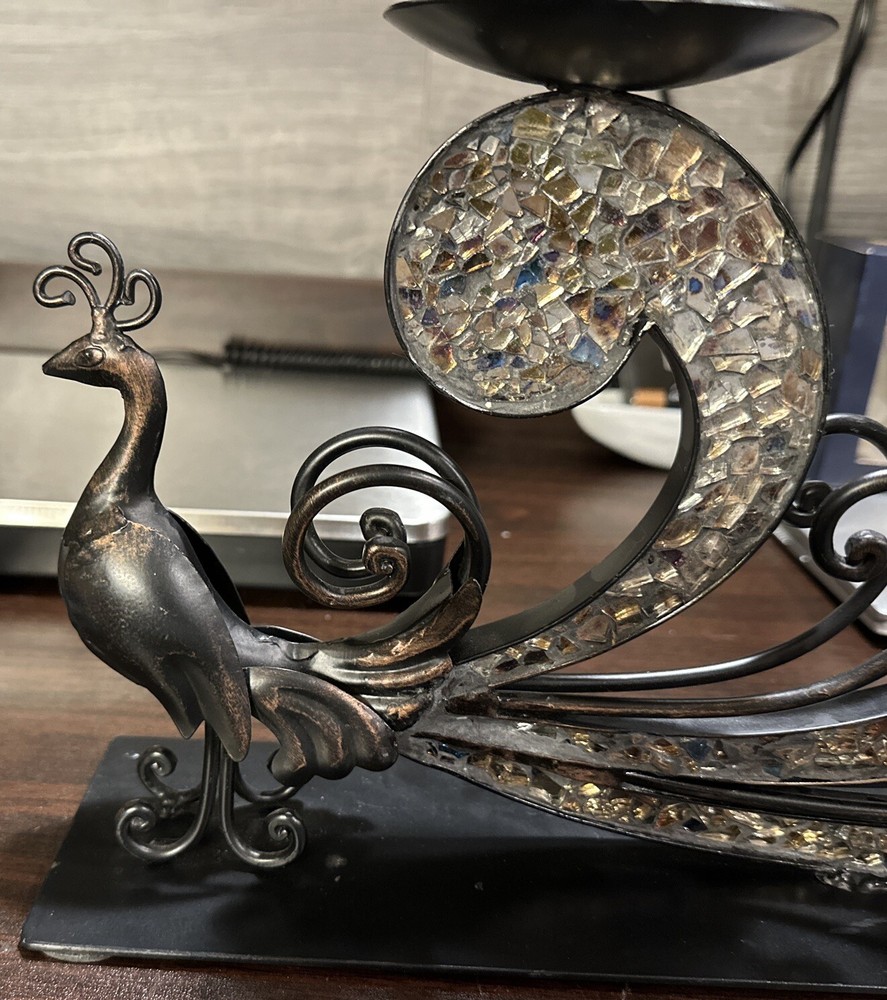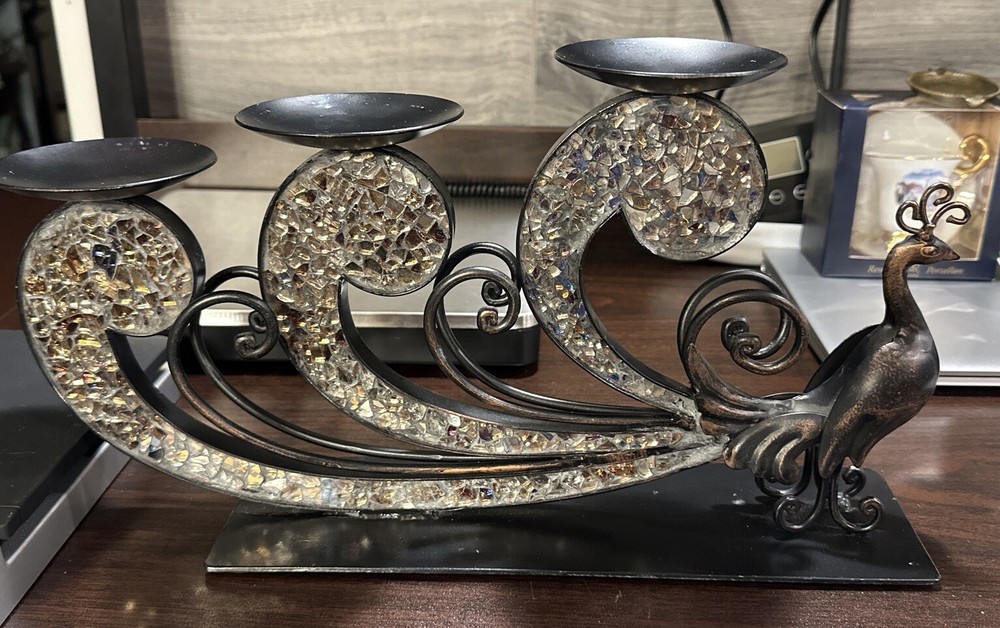 This Pier 1 Import Metal Ornate Peacock 3 Candle Holder is a unique and stunning piece that is suitable for any room. It is made of black glass with mirrored tiles and has a beautiful peacock design, making it a great addition to your furniture. The candle holder is medium-sized, measuring 15.5 inches in length, 9.5 inches in height, and 4 inches in width. It features an abstract pattern and metallic finish, giving it a vintage 1970s style. This item is not handmade and comes unboxed, but it is in excellent condition.