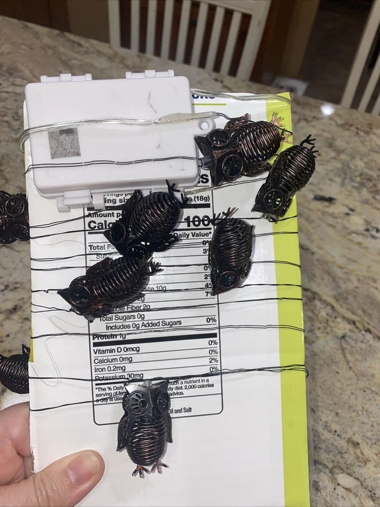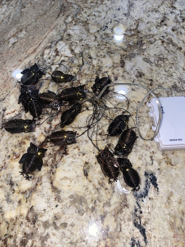 Add a touch of elegance to your home decor with this stunning Pier 1 Imports 10' LED Bronze Metal Owl Glimmer String. The string features 1.75" LED lights in a white color that create a mesmerizing ambiance. The owl character adds a unique touch to the design, making it perfect for all occasions. Crafted from high-quality metal, this glimmer string is durable and long-lasting. The battery-powered source ensures that you can enjoy the lights for hours without worrying about cords or outlets. Ideal for holiday and seasonal dΓ©cor, this string light is a must-have accessory for any home. WORKS GREAT. BATTERY PACK MISSING one CLIP BUT STILL WORKS PERFECT even with battery pack open. BOX NOT INCLUDED.