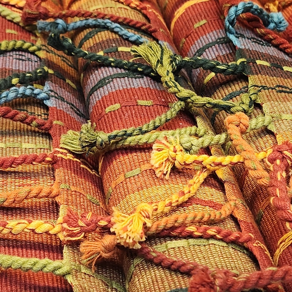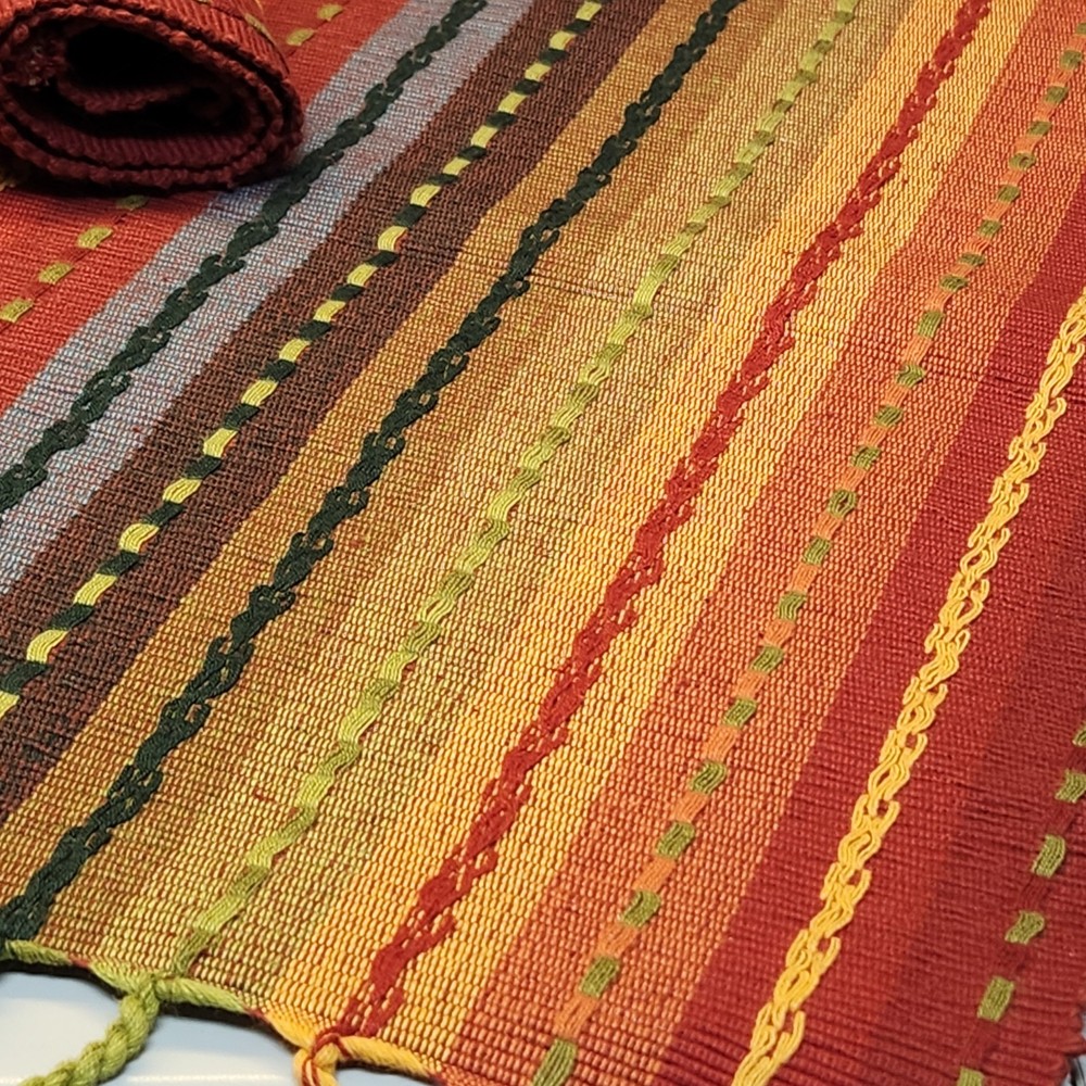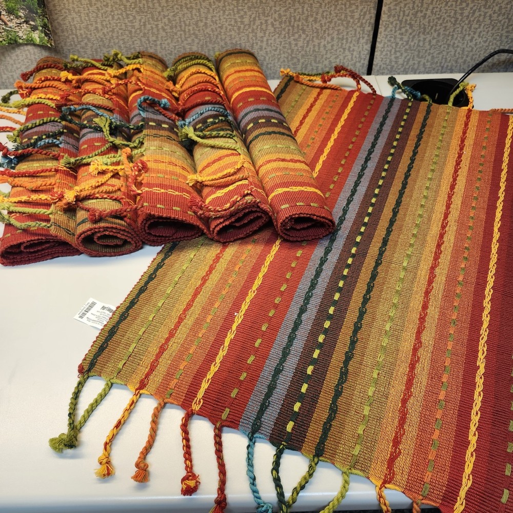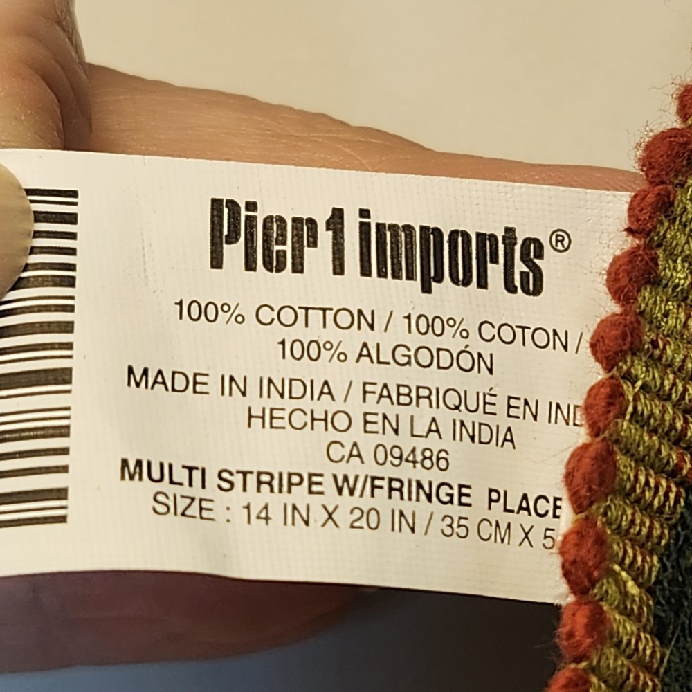 The Pier 1 Imports 14x20" Placemats are a set of 6 multi-stripe placemats in multicolor with fringe detailing, perfect for adding a touch of bohemian fashion to your dining table. Made from 100% cotton and woven in India, these rectangular placemats are versatile for various occasions.