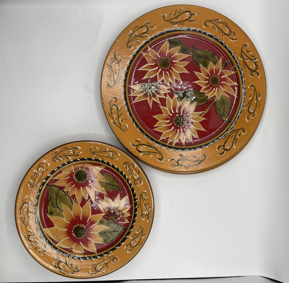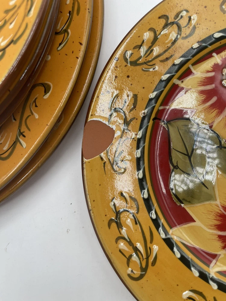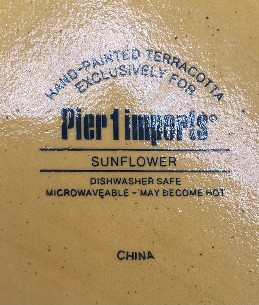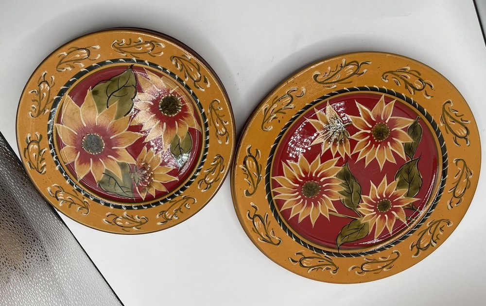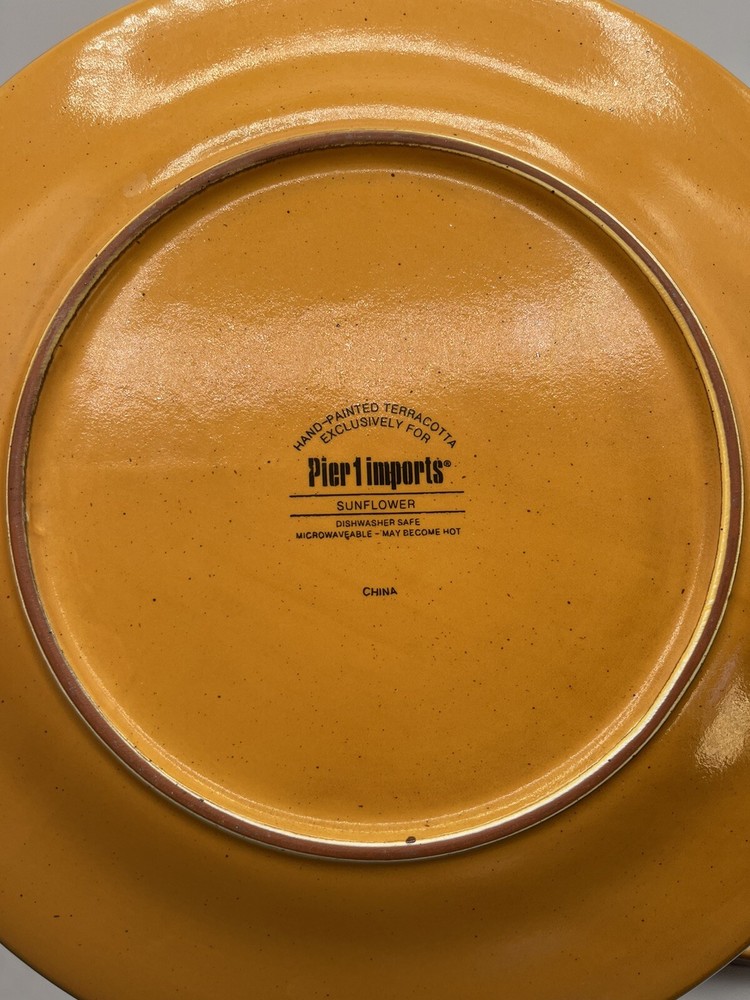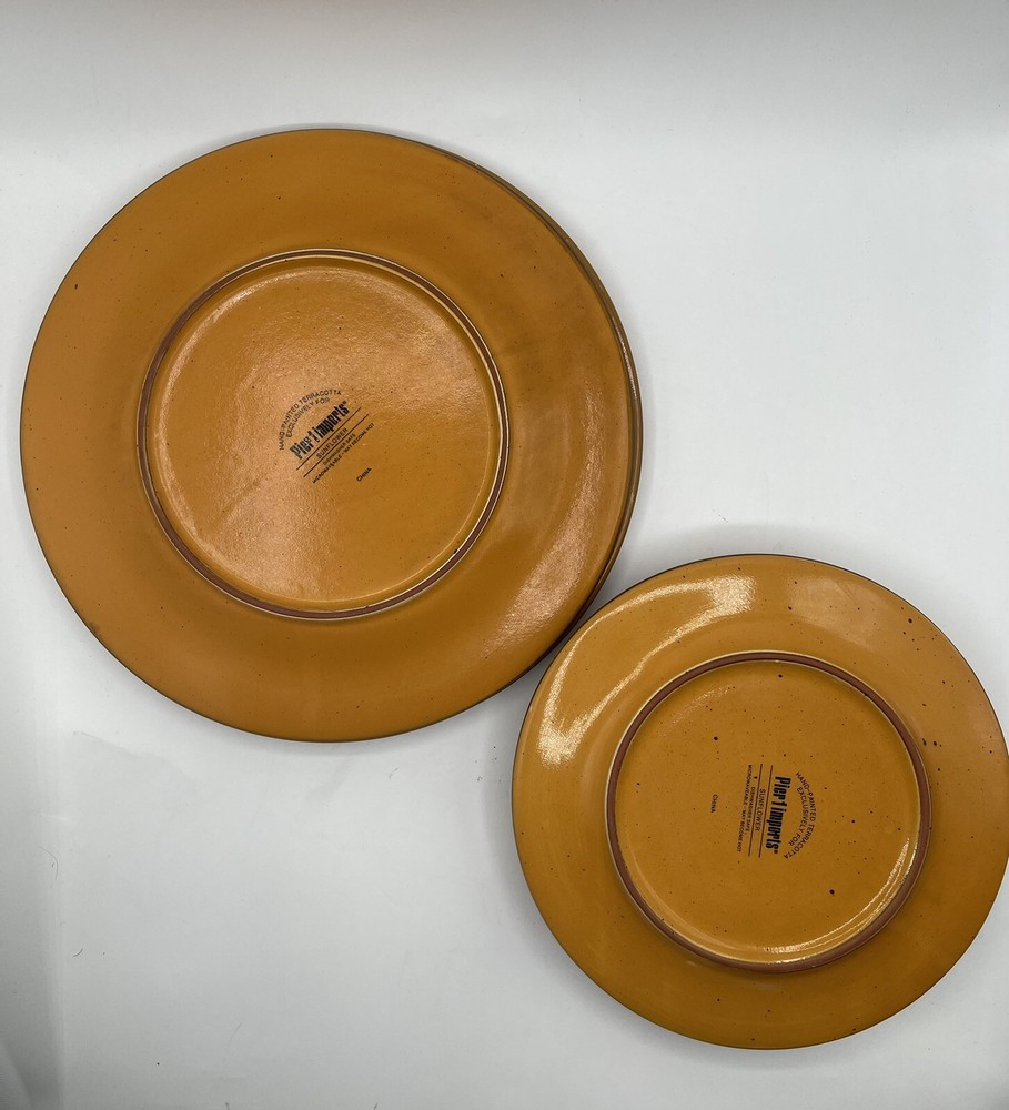 Add a touch of elegance to your dining table with this six-piece set of Pier 1 Imports hand-painted terracotta plates. The plates come in two sizes, 10.5 inches and 8 inches, and feature a beautiful sunflower pattern in multicolor. The round plates are made of lead-free glazed material and have a printed backstamp. This set includes salad and dinner plates, perfect for serving your loved ones in style. The plates are manufactured in China and are part of the Pier 1 product line. With their exquisite design and high-quality finish, these plates are sure to impress your guests. One of the salad plates has a chip, pictured.
