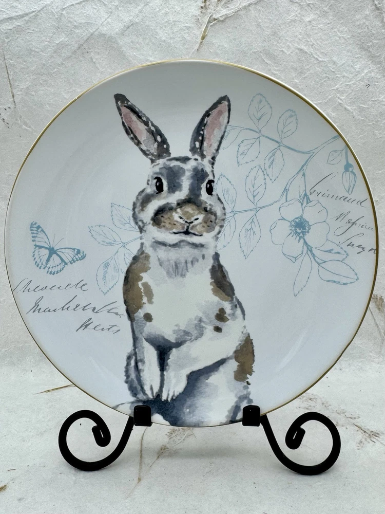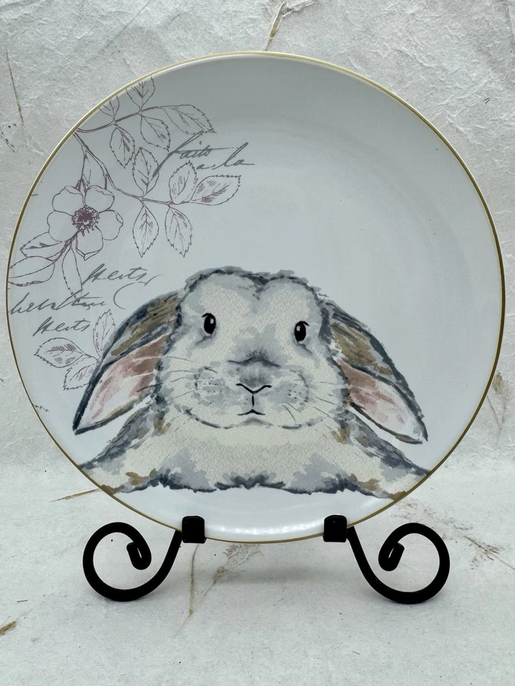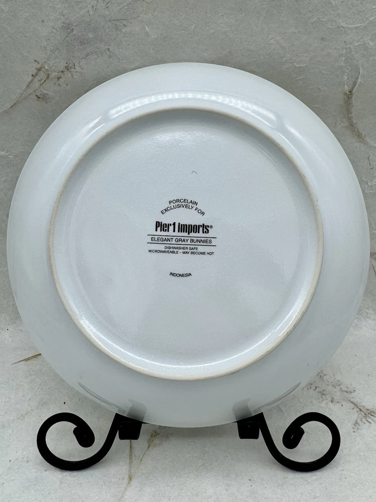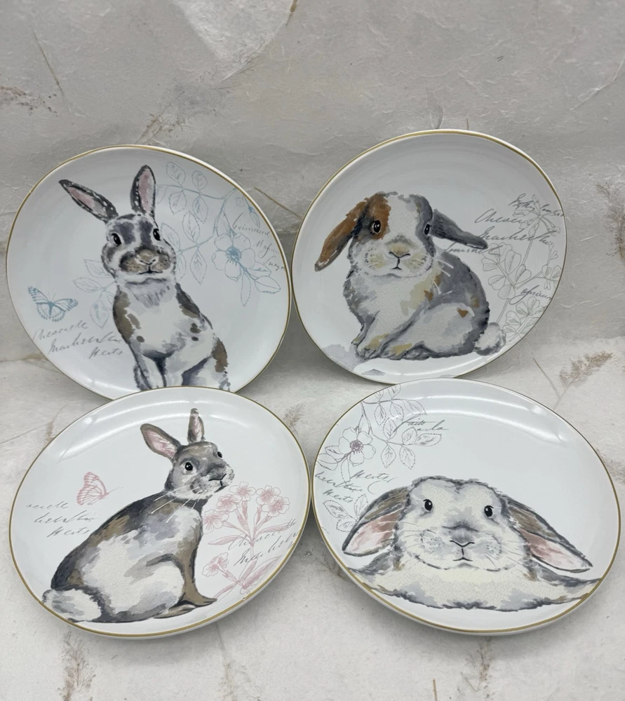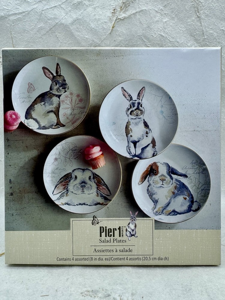 π The Pier 1 Imports 4 Easter Elegant Gray/Brown Bunny Rabbit 8" Salad Dessert Plates set features four porcelain plates with a multicolor bunnies pattern, each depicting a different design of rabbit. π These round plates are 8 inches in diameter, making them perfect for serving appetizers or salads during spring occasions like Easter. π The plates are microwave(may become hot) and dishwasher safe, adding convenience to their stylish and spring-themed design. ππ These are new in box. NOTE: one plate has minor manufacturer flaws. SEE PICTURES! Smoke free environment. π Please view photos for closer inspection and more details. Thanks for shopping π