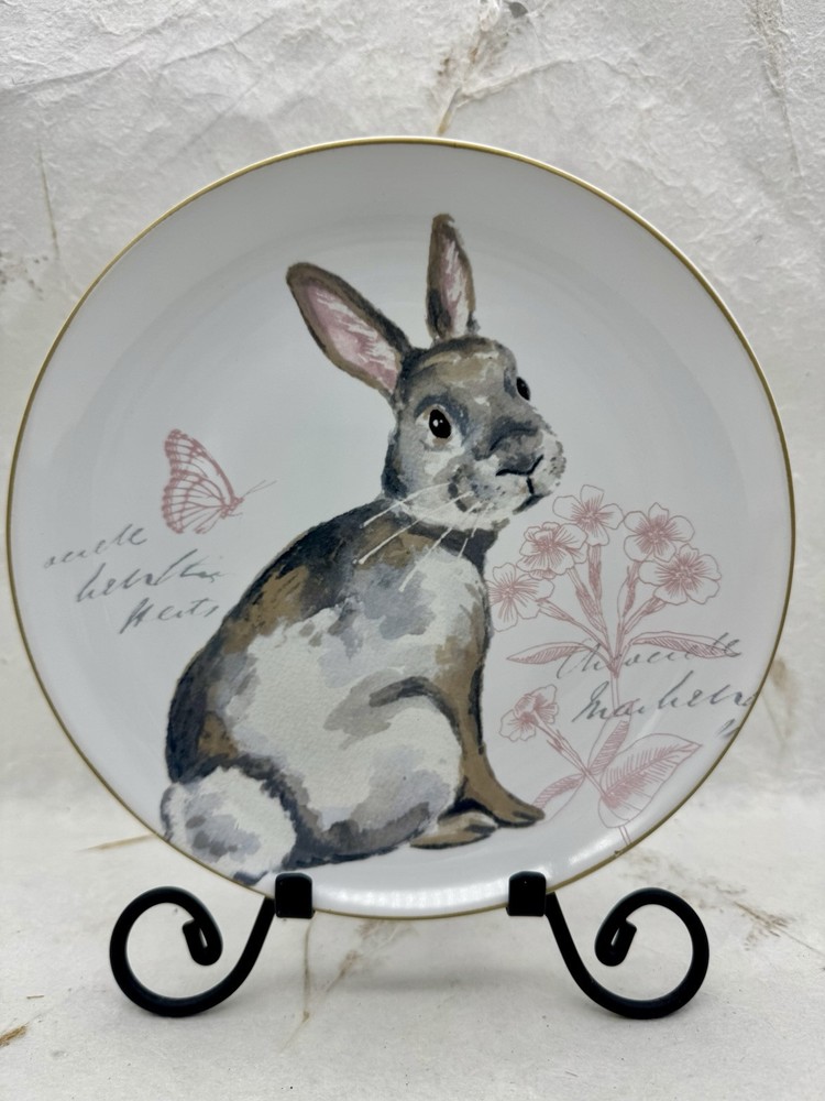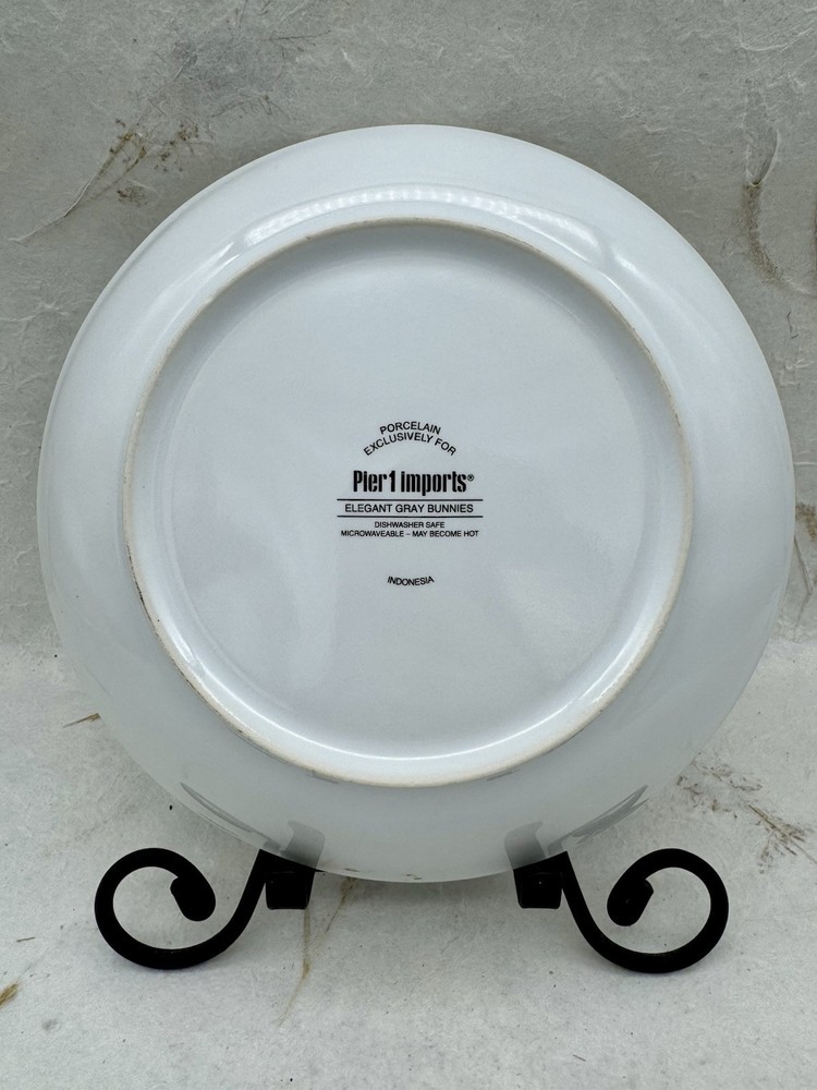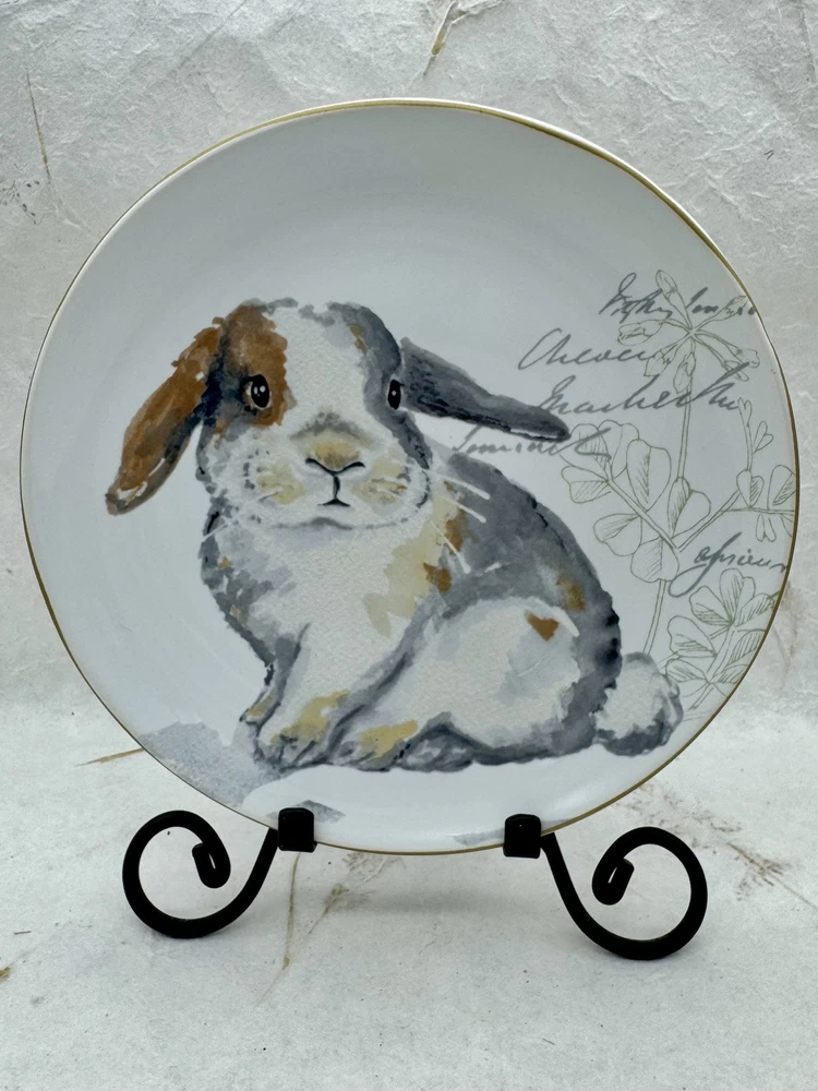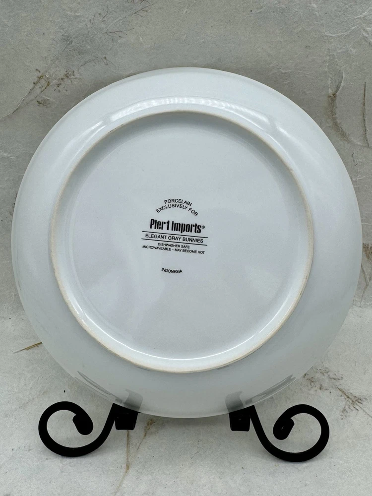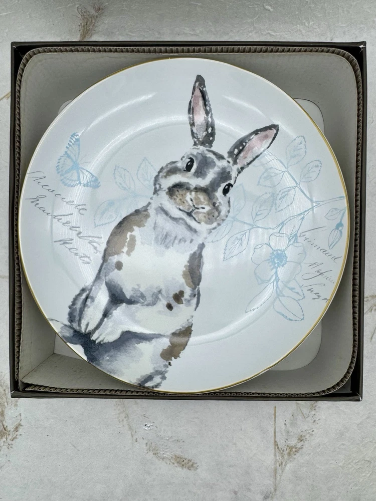 π The Pier 1 Imports 4 Easter Elegant Gray/Brown Bunny Rabbit 8" Salad Dessert Plates set features four porcelain plates with a multicolor bunnies pattern, each depicting a different design of rabbit. π These round plates are 8 inches in diameter, making them perfect for serving appetizers or salads during spring occasions like Easter. π The plates are microwave(may become hot) and dishwasher safe, adding convenience to their stylish and spring-themed design. ππ These are new in box. NOTE: one plate has minor manufacturer flaws. SEE PICTURES! Smoke free environment. π Please view photos for closer inspection and more details. Thanks for shopping π