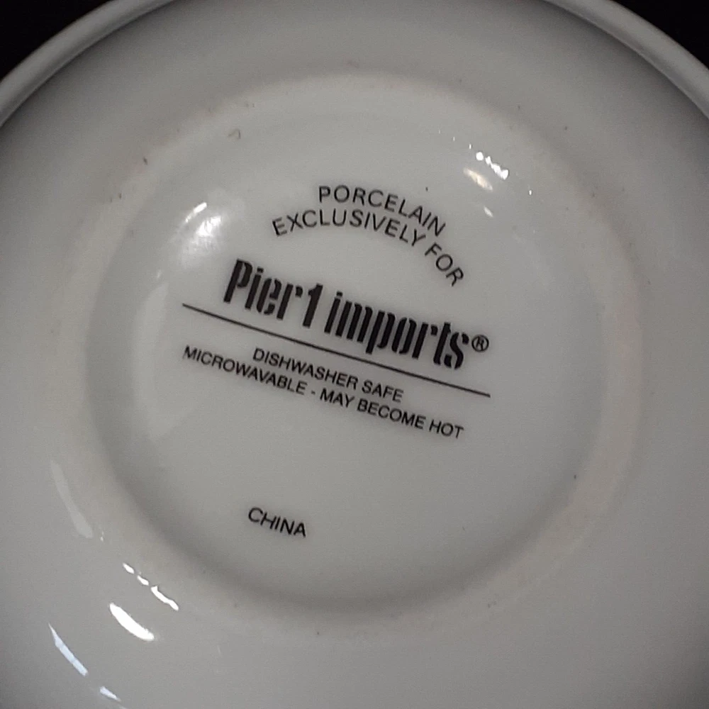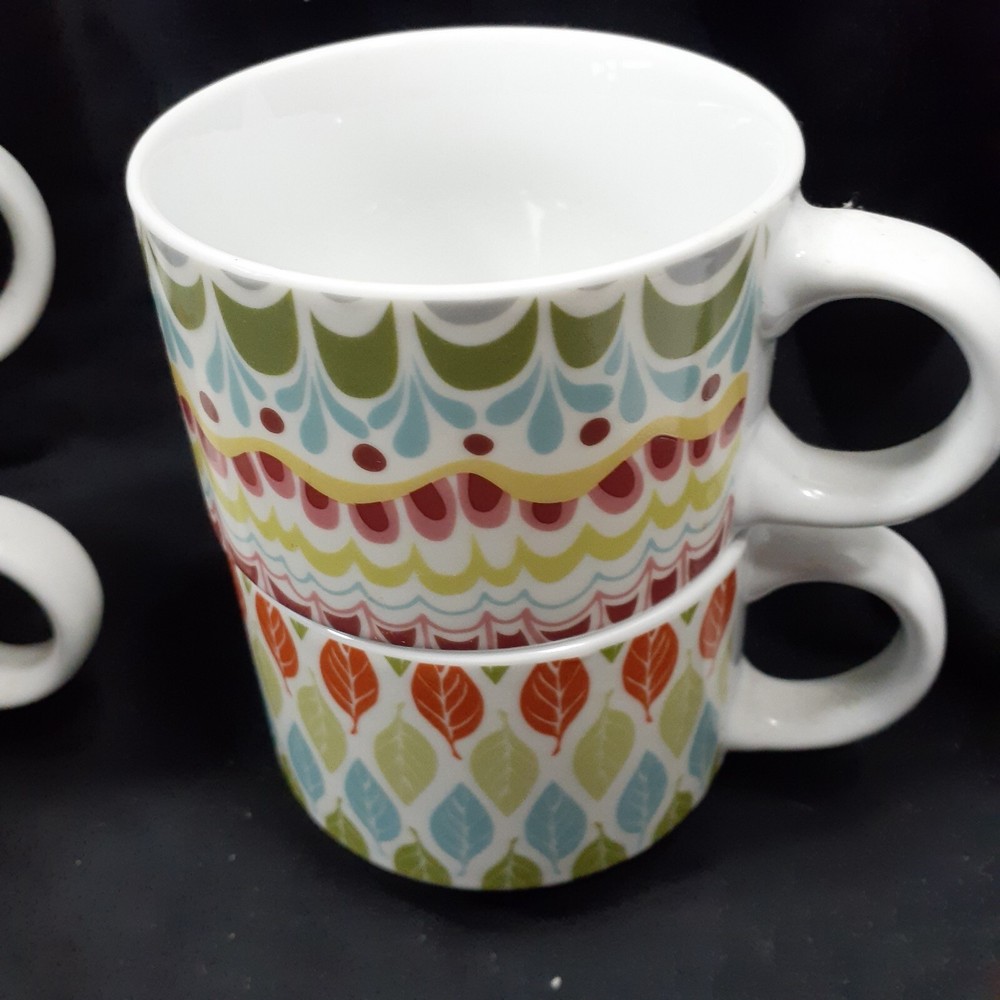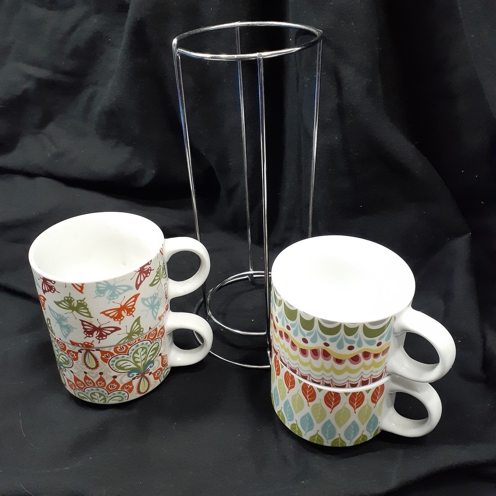 Pier 1 Imports coffee, tea, hot coca mug set. The set includes four stackable cups/mugs and a stand, featuring a beautiful butterflies and leaves design in multicolor. Made of porcelain, Capacity: 8 fl oz The round shape and stackable feature make this set a great addition to any kitchen or dining table. 4 Stackable mugs and silver metal stand.