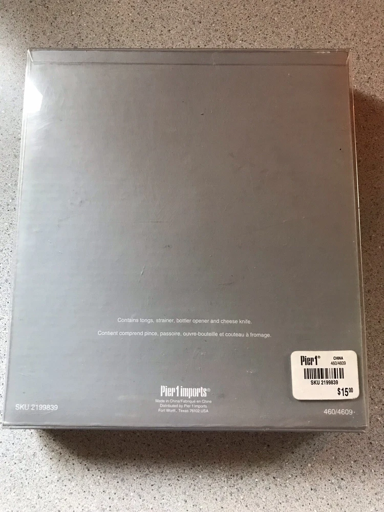 | Set Includes | Strainer, Tongs, Bottle Opener, Cheese Knife |